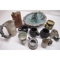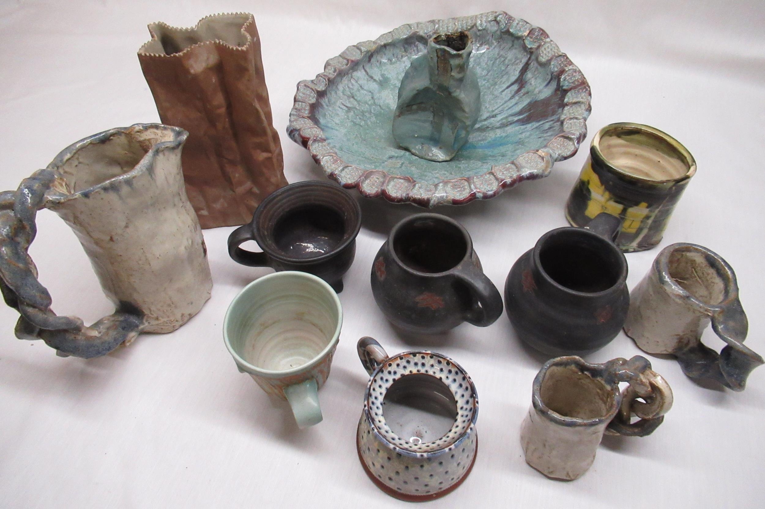 Glazed earthenware art pottery fruit bowl D34cm, glazed earthenware art pottery vase with plaited handle H19cm and collection of other art pottery including earthenware vase in form of paper bag with impressed mark to base