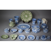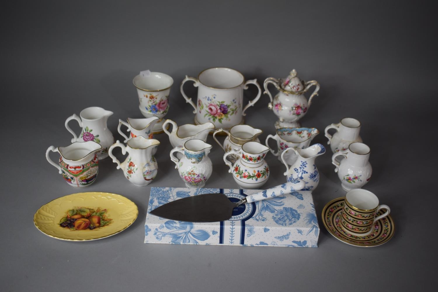A Collection of Various Royal Worcester Reproduction Miniature Jugs (Some with Certificates), together with a Portmeirion Botanic Cake Slice, Lidded Coalport Floral Pattern Two Handled Urn (Lid AF), Two Handled Floral Pattern Loving Mug, Wedgwood Clio Pattern Coffee Can and Saucer, Aynsley Orchard Gold Oval Dish Etc