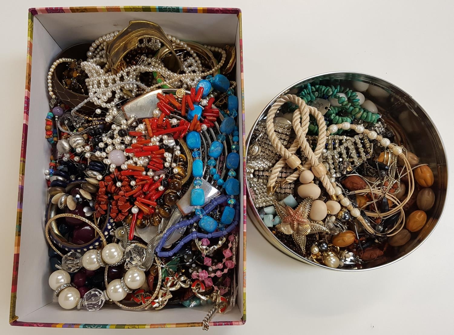 including various bead necklaces such as turquoise and coral, simulated pearl necklaces, bangles, bracelets, earrings, necklaces, brooches, etc., 2 boxes