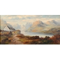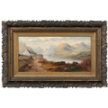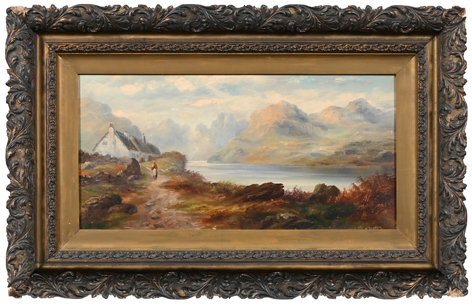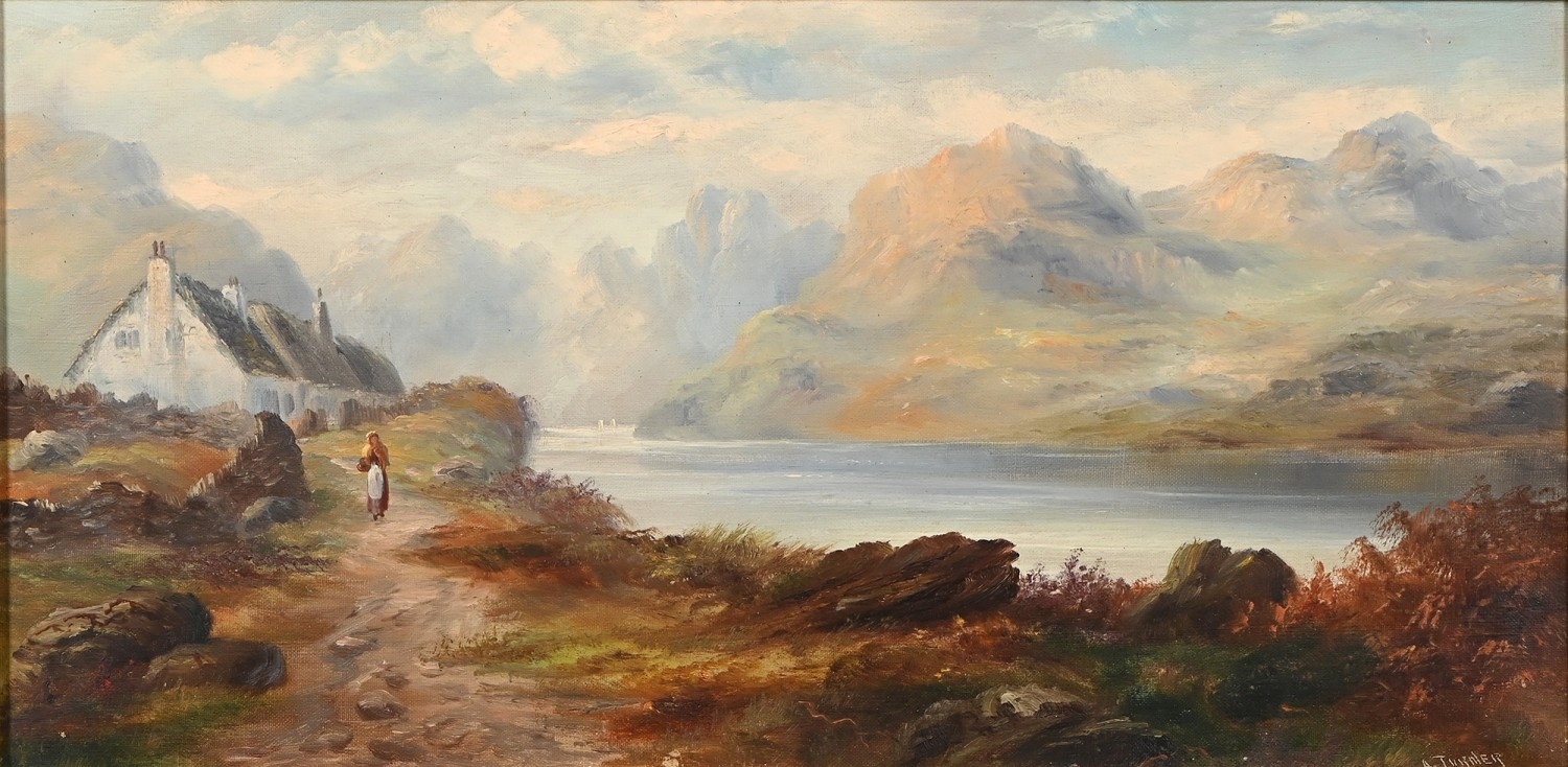 A. Turner, 19th century - Crofters' Cottages by a Highland Loch, signed, oil on canvas, 30.5 x 61cm
