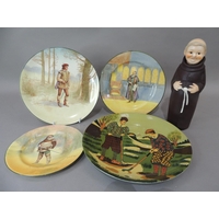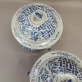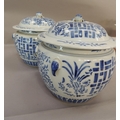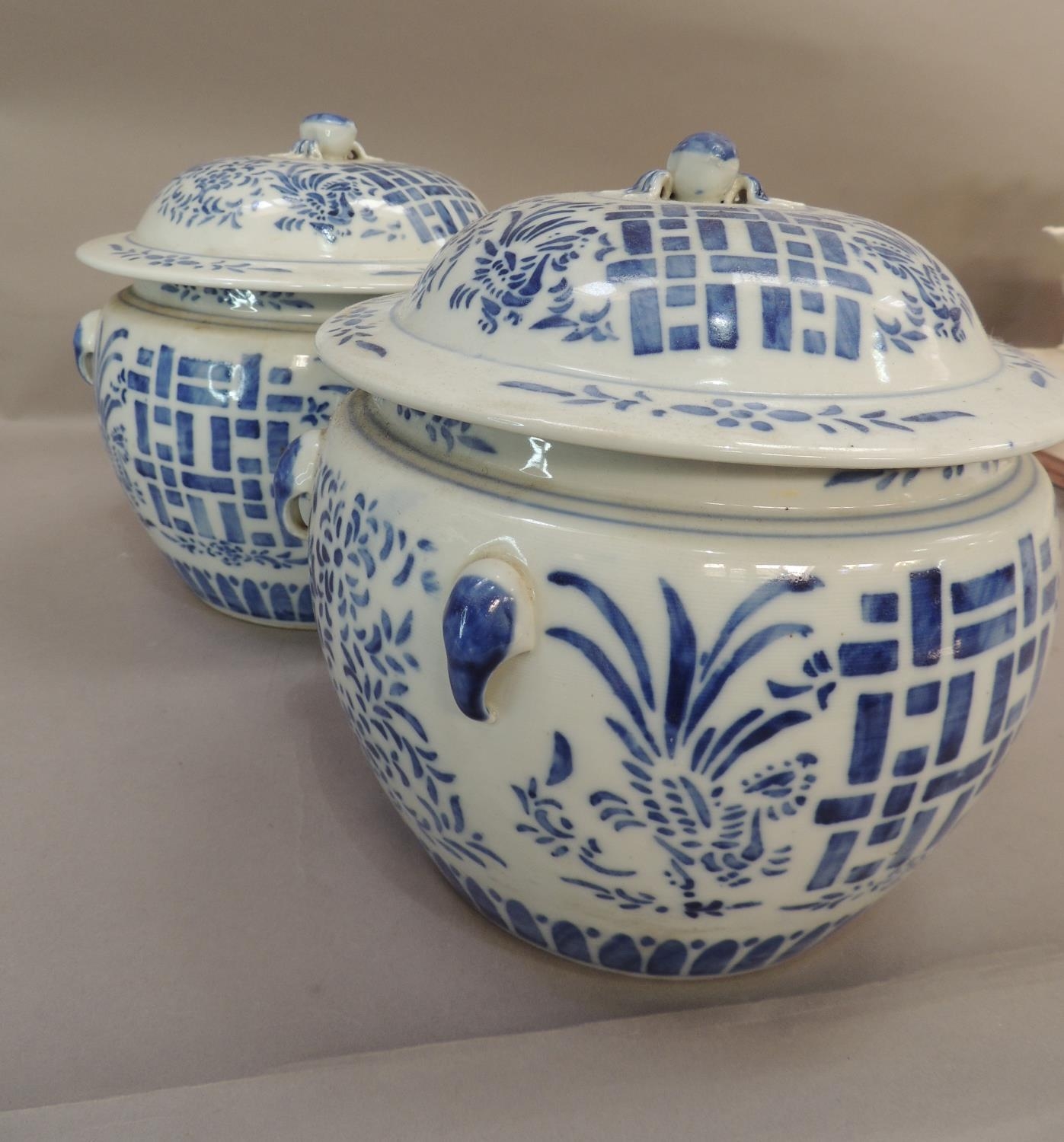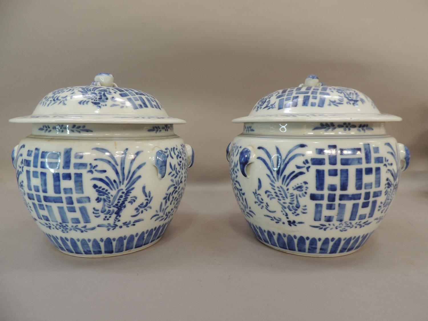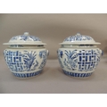 A pair of Chinese blue and white jars and covers decorated with geometric panels with stylised flower heads and foliage, the domed covers conforming with 'fruit' finials, 21cm high