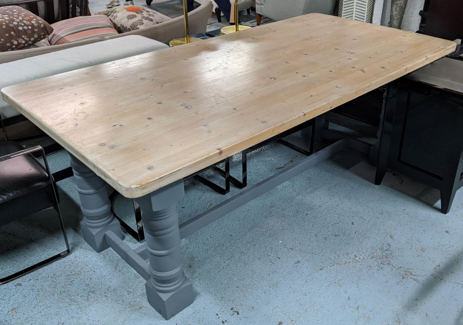 FARMHOUSE DINING TABLE, 198 x 99cm x 78cm, pine top on grey painted base.
