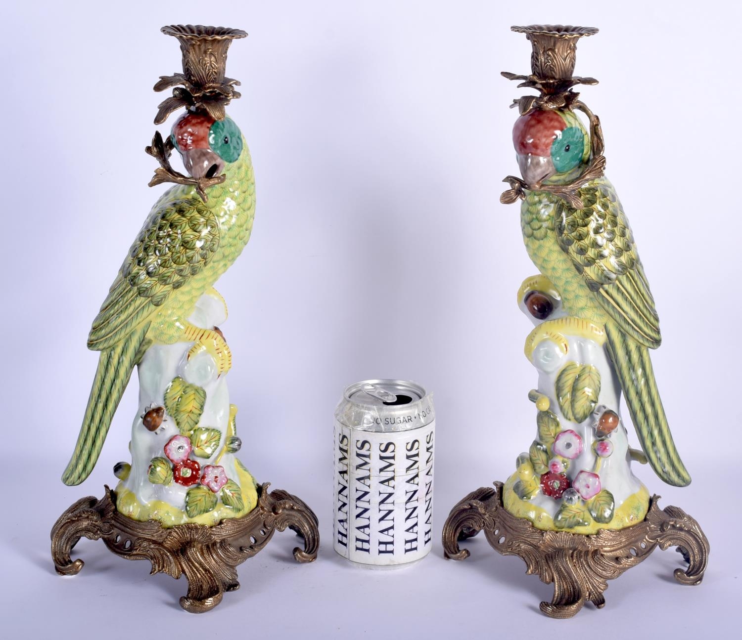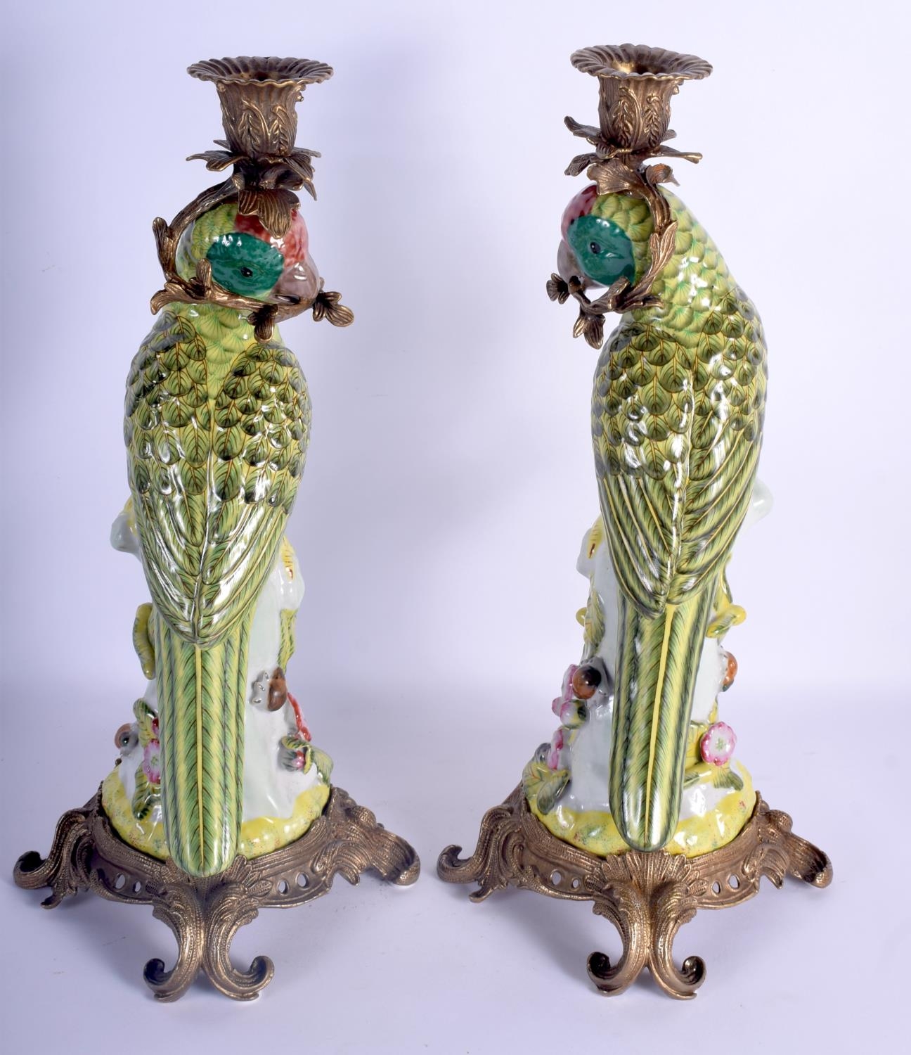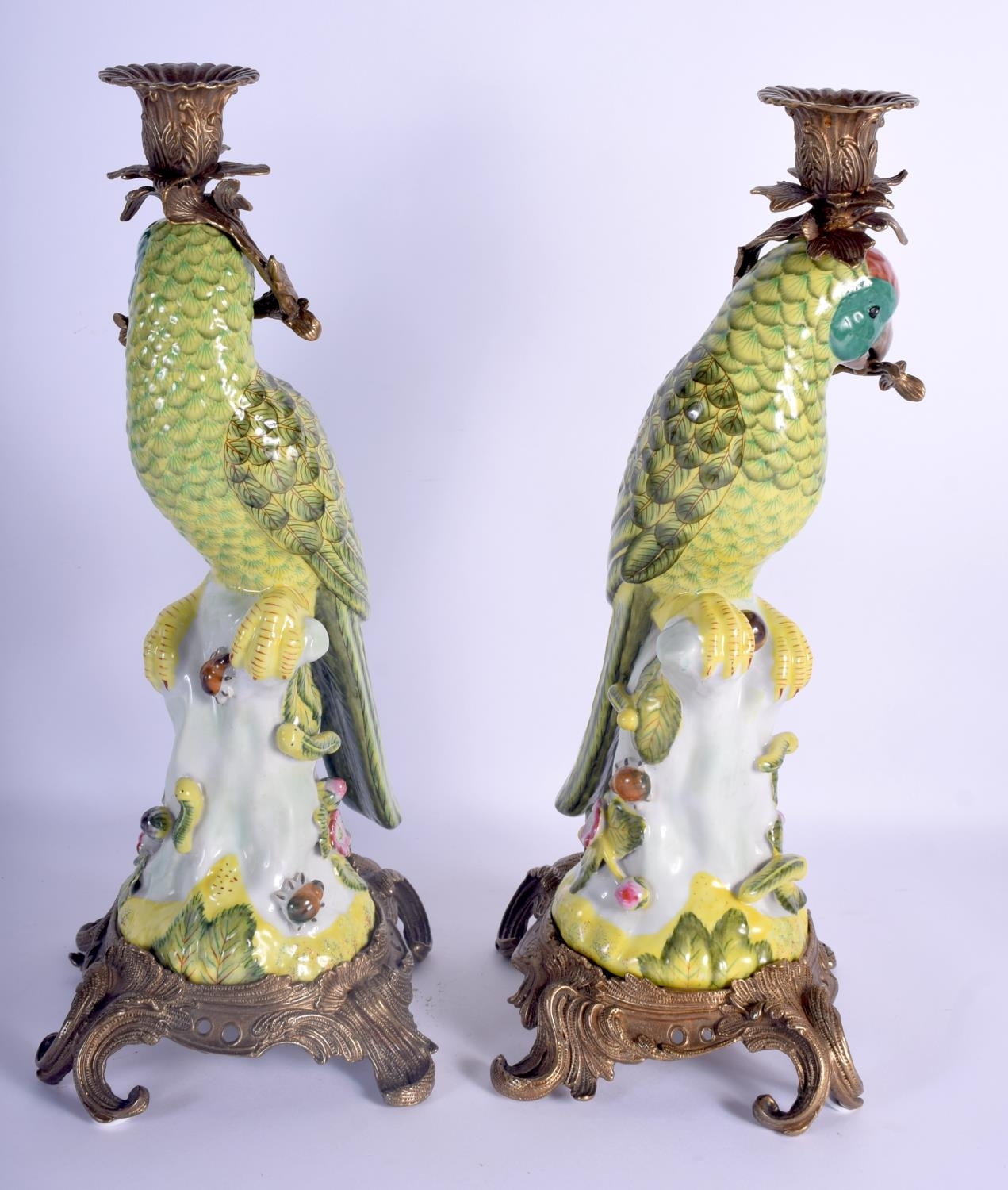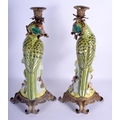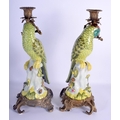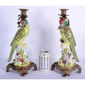 A LARGE PAIR OF CONTEMPORARY PARROT GILT METAL CANDLESTICKS. 36 cm high.