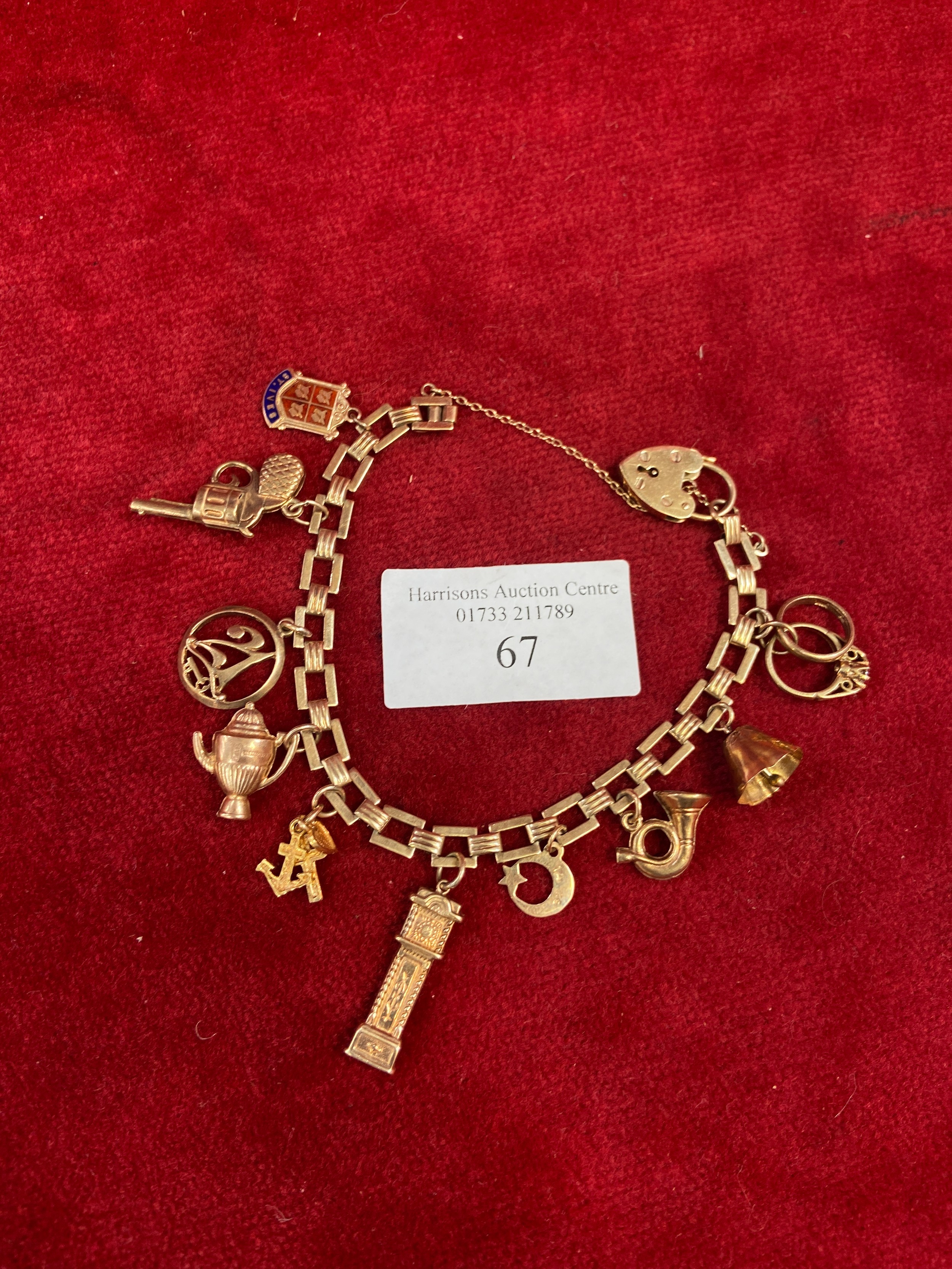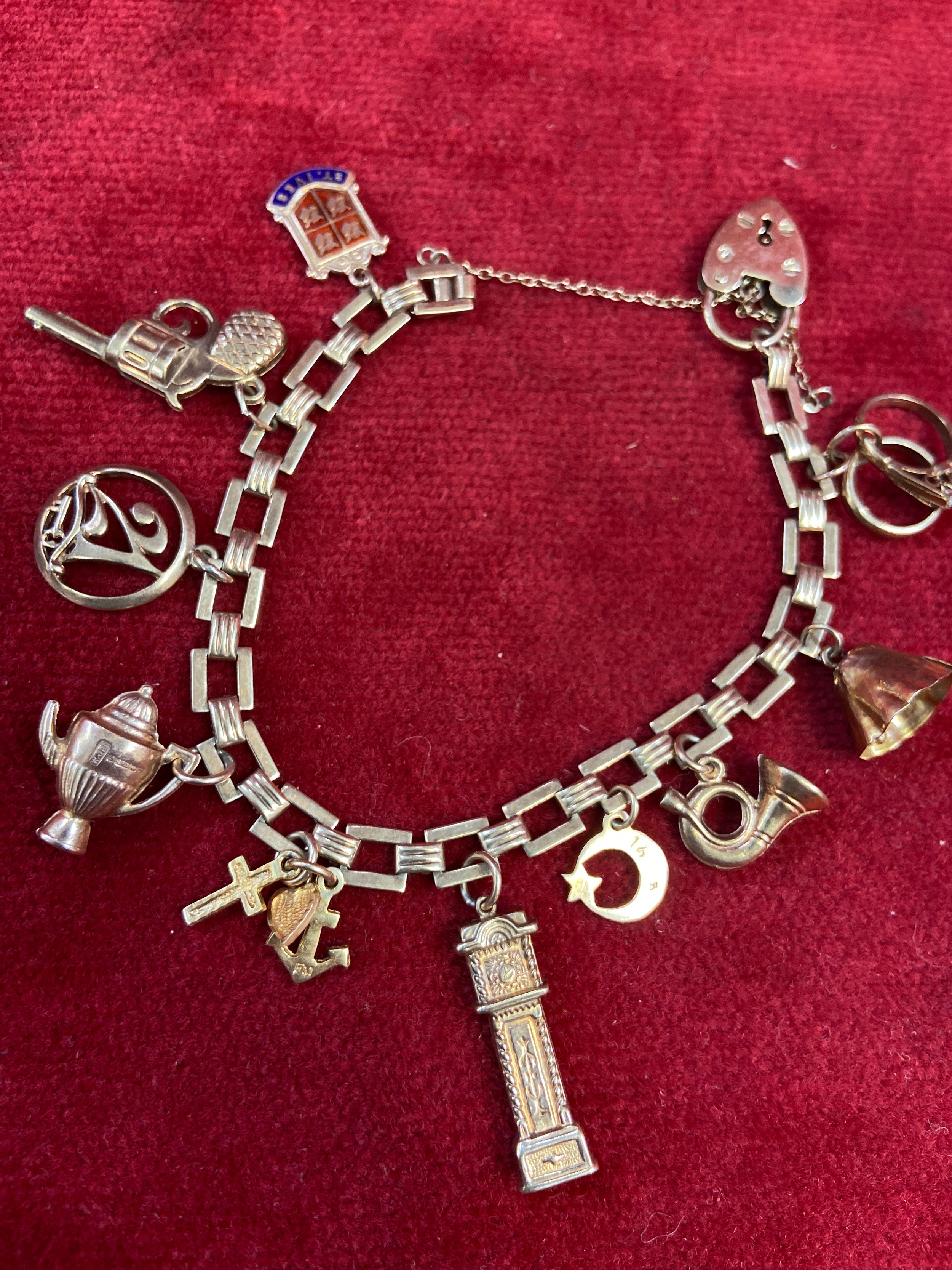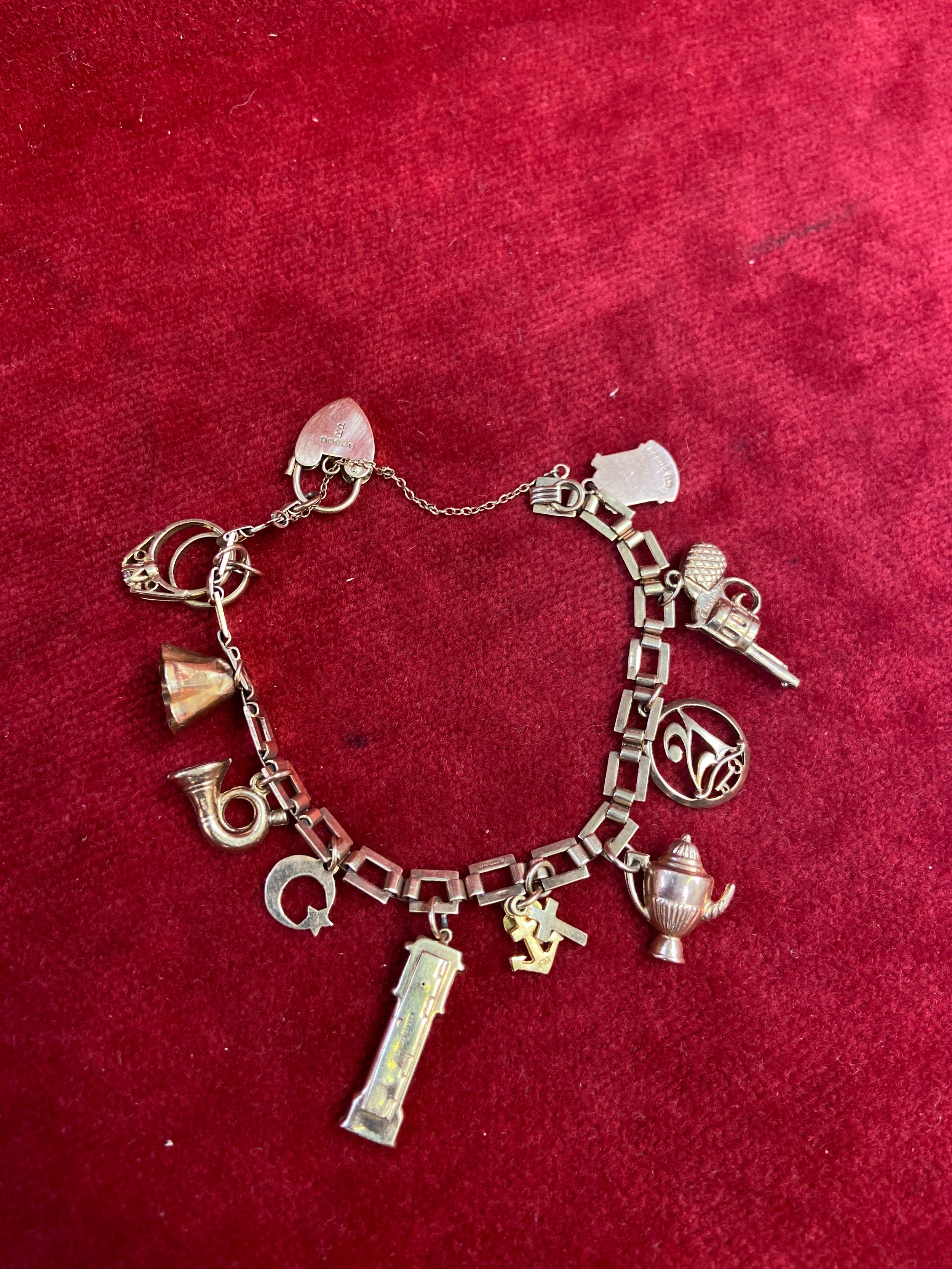A vintage 9ct gold charm bracelet with square chain links, heart padlock clasp and 10 charms (pistol, bugle, St Ives crest etc) - all English hallmarks. 16 grams
