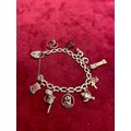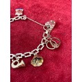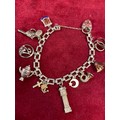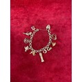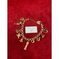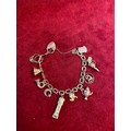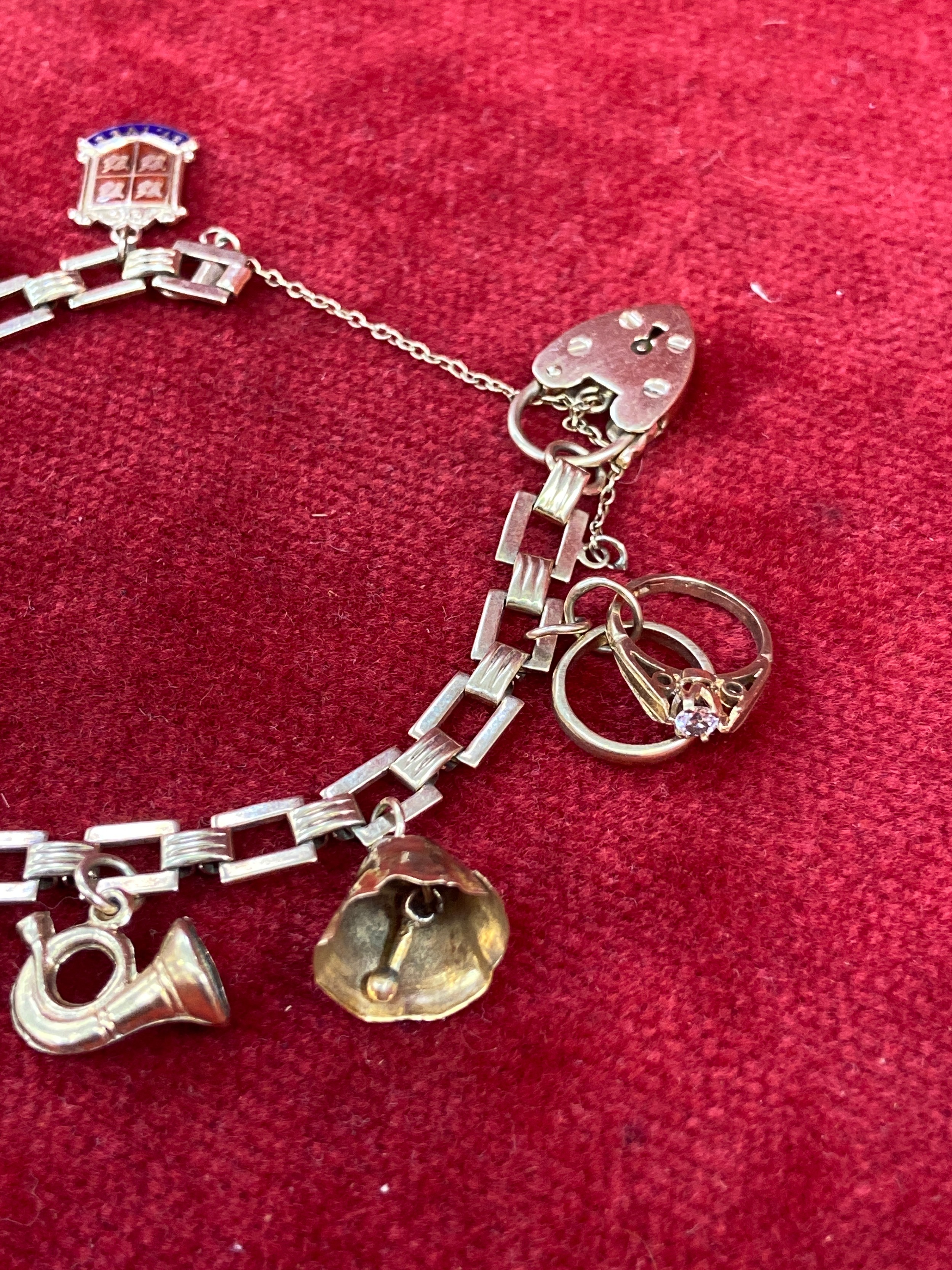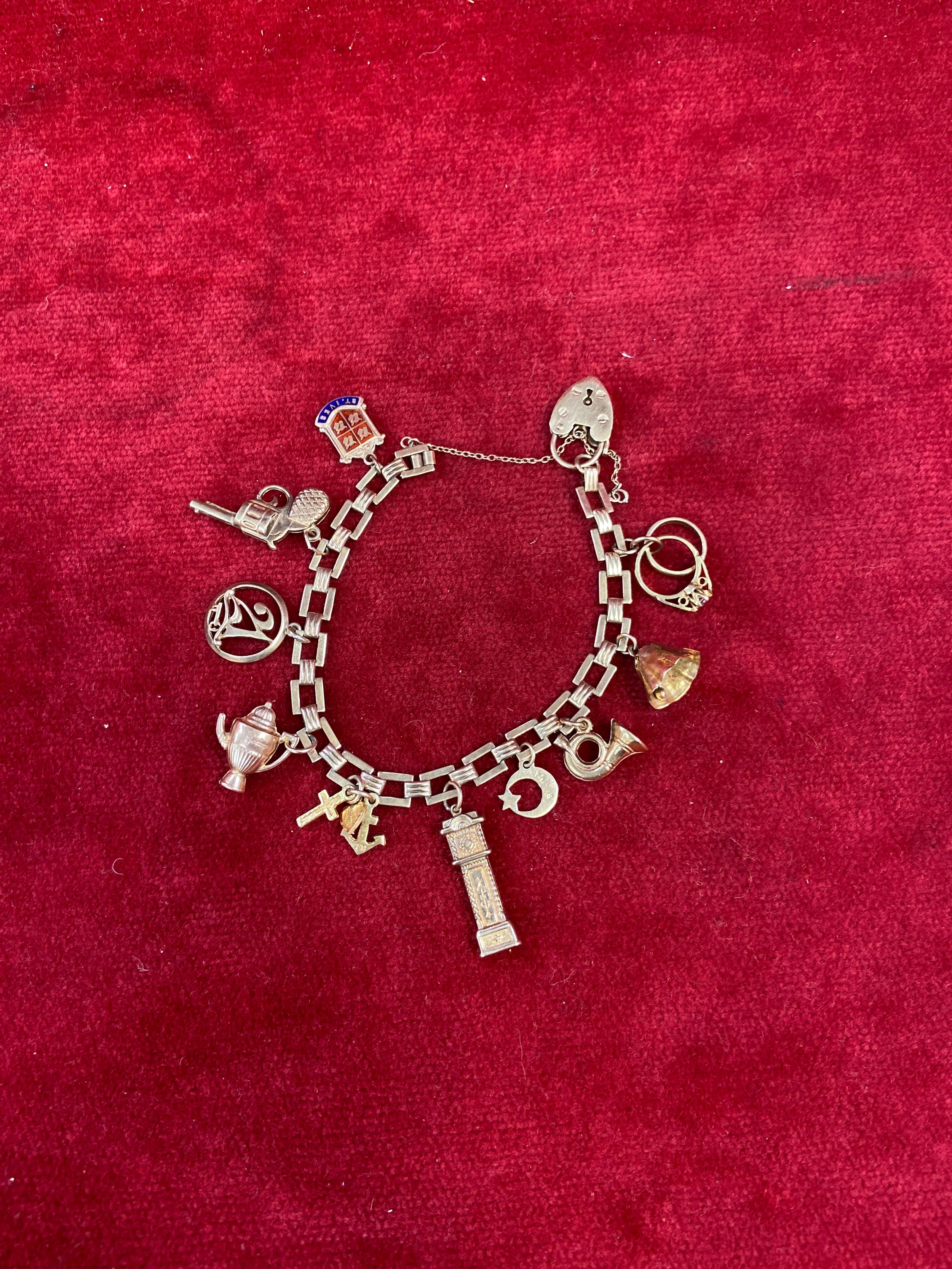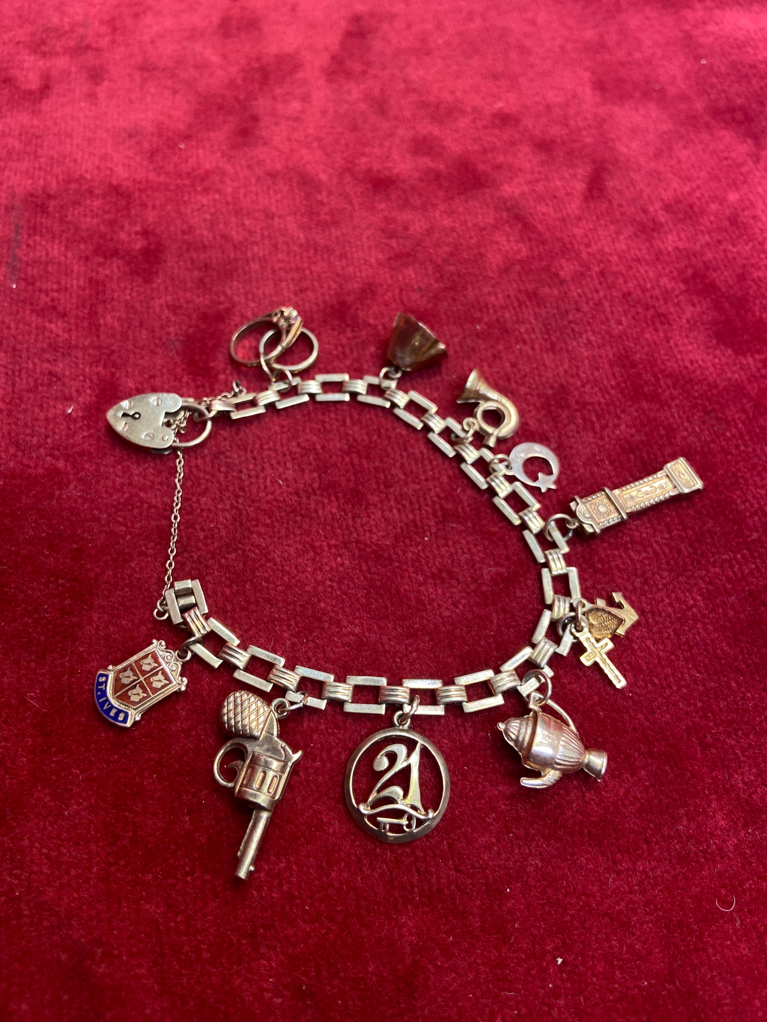 A vintage 9ct gold charm bracelet with square chain links, heart padlock clasp and 10 charms (pistol, bugle, St Ives crest etc) - all English hallmarks. 16 grams