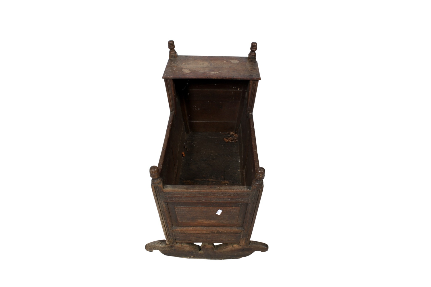 A vintage oak baby crib. The tapered panelled sides topped with turned finials, raised on rockers, H72cm x W91cm x D56cm.
