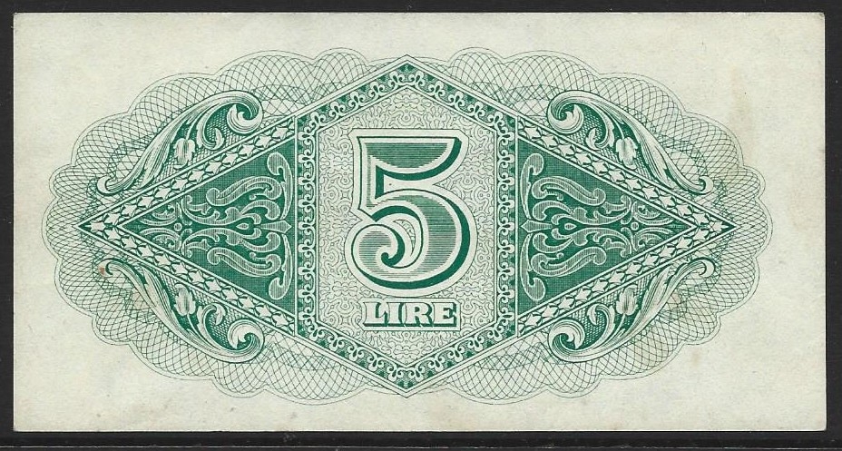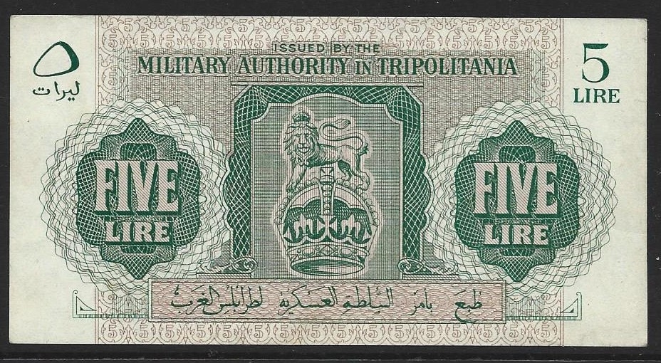 BANKNOTE. Libya, British Military Authority in Tripolitania, 5 Lire, ND(1943), P-3a, EF