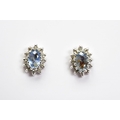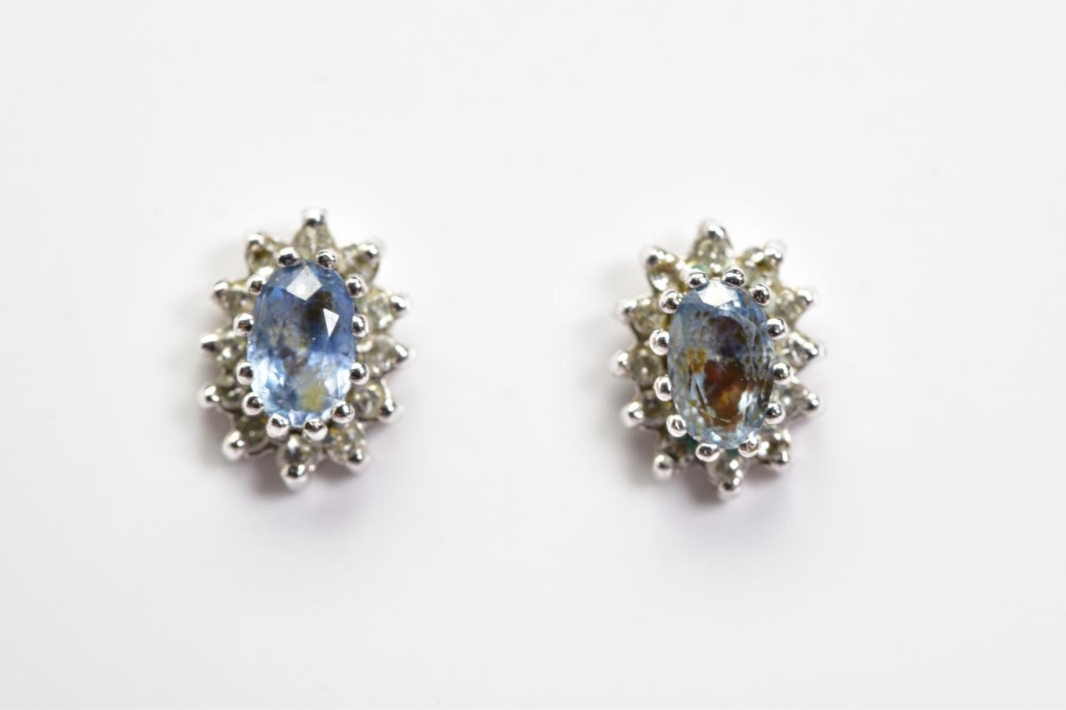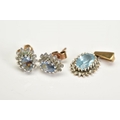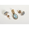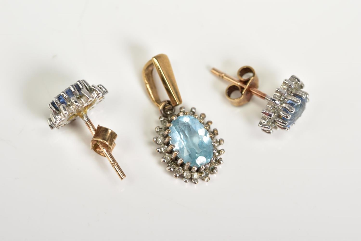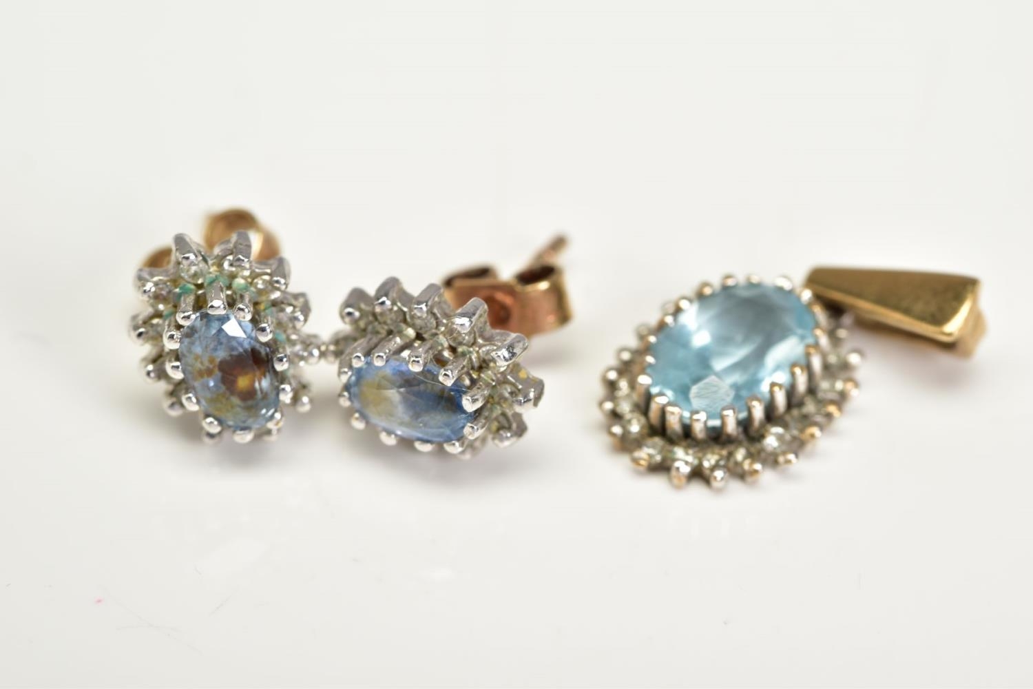 A PAIR OF TOPAZ EARRINGS AND MATCHING PENDANT, each earring designed with an oval cut blue topaz within a round brilliant cut diamond surround, to the post and scroll fittings, together with a matching pendant suspended from a plain polished bail, hallmarked 9ct gold Birmingham, approximate gross weight 2.2 grams