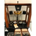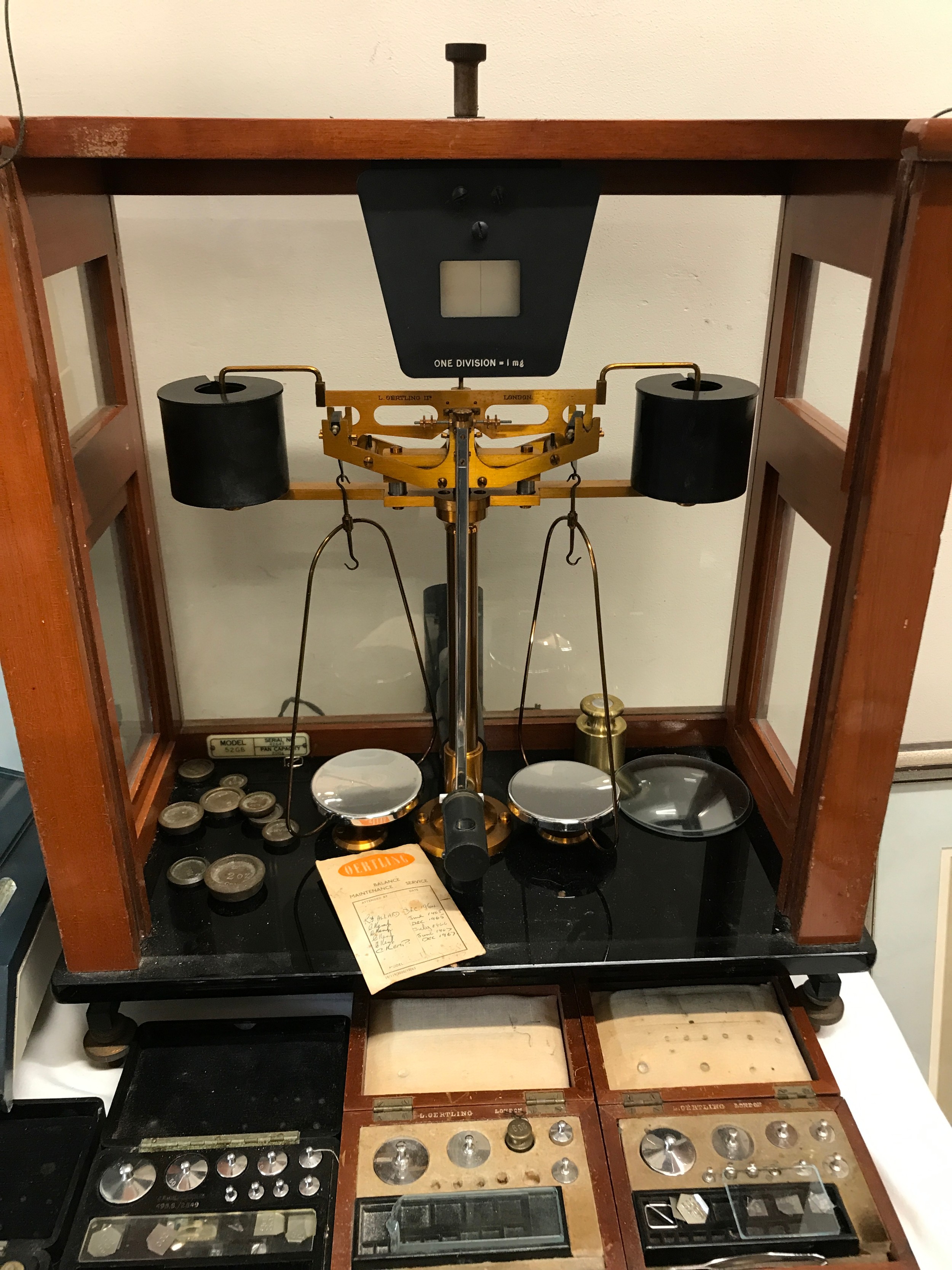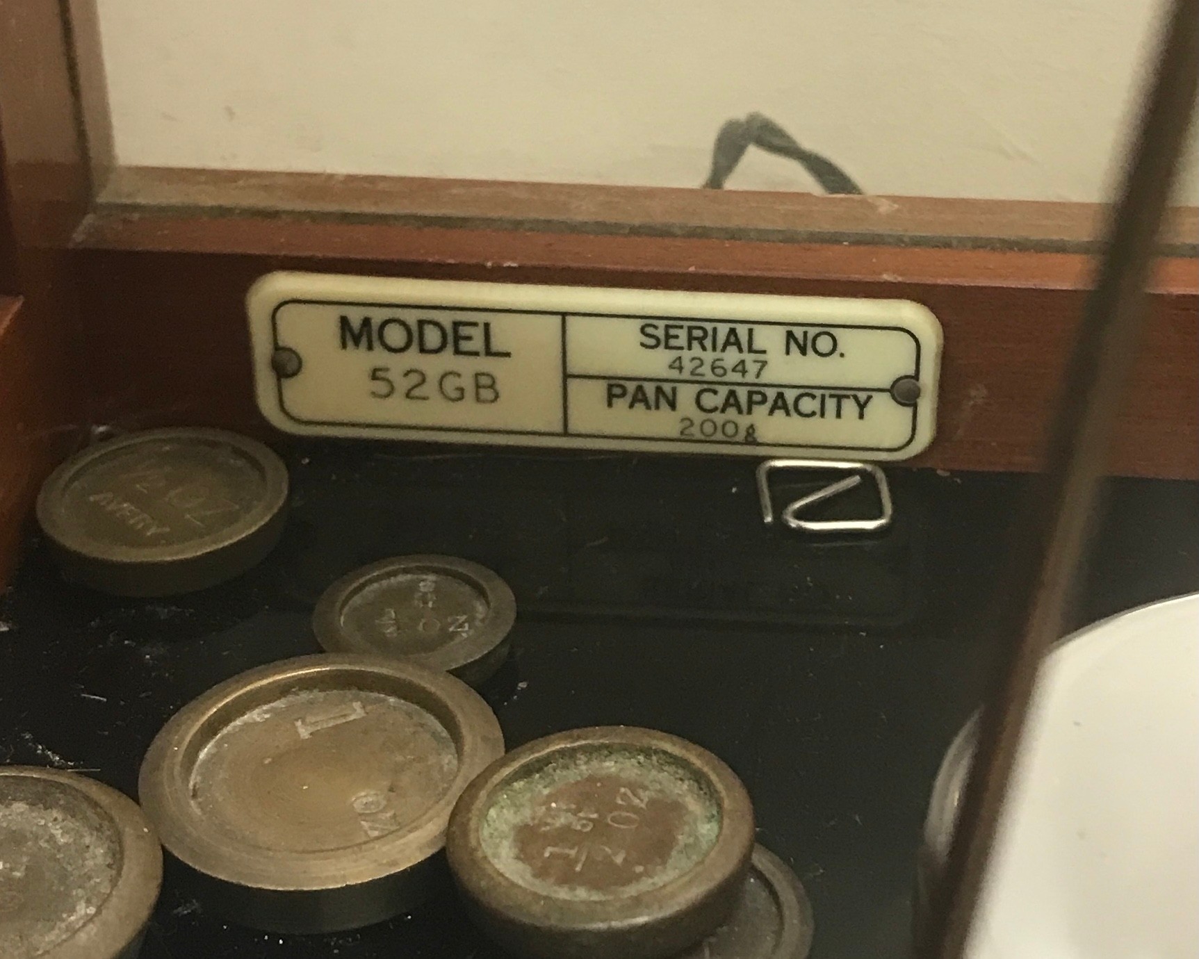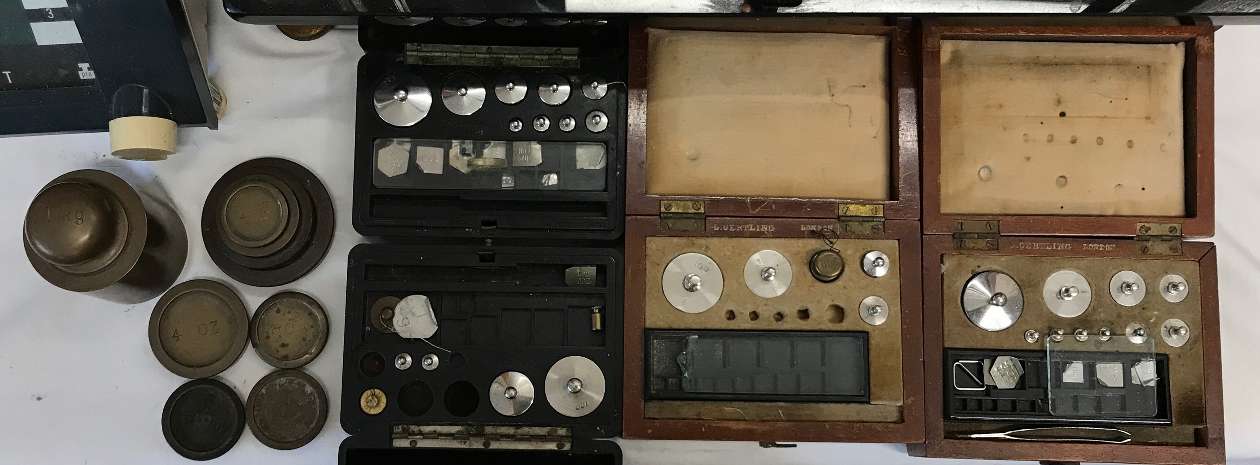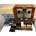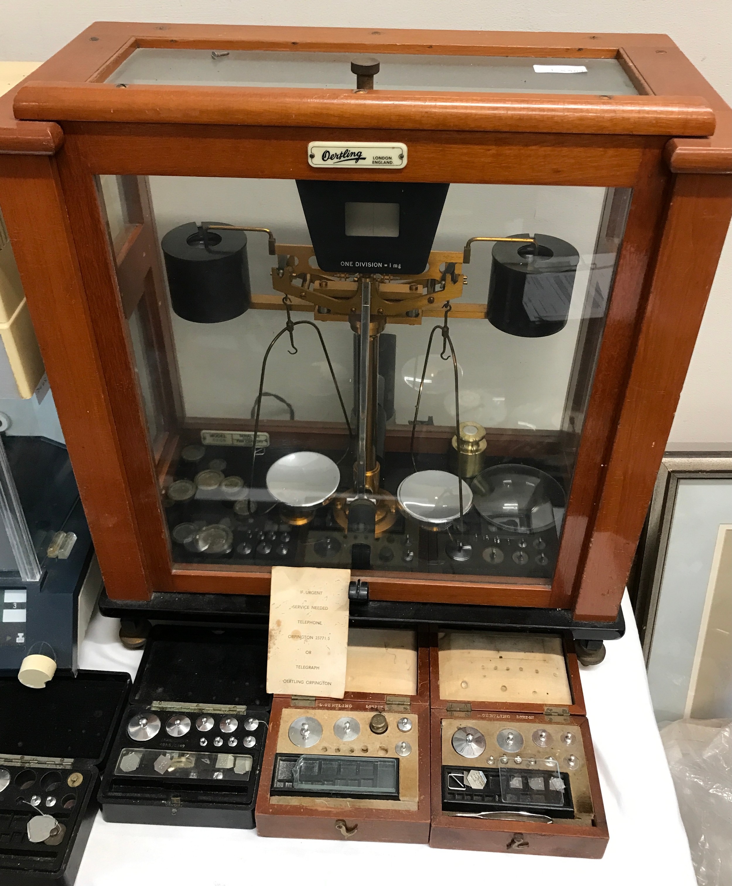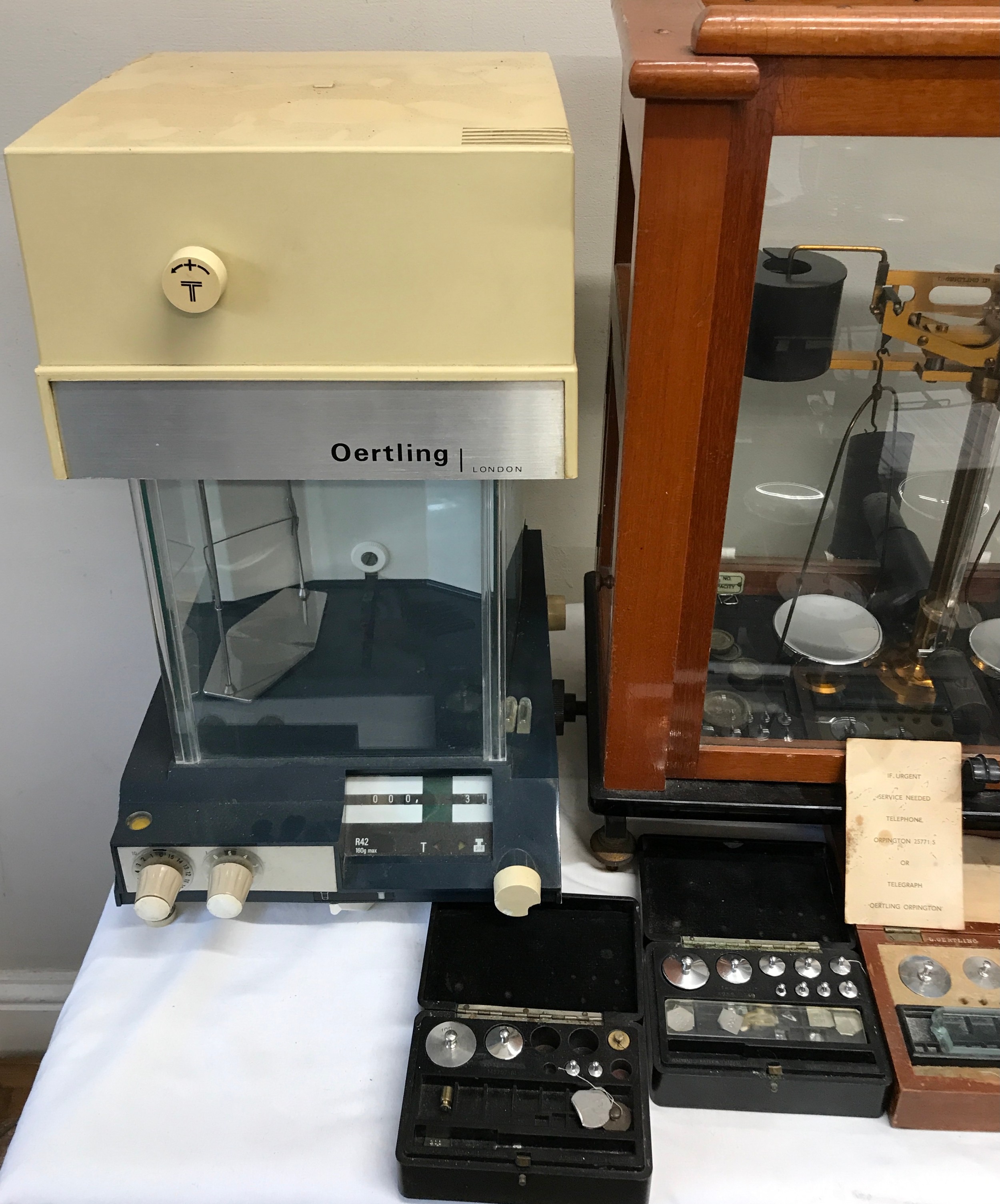 Oertling R42 precision balance scales and Oertling vintage measuring scales, model number 52GB with Oertling and Griffin and Tatlock weights.