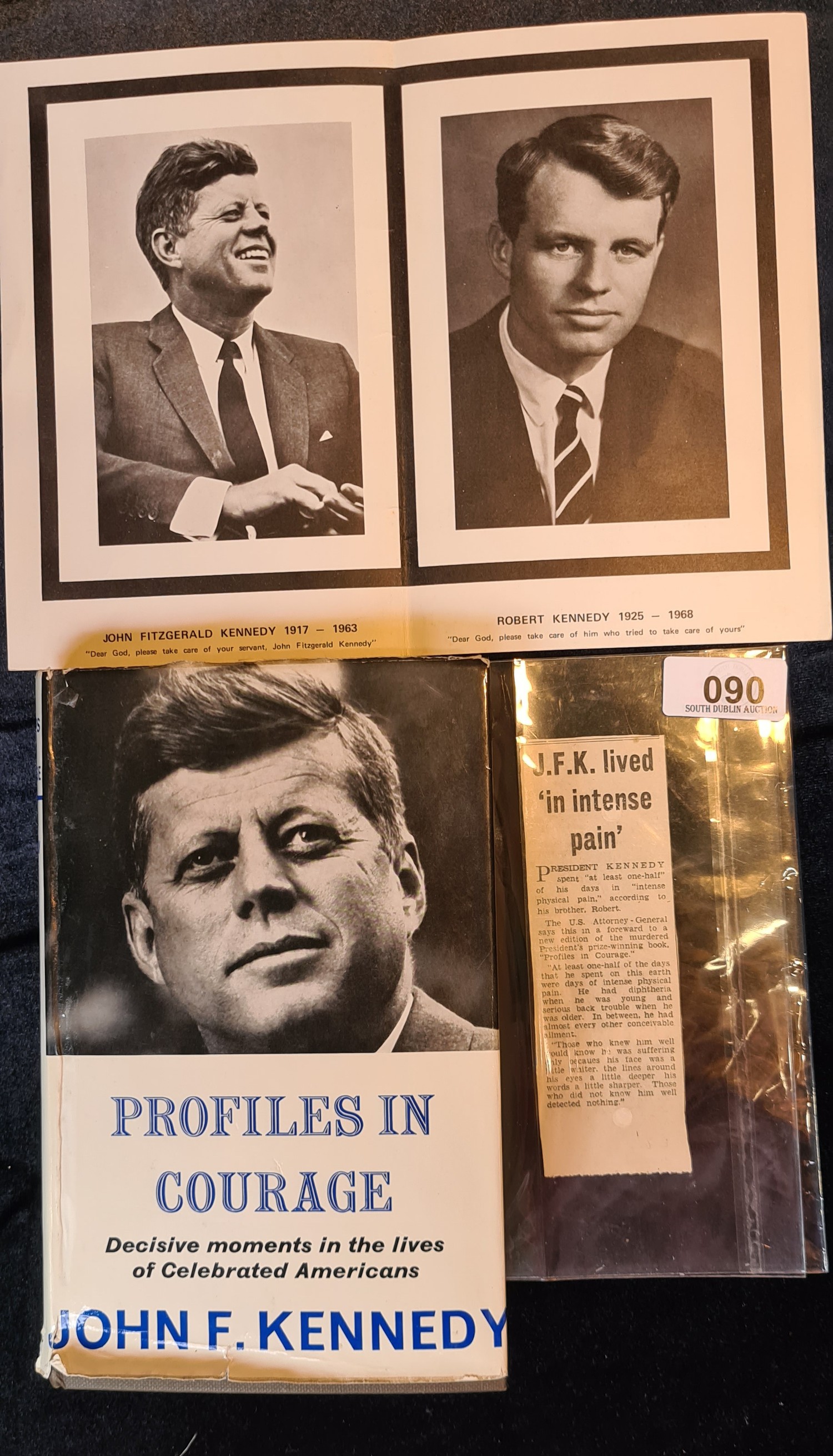 Original John F Kennedy and Robert Kennedy memorial card. Inc book and news paper cutting.