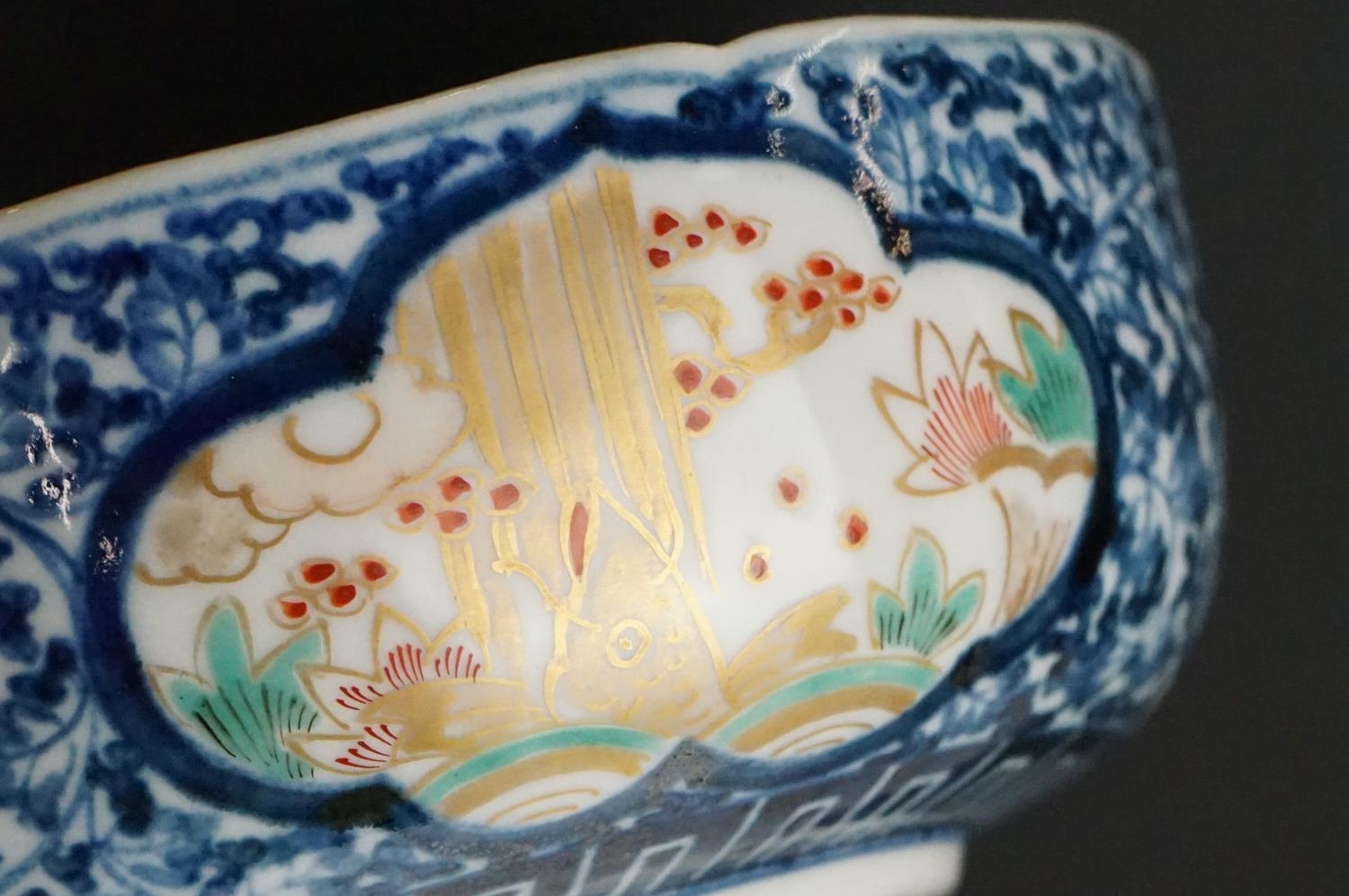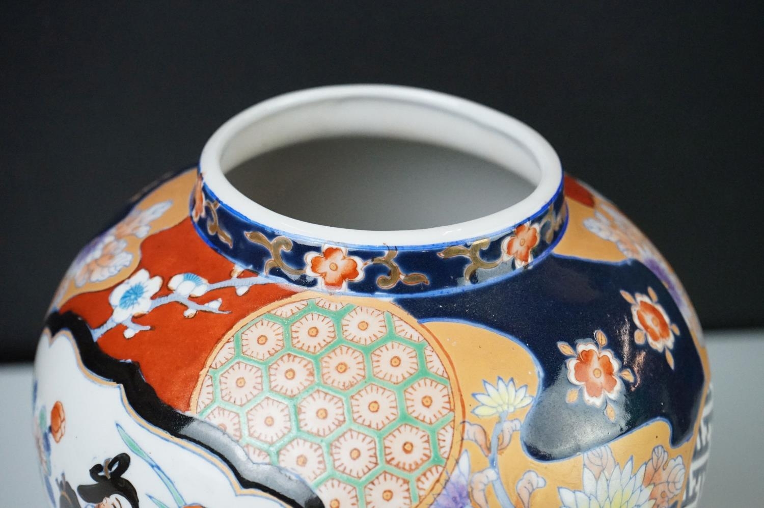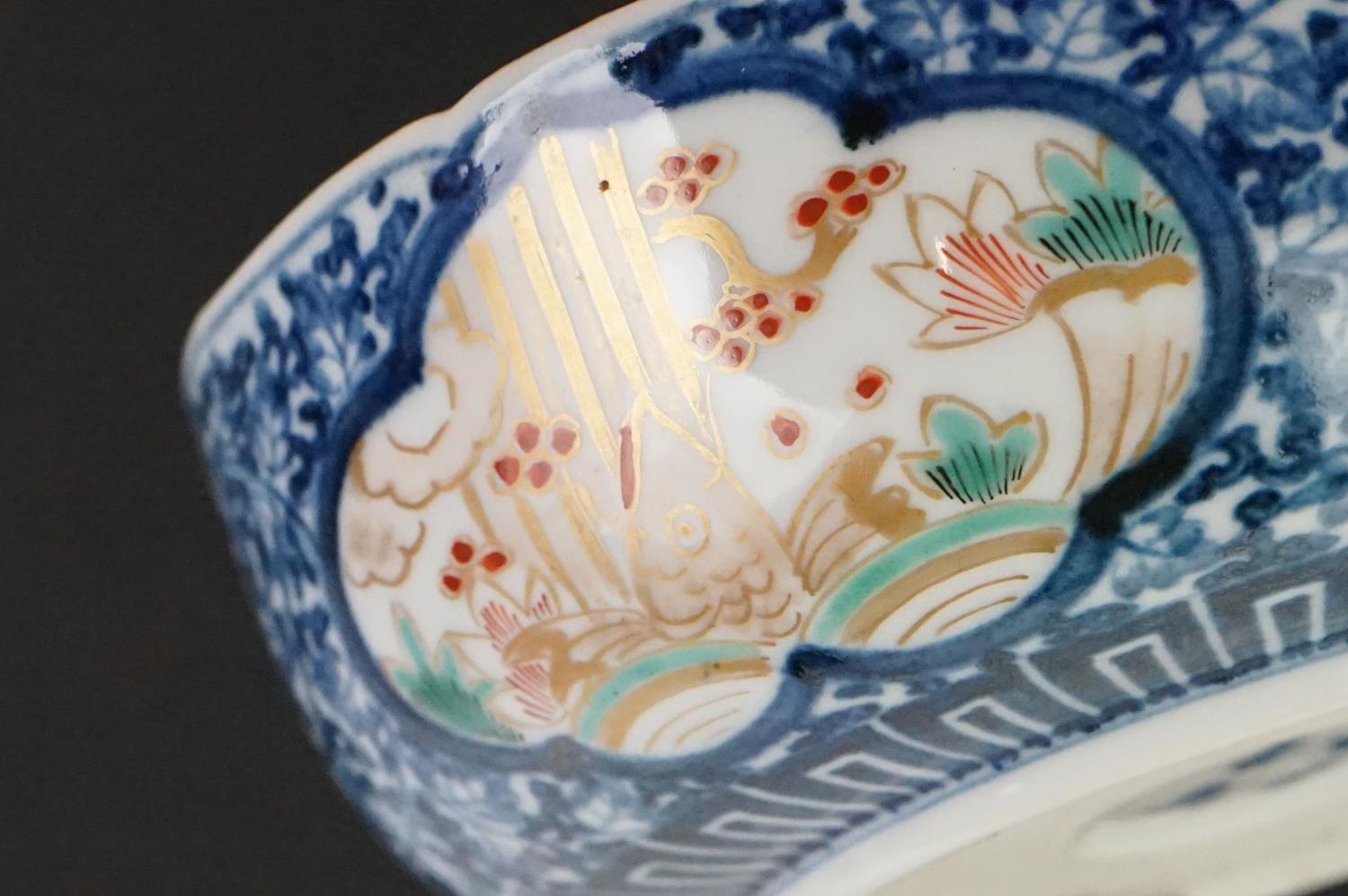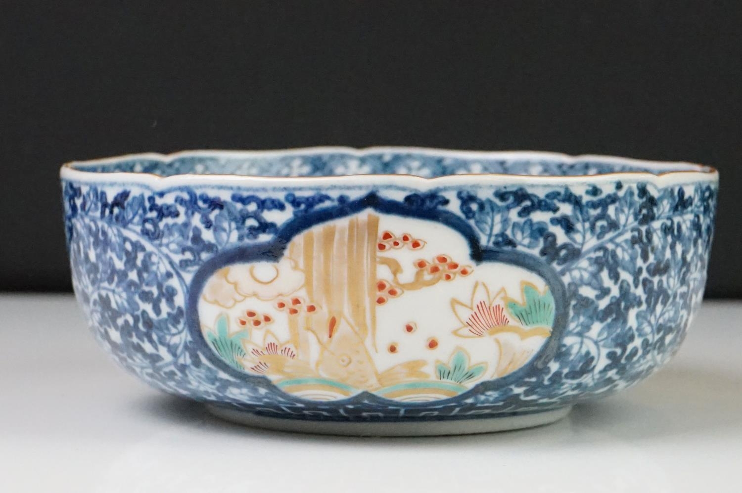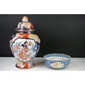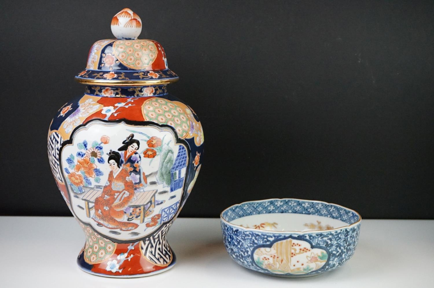 19th century Japanese Arita Ware Bowl decorated with panels of fish within a river, four character marks to base, 16cm diameter together with a 20th century Japanese Ceramic Jar and Cover, 31cm high