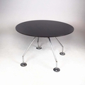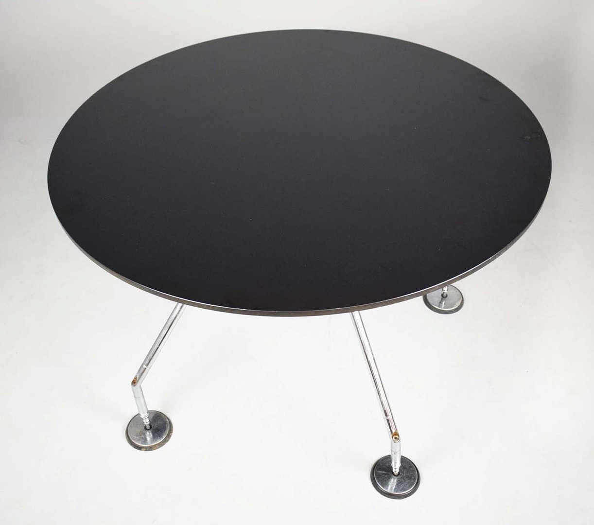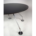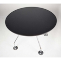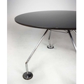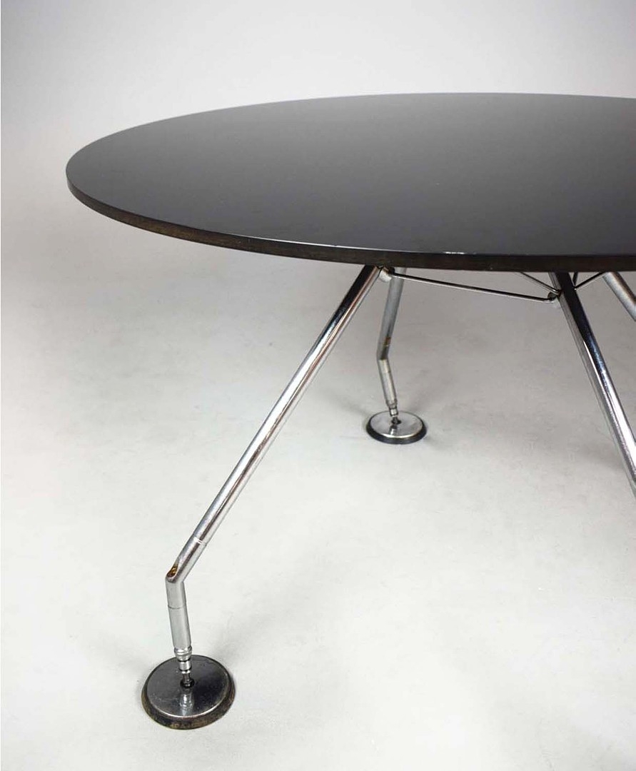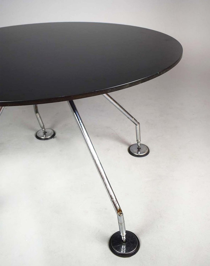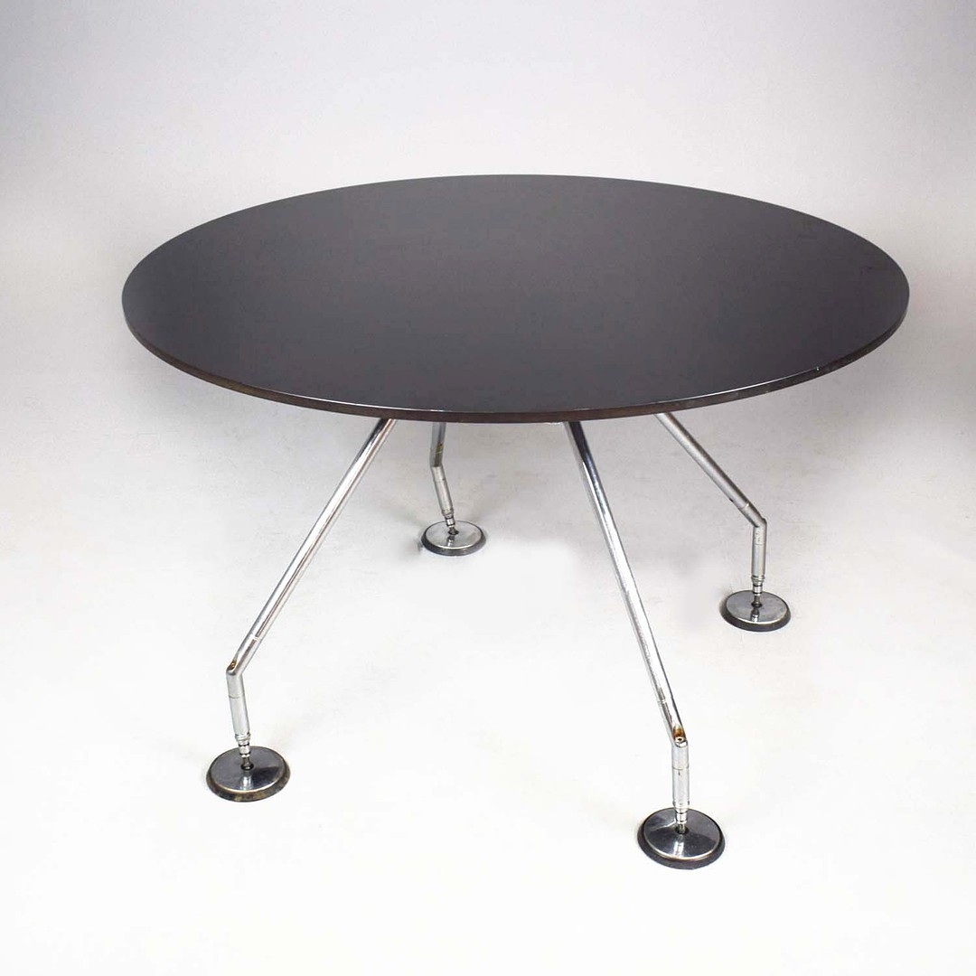 NORMAN FOSTER. TECNO NOMOS TABLE. by Norman Foster, with a dark wood round top on a splayed leg chromed steel base marked Tecno. 121cm rd x 75cm h.