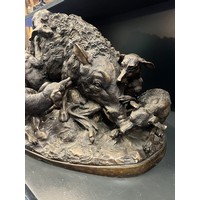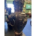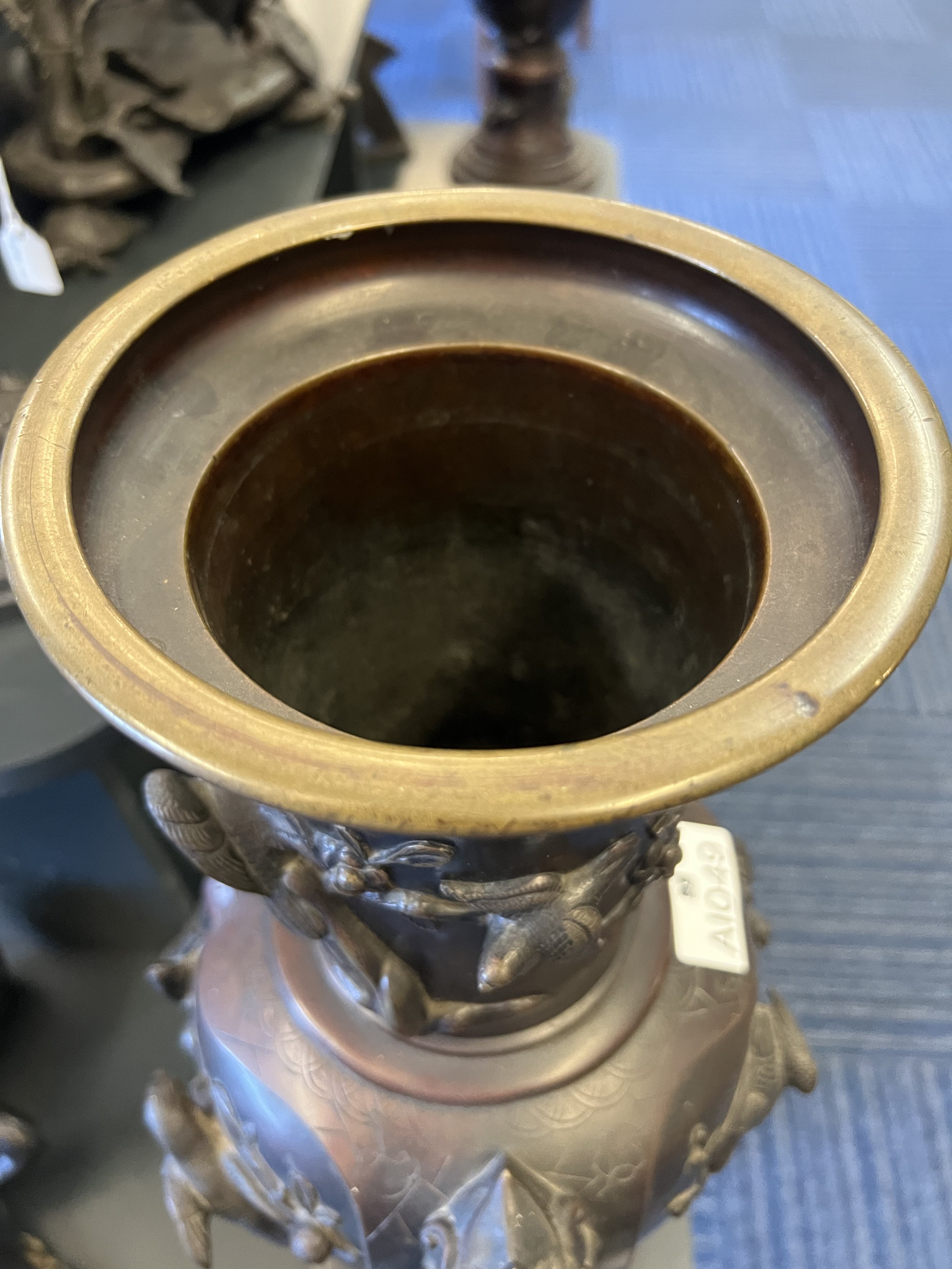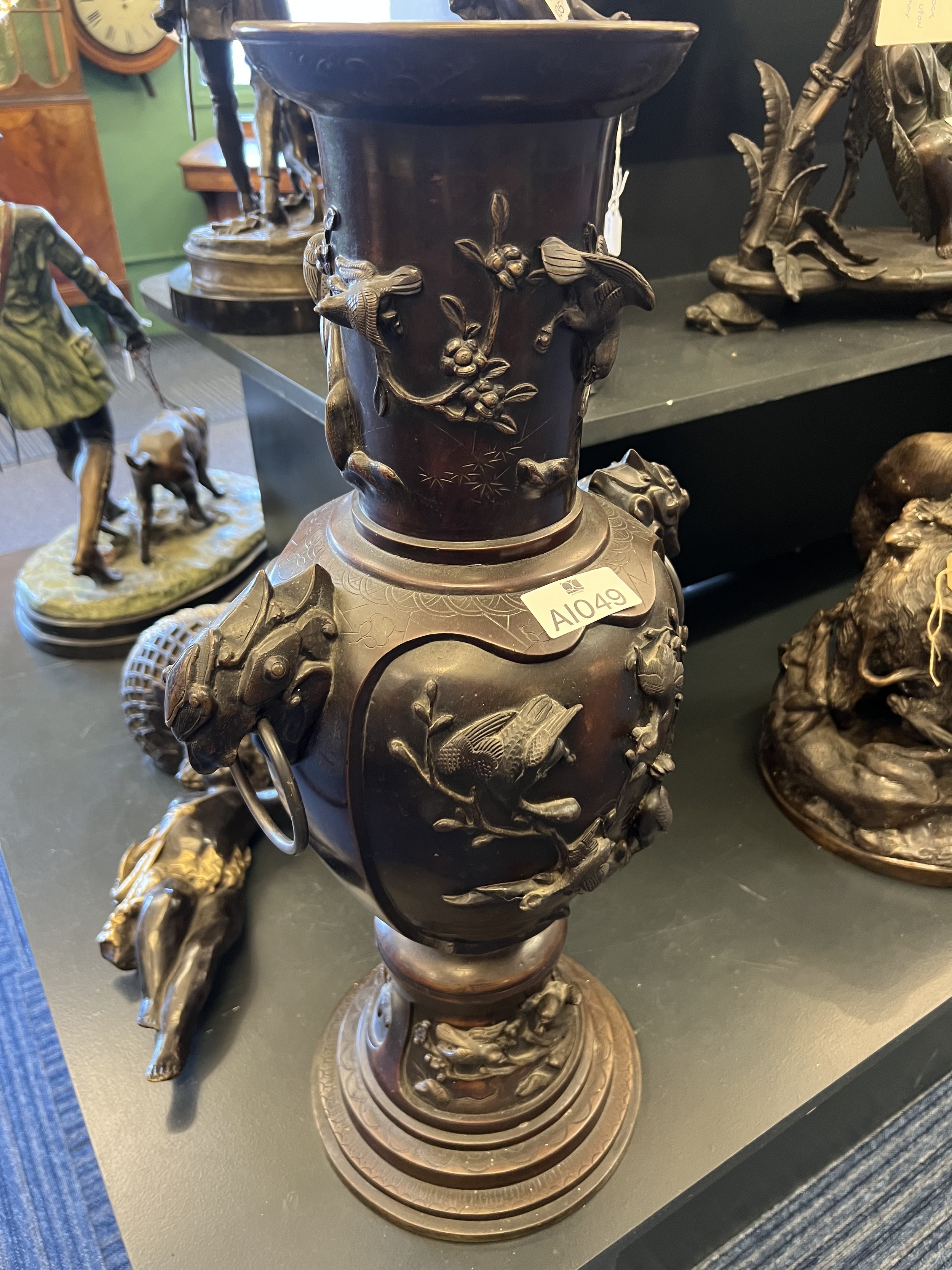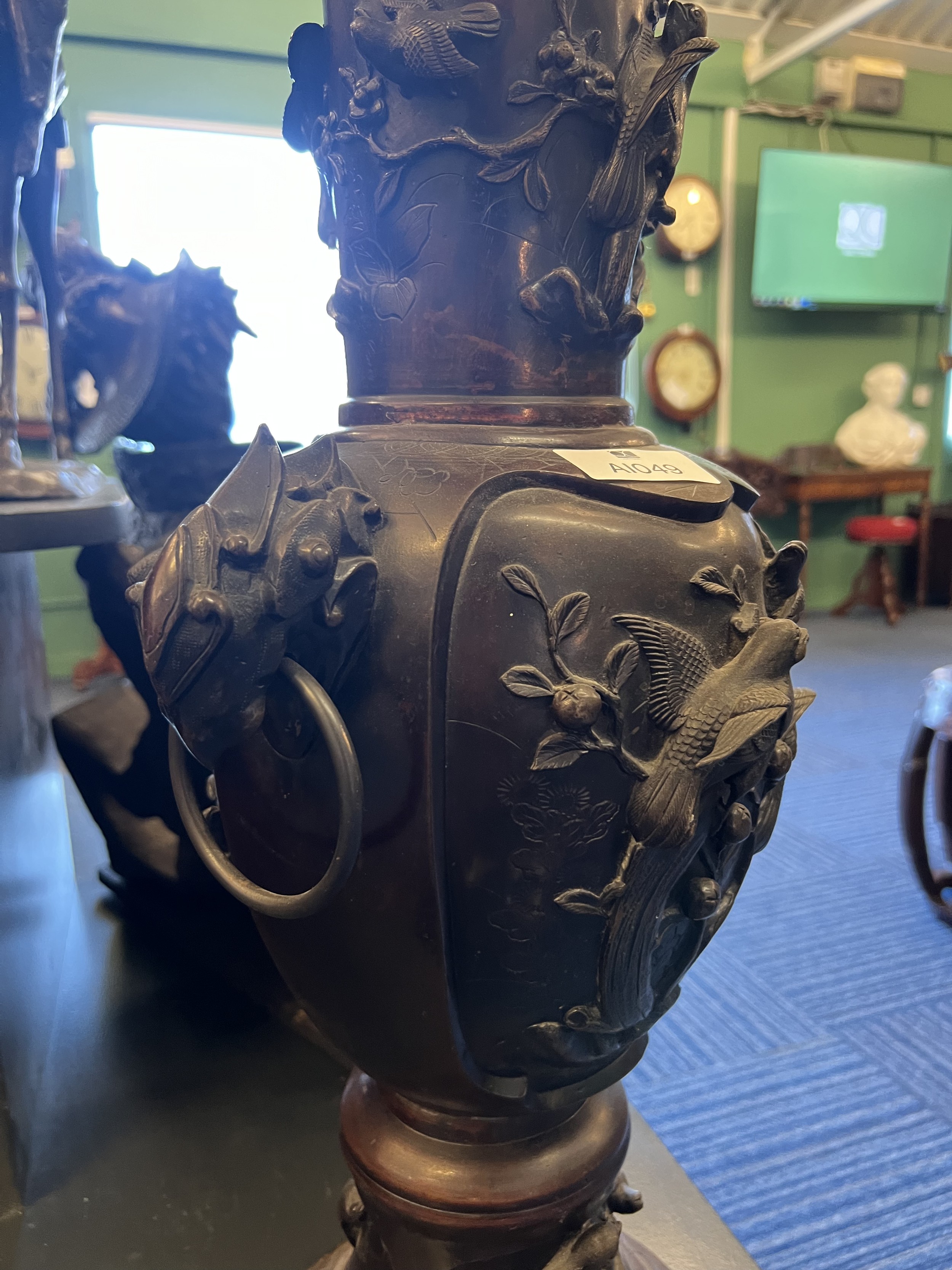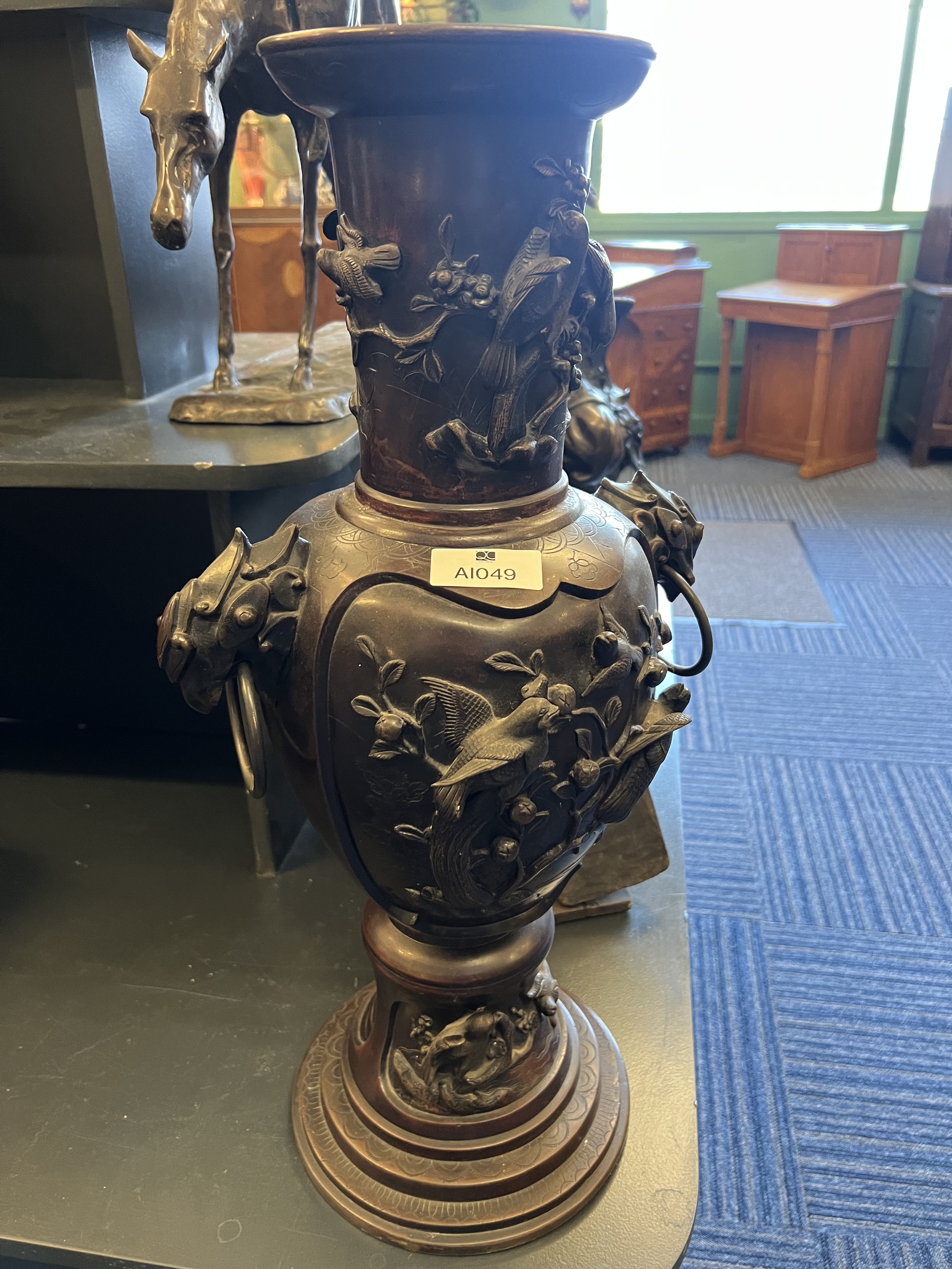 Pair of 19th century, quality cast vases with bird castings with ringed handles hgt 25"