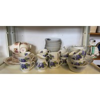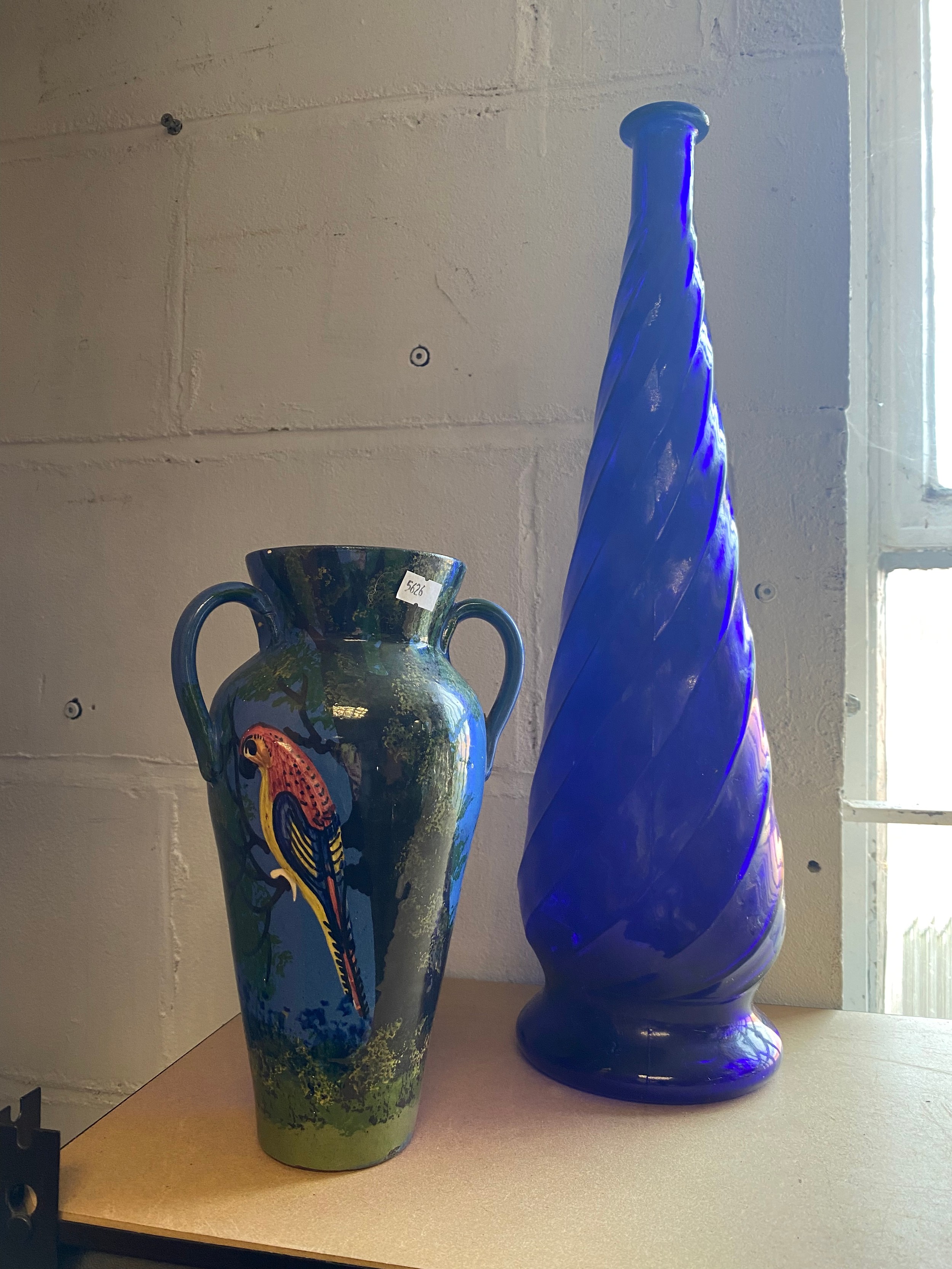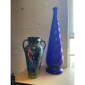 A blue glass 'genie' style bottle and a Torquayware three handled vase -