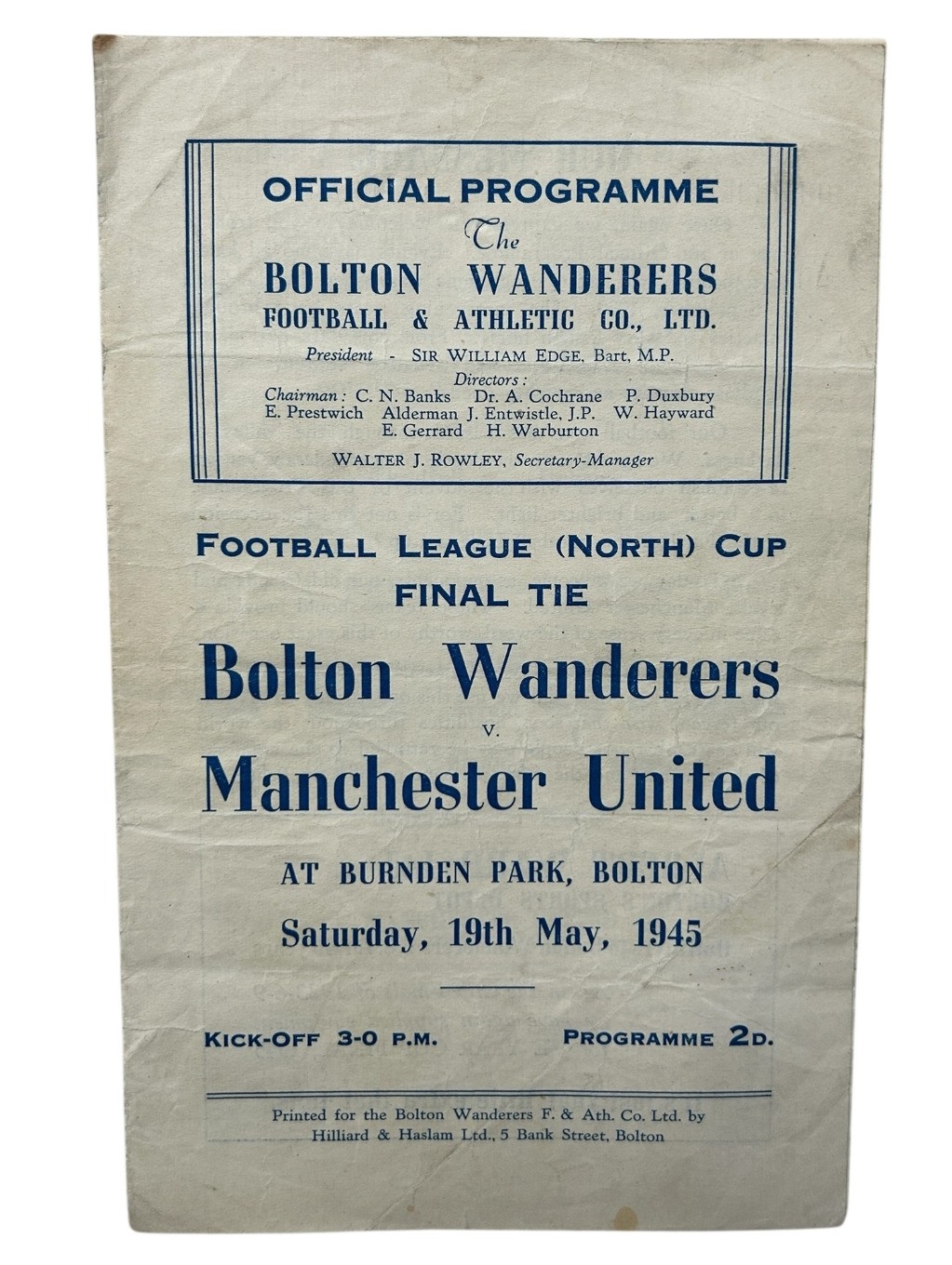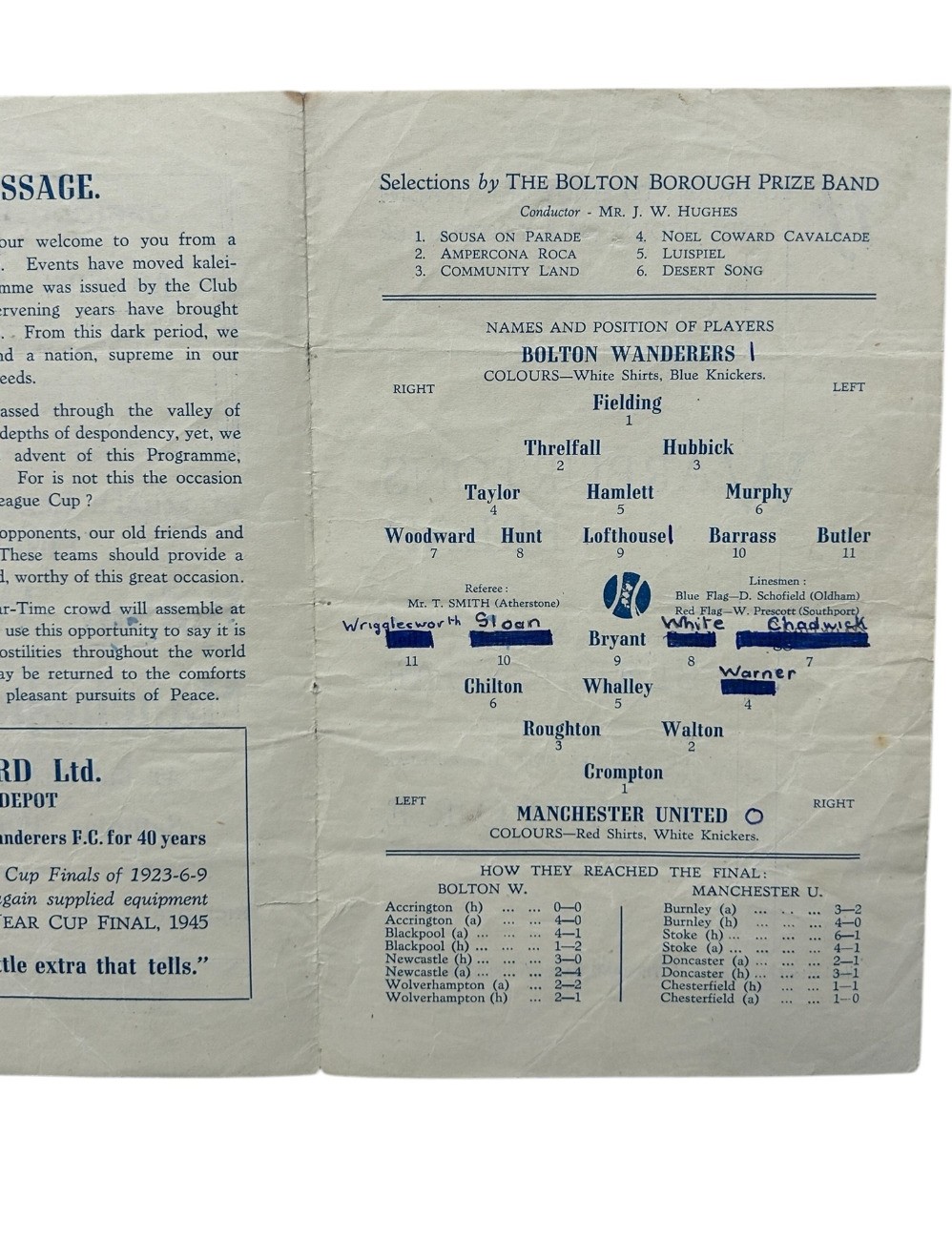 MANCHESTER UNITED AWAY VERSUS BOLTON WANDERERS 1944/45 FOOTBALL PROGRAMME, 19/05/1945, 4-PAGE ISSUE. CREASING, LINE-UP CHANGES.