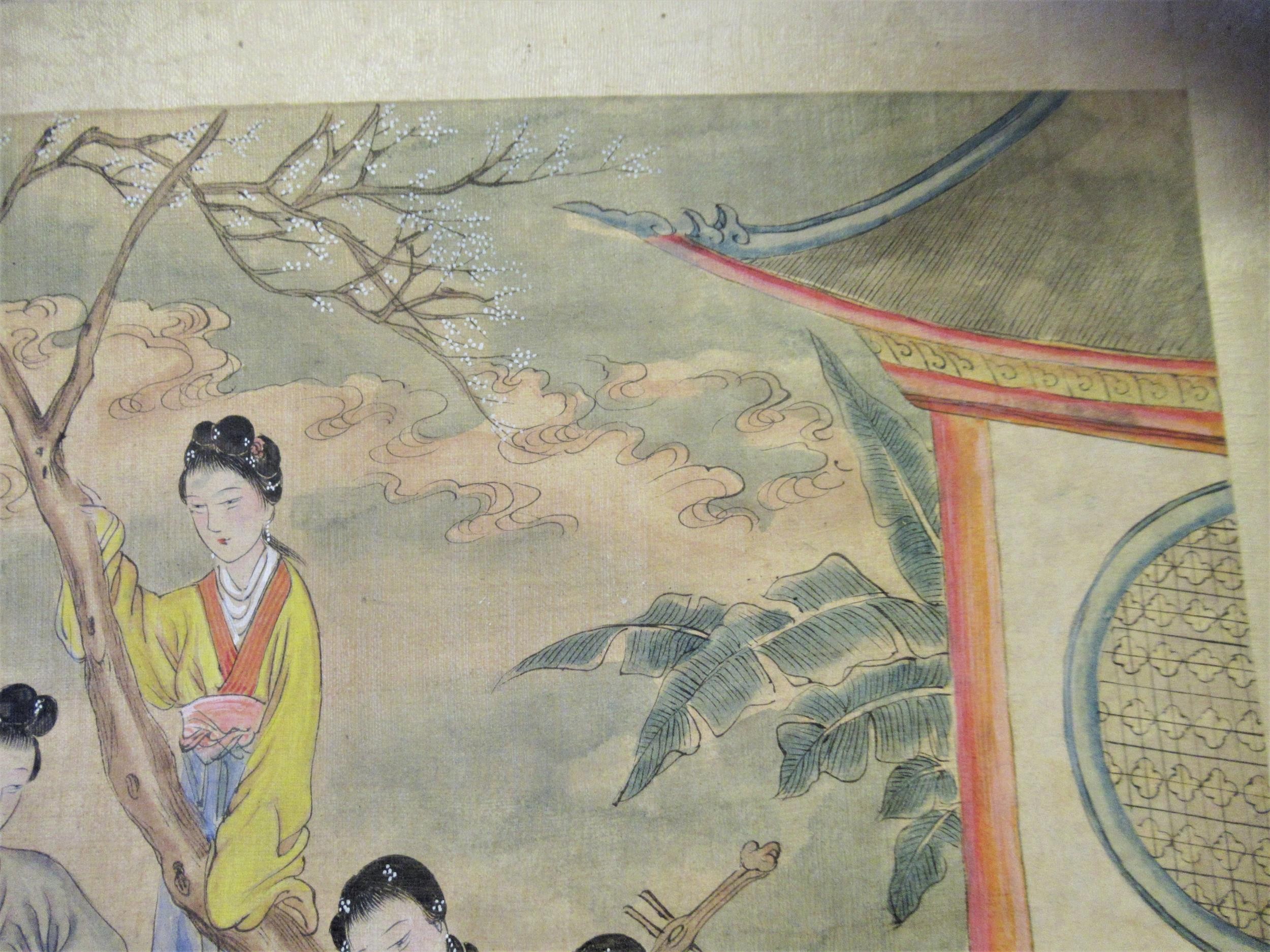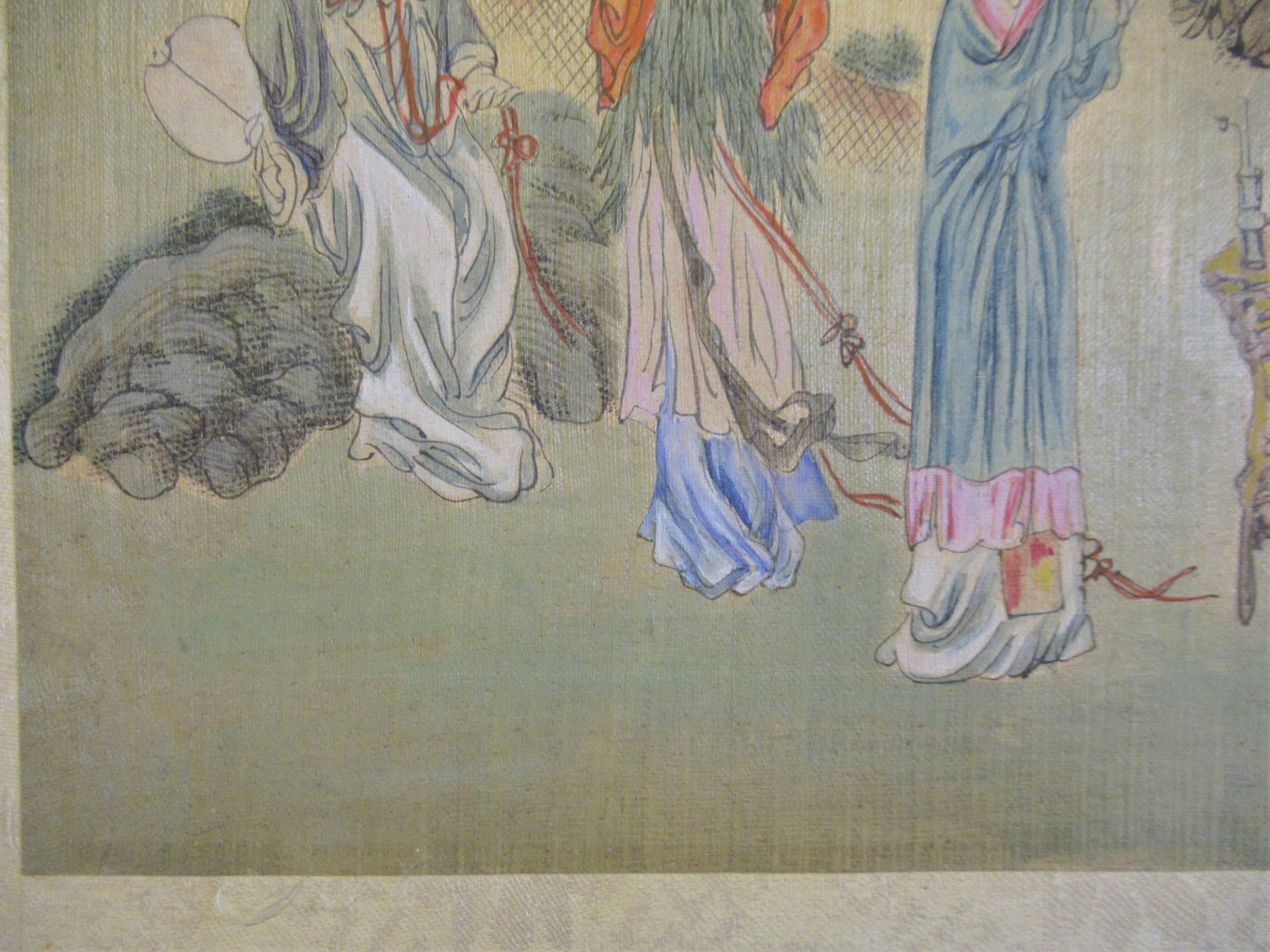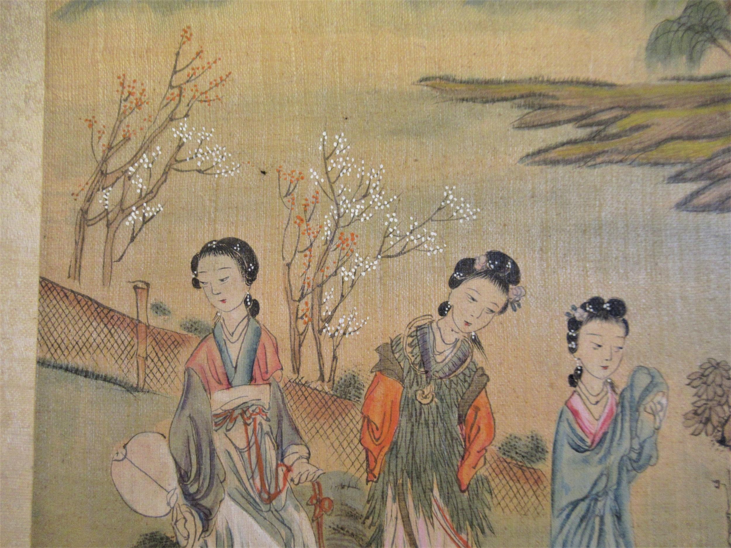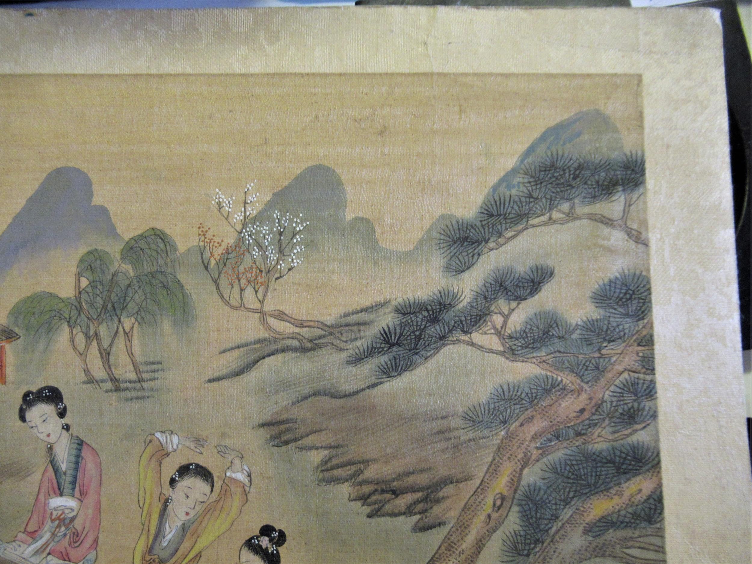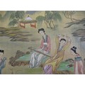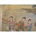 Pair of Chinese paintings on linen, figures in garden scenes, signed with character and red seal marks, 12ins x 16.5ins, unframed
