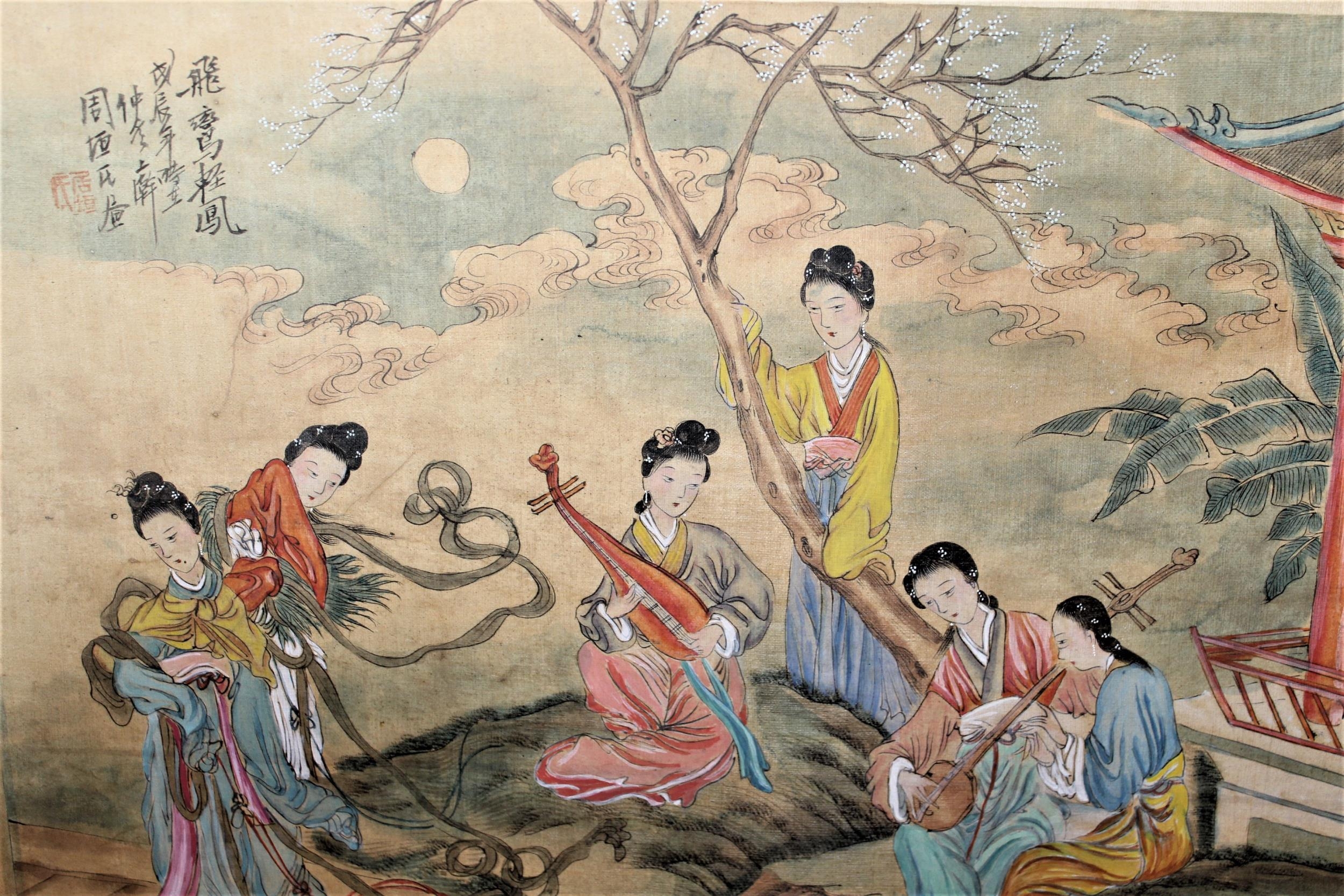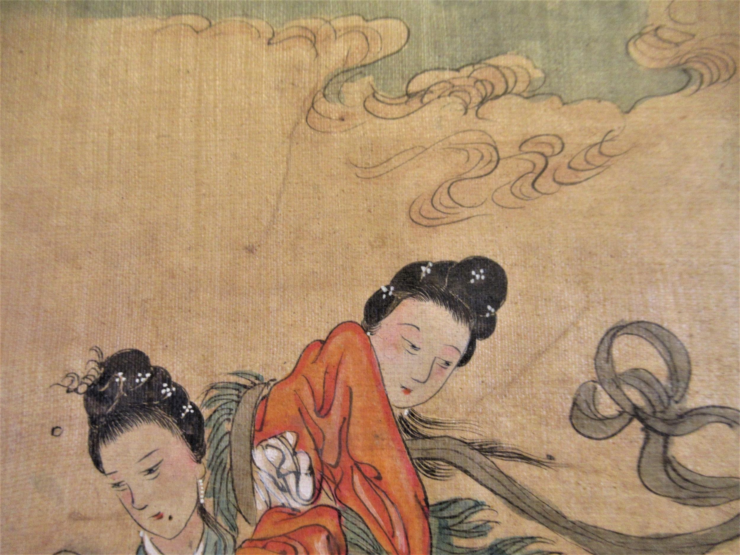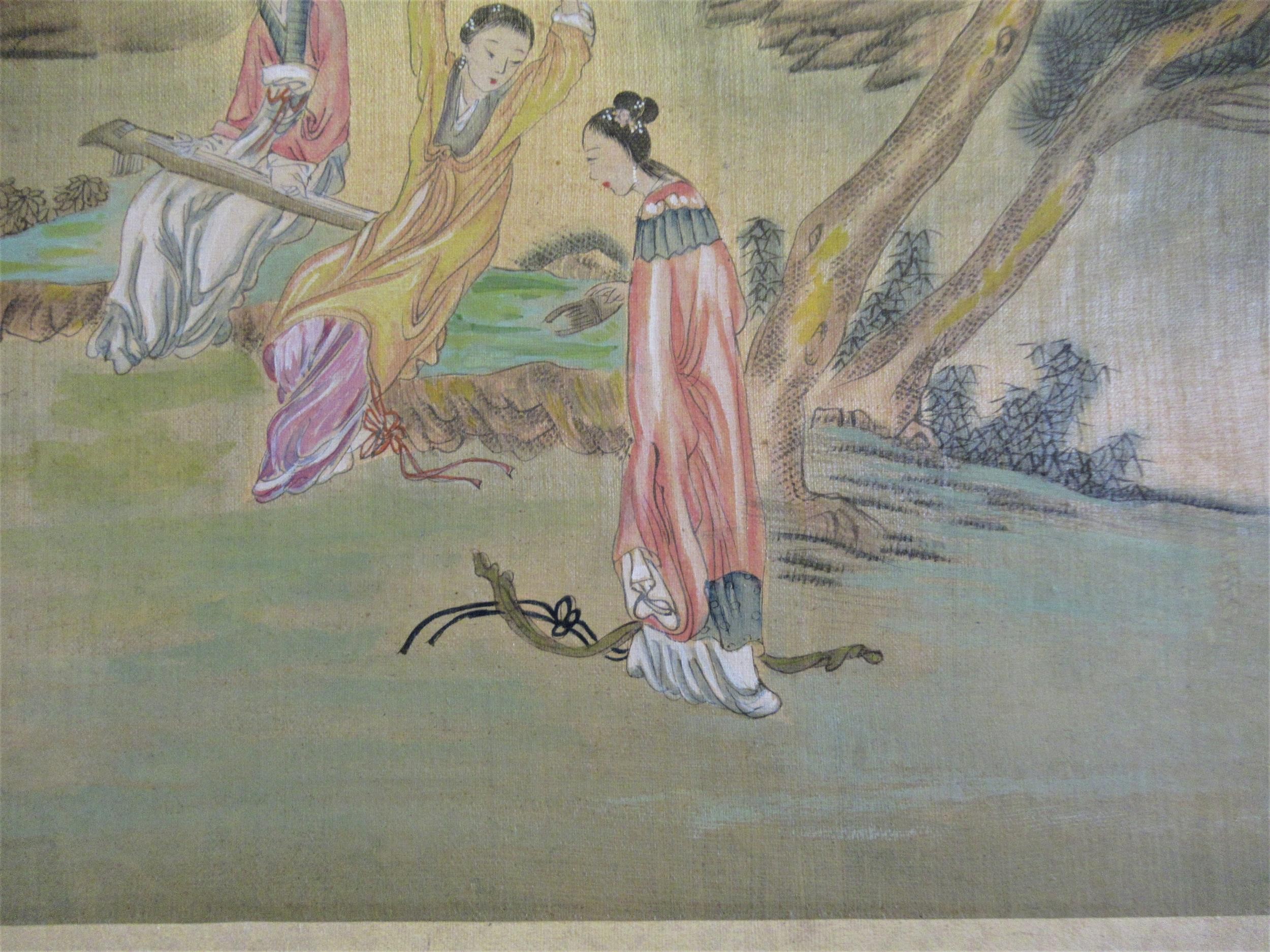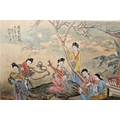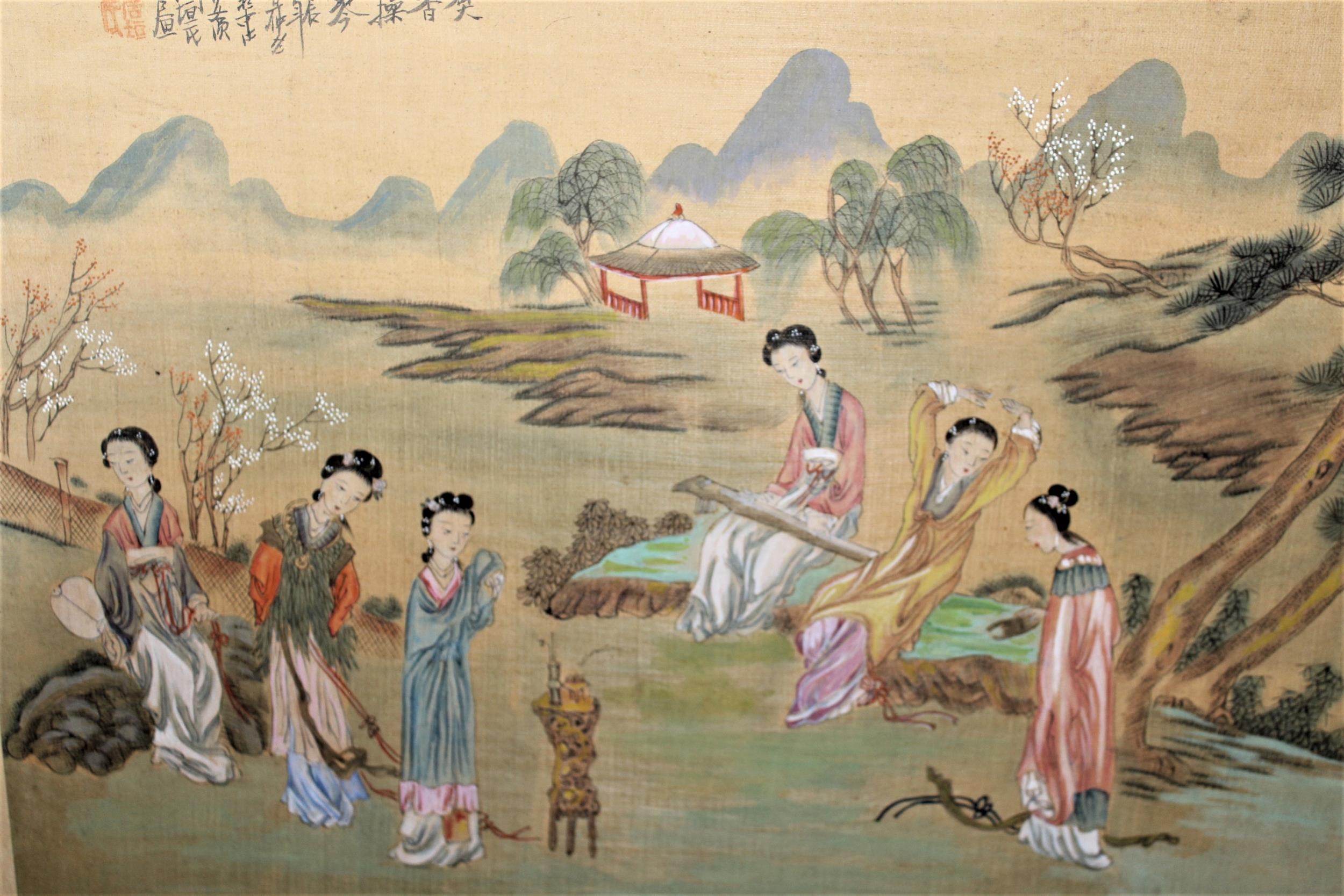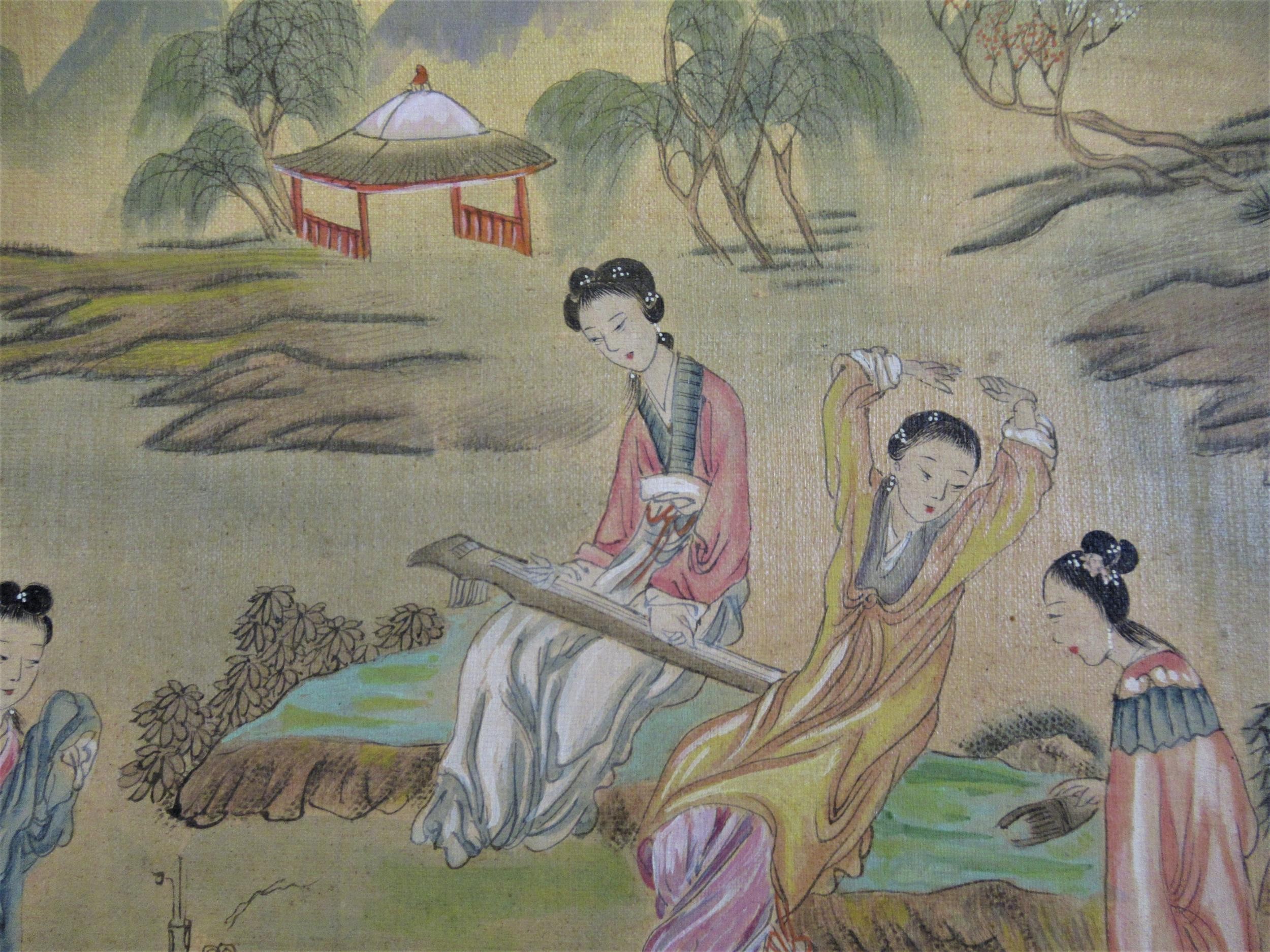 Pair of Chinese paintings on linen, figures in garden scenes, signed with character and red seal marks, 12ins x 16.5ins, unframed