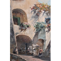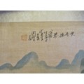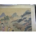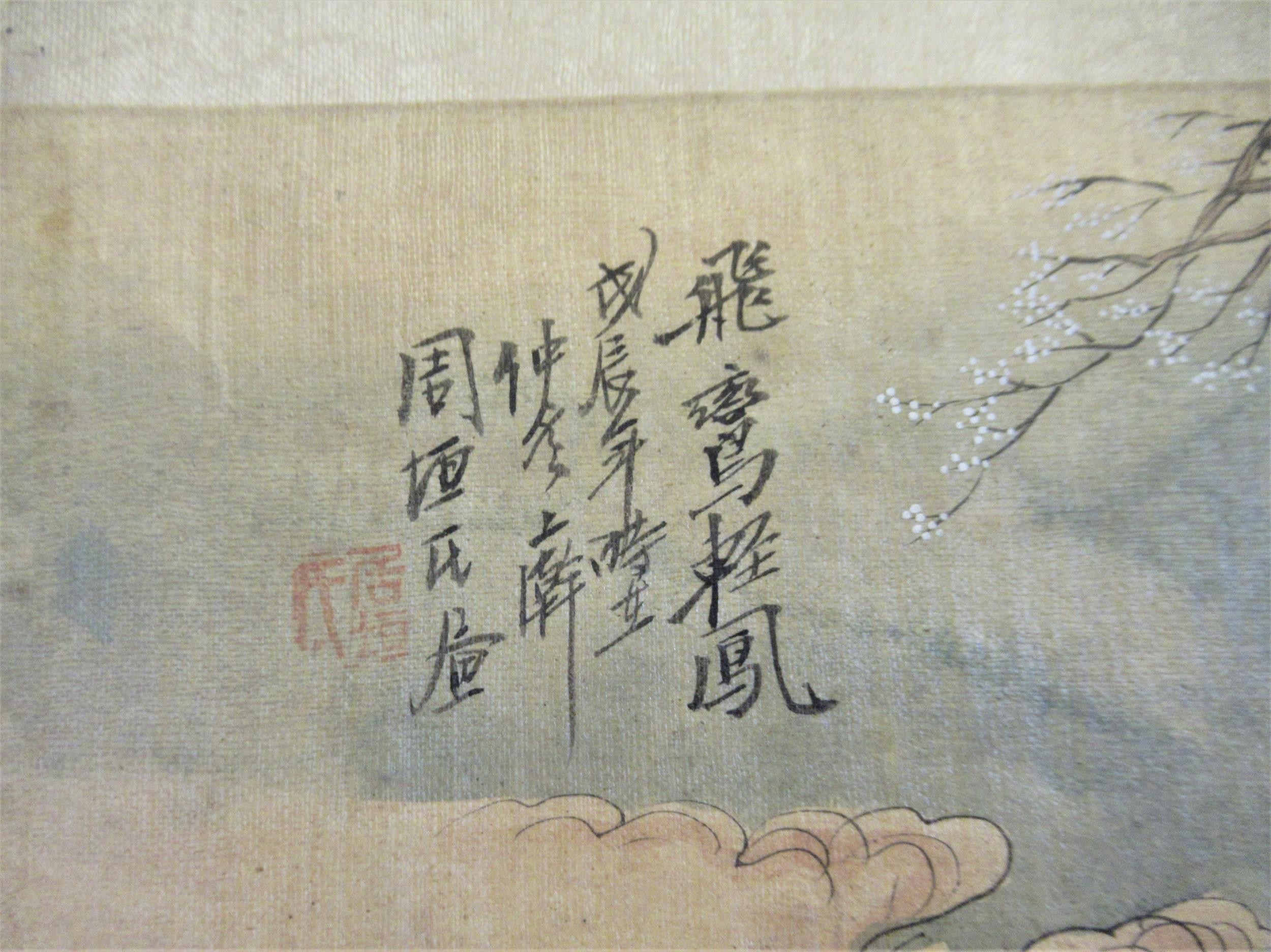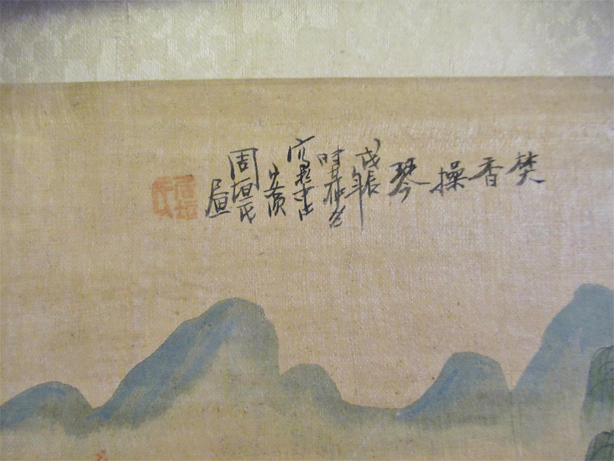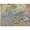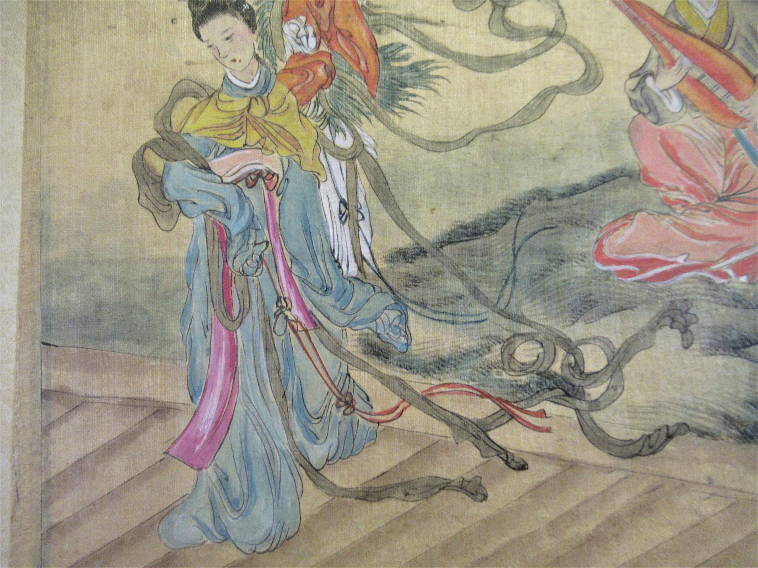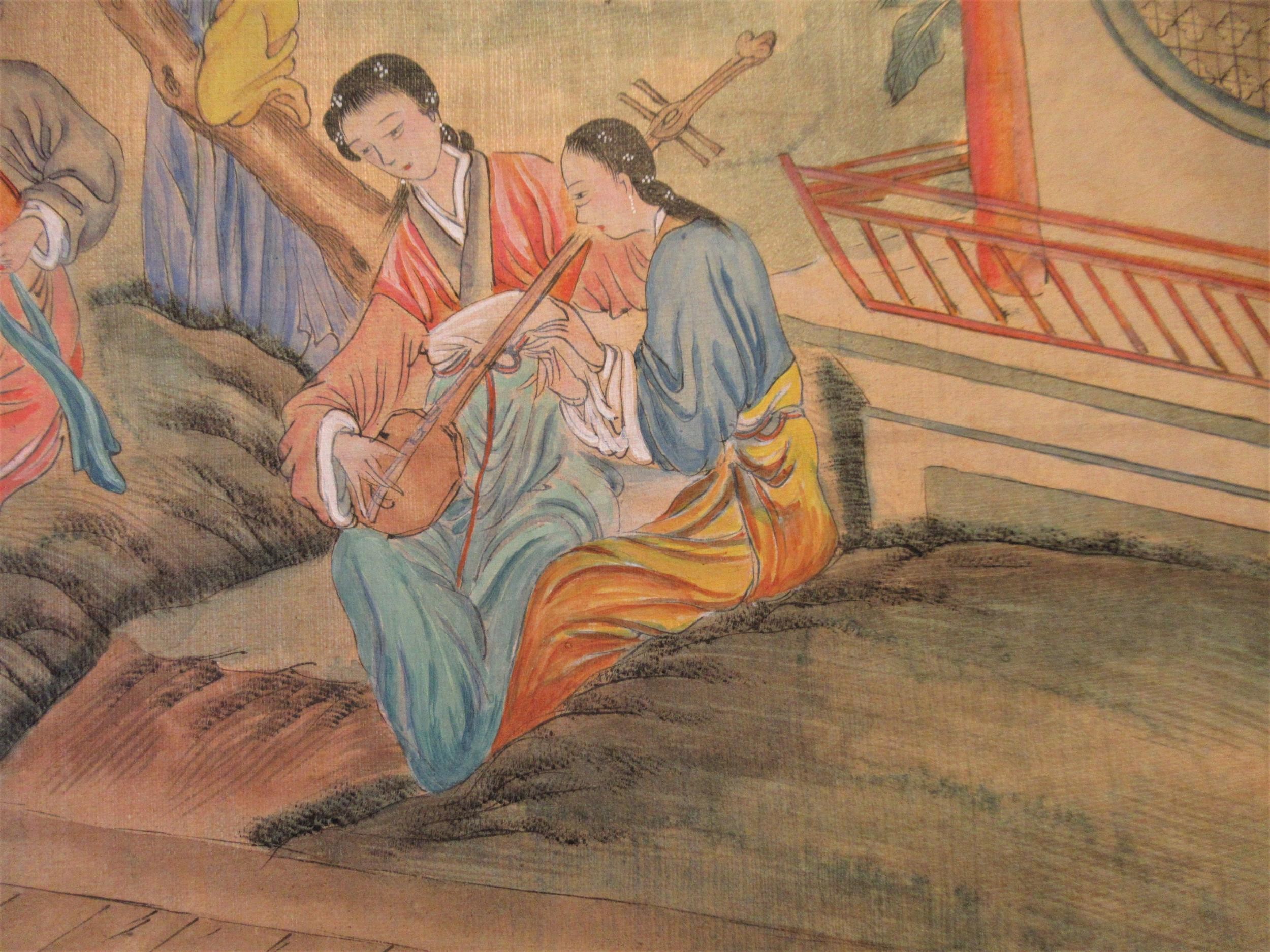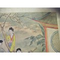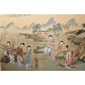 Pair of Chinese paintings on linen, figures in garden scenes, signed with character and red seal marks, 12ins x 16.5ins, unframed