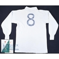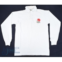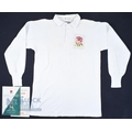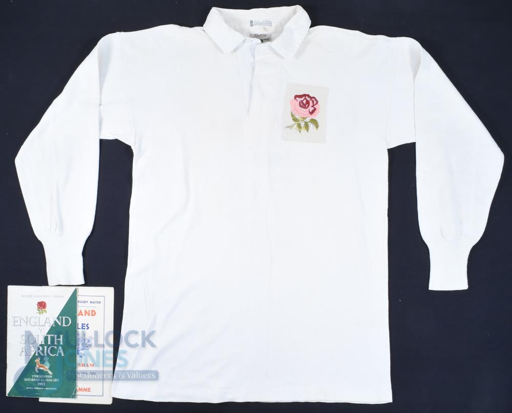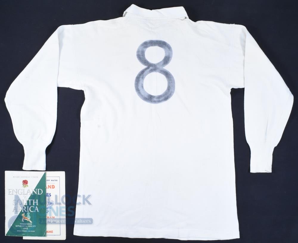 c1952 Scarce England International Rugby Jersey: Period piece, white England jersey made by Bukta, supplied by Lilywhites, both labels present, rose badge on rectangular sewn-on patch, black no.8 integral (dyed?) to the rear. Understood by the vendor to have been worn by RV 'Bob' Stirling, RAF and England stalwart prop (at that stage 8 was a prop's number), capped 18 times 1951-4 and skipper 1954. Comes with two programmes from his time with England, v S Africa and (pirate) v Wales, both January 1952. All VG condition after 70+ years