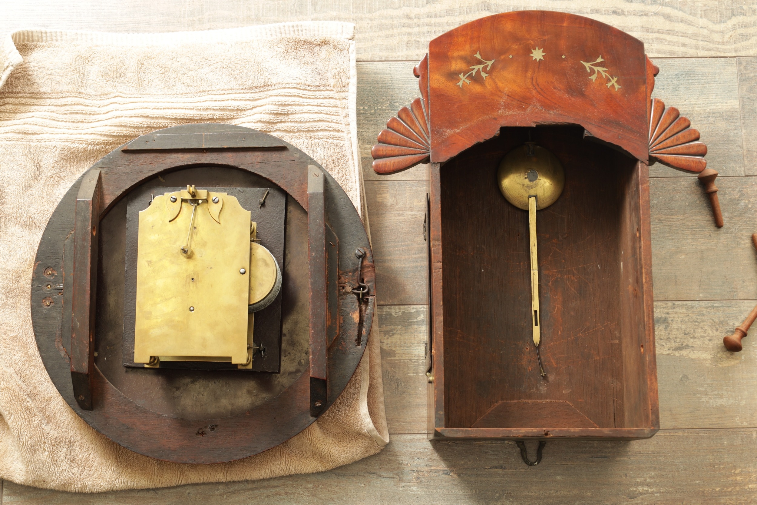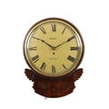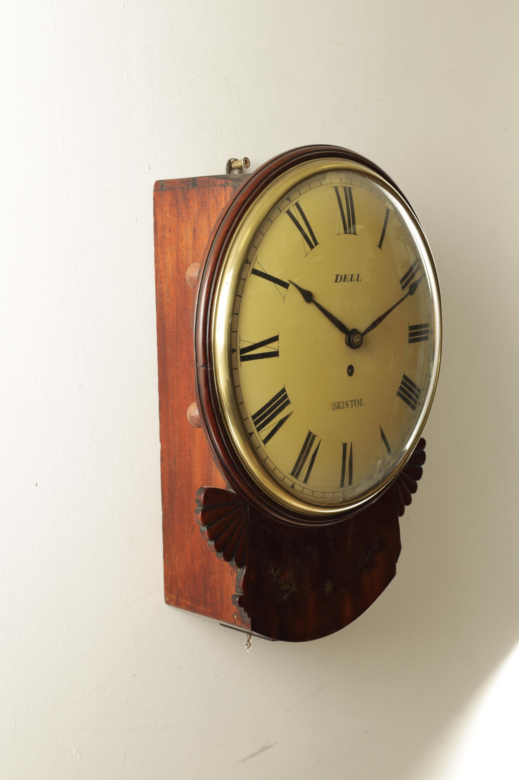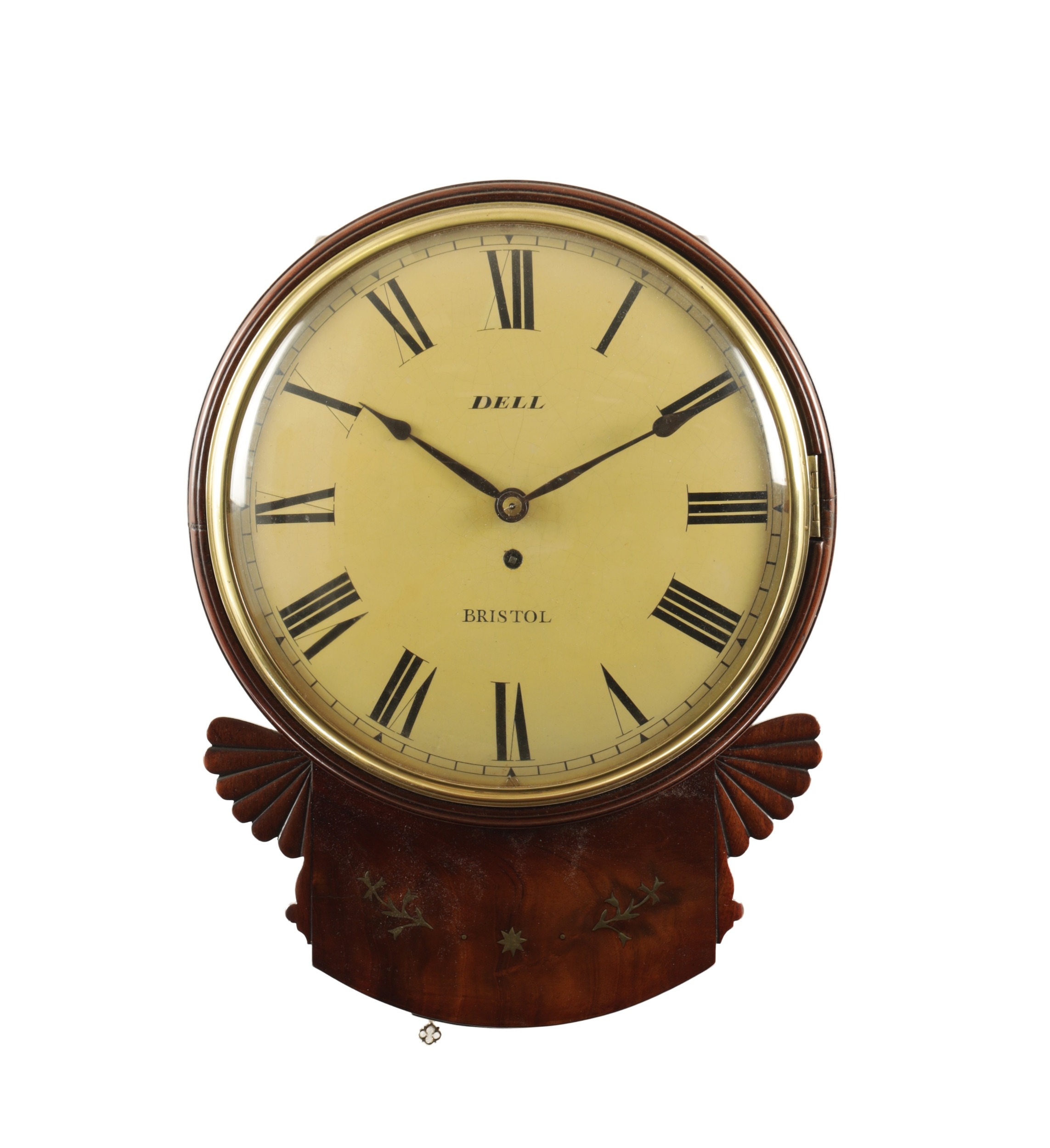 DELL, BRISTOL. A REGENCY BRASS INLAID CONVEX FUSEE WALL CLOCK the figured mahogany case with moulded fan carved ears and moulded surround with cast brass bezel enclosing a 12" painted dial with Roman numerals, fronting an eight day fusee movement with shaped plates and anchor escapement. (45cm high)