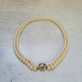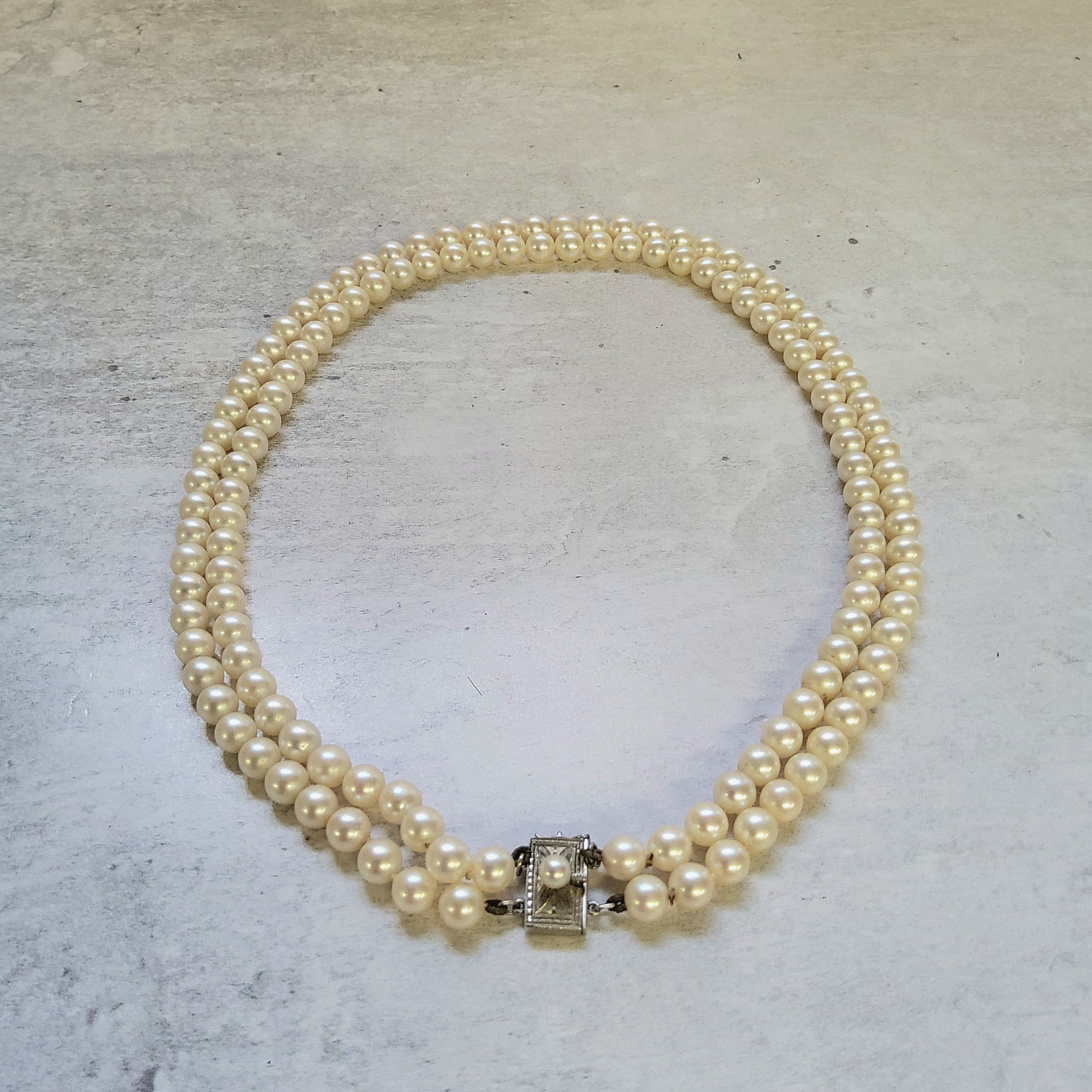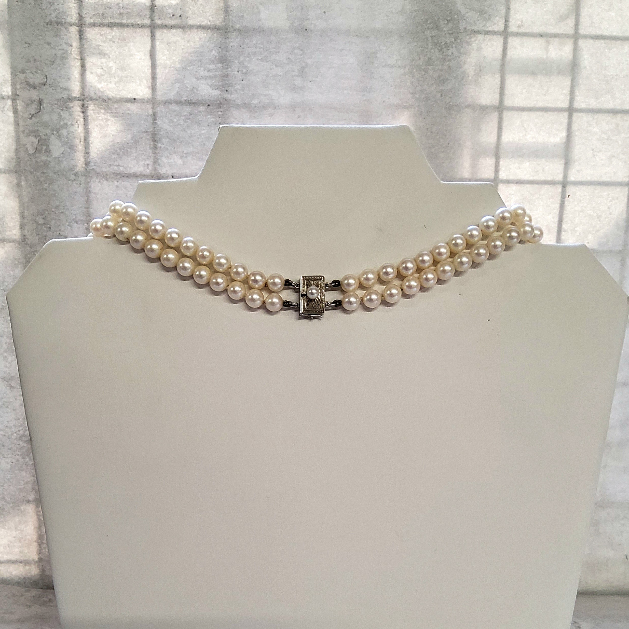 A Mikimoto two strand cultured pearl necklace, silver clasp, mounted with a single pearl, stamped with the Mikimoto mark and S