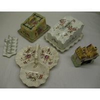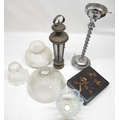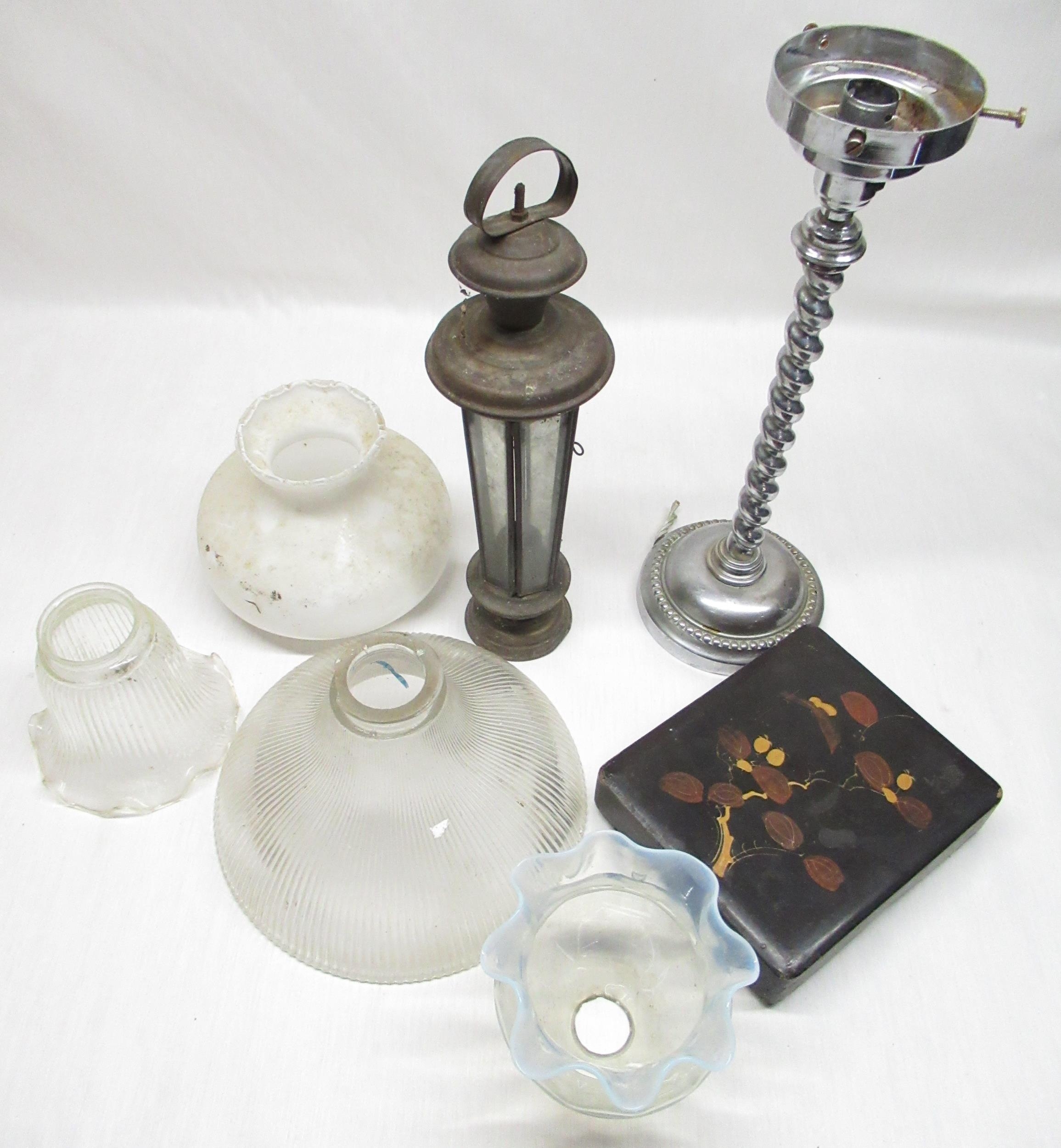 1930's chromed table lamp with barley twist column, opaline glass lampshade, other lampshades and C20th lacquered Papier-mâché table box