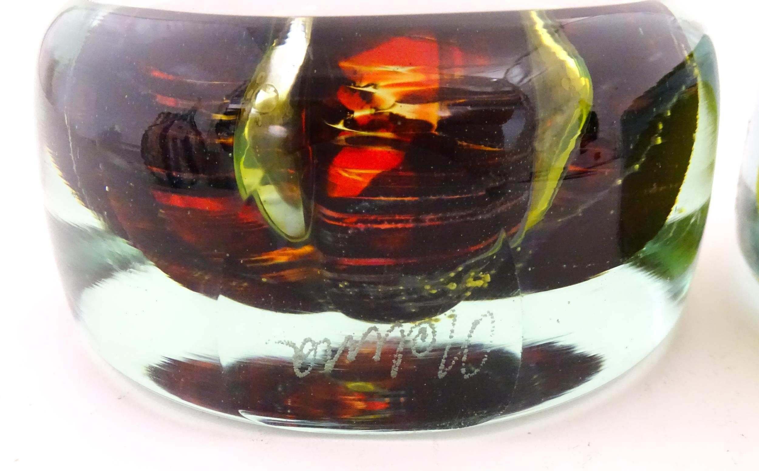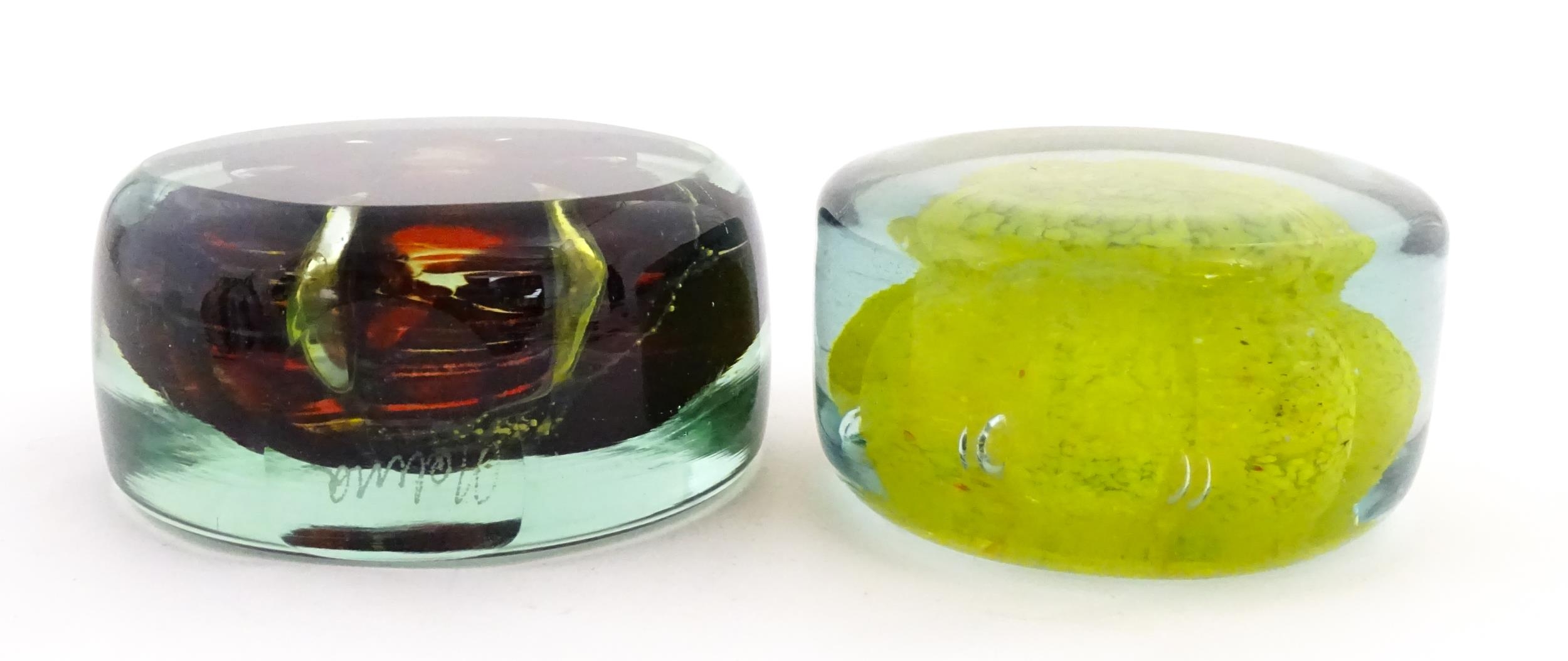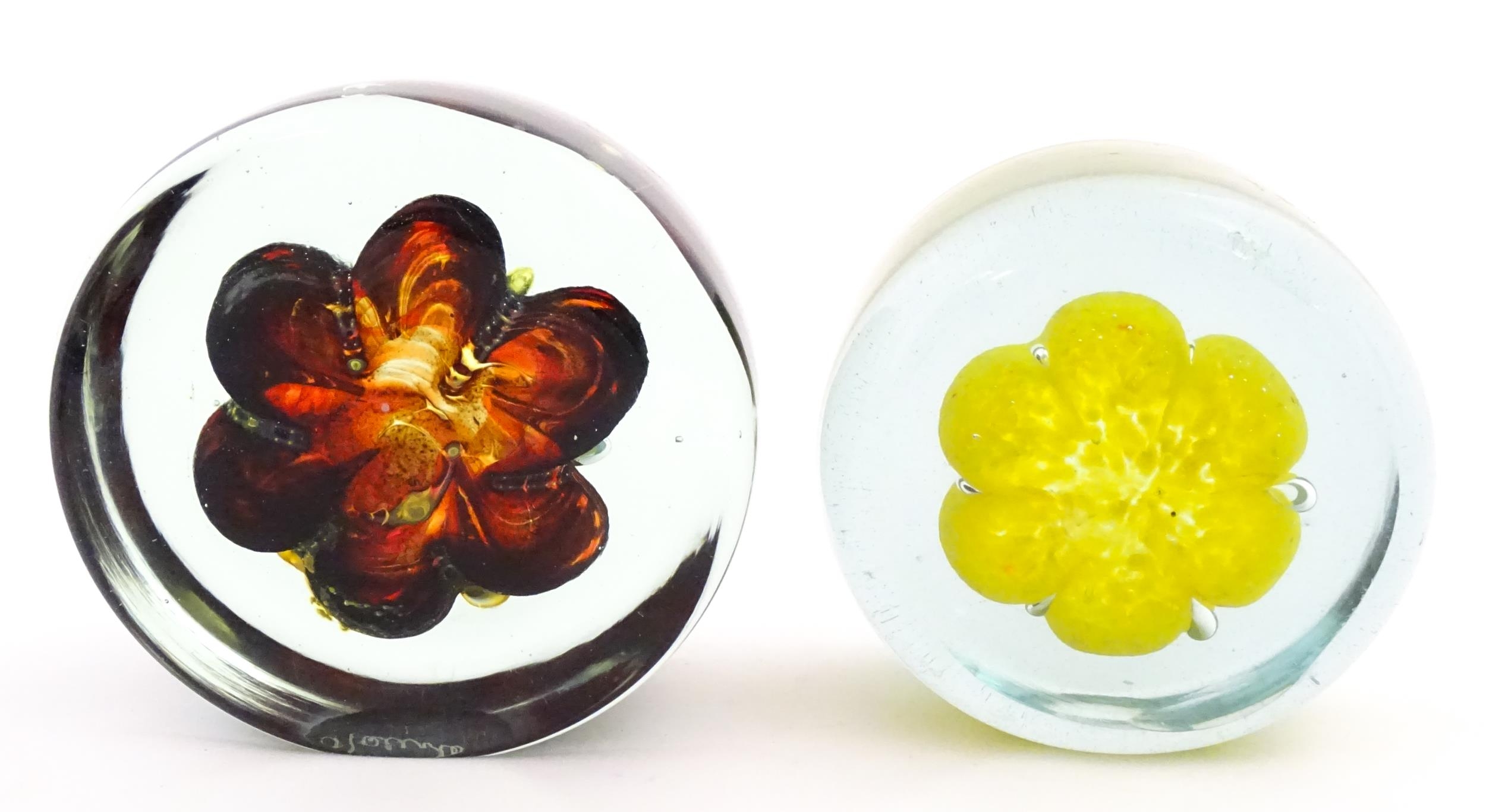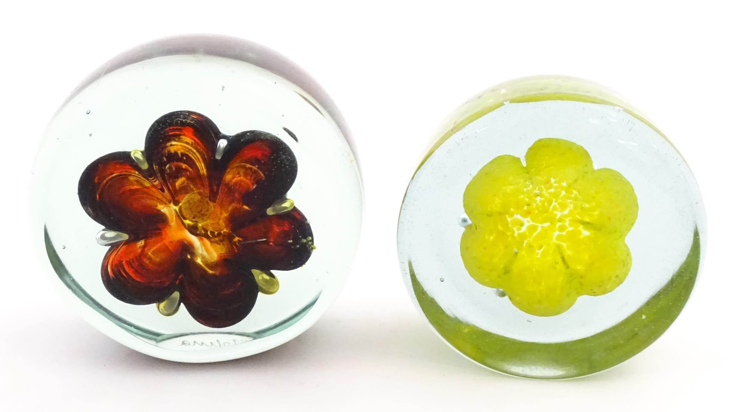 Two Mdina glass paperweights with flower detail. Both signed under. Largest approx. 4 1/2" high (2)