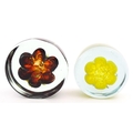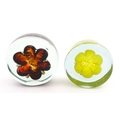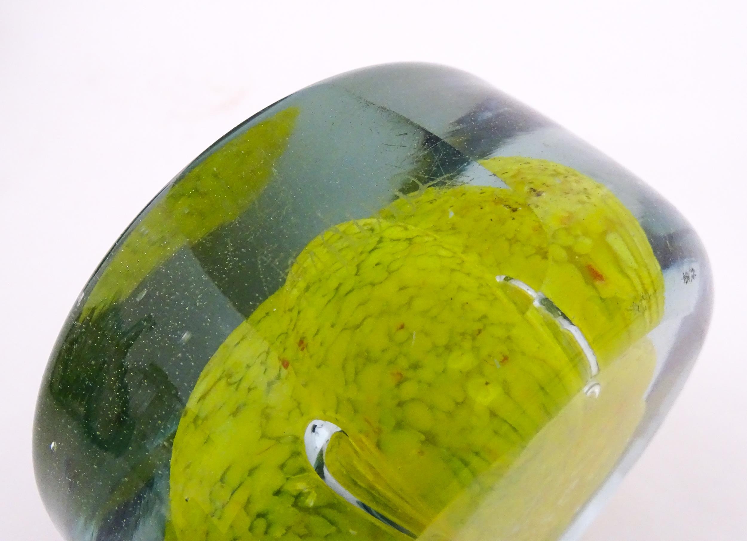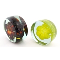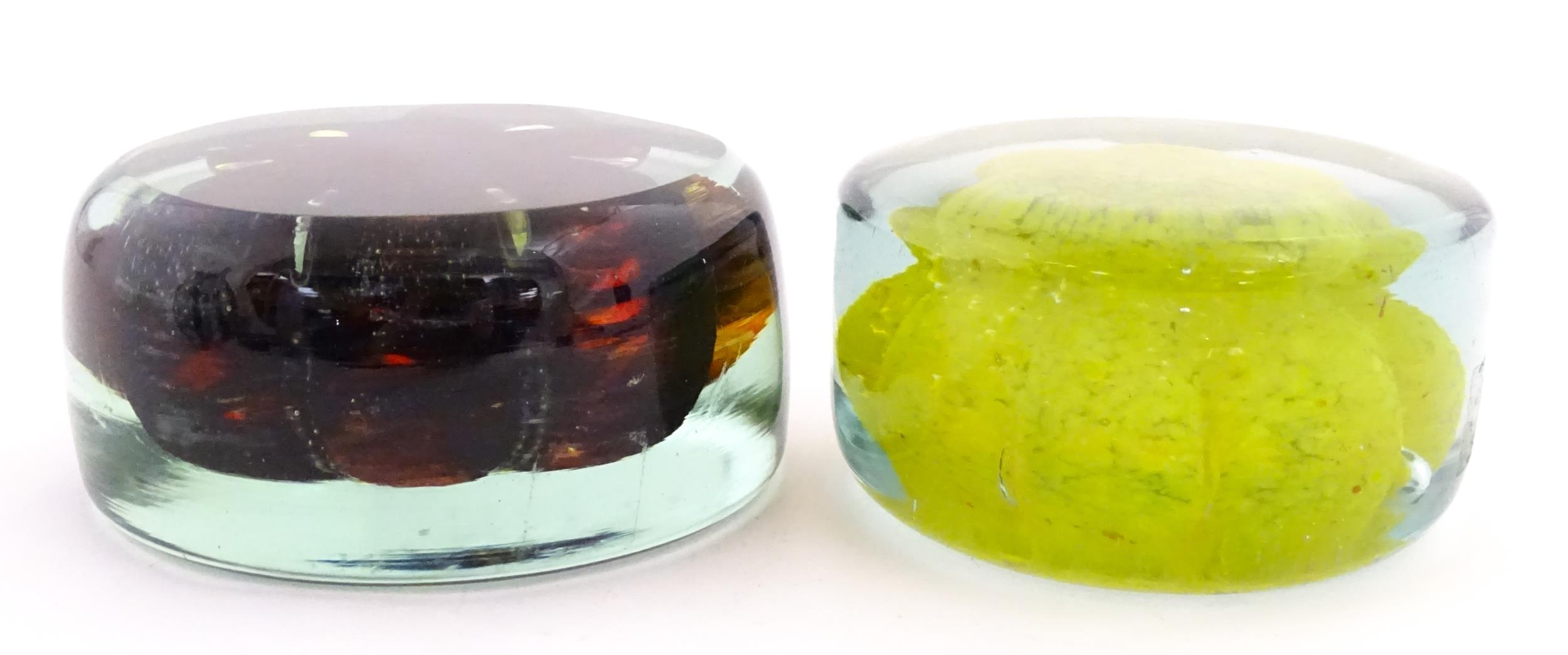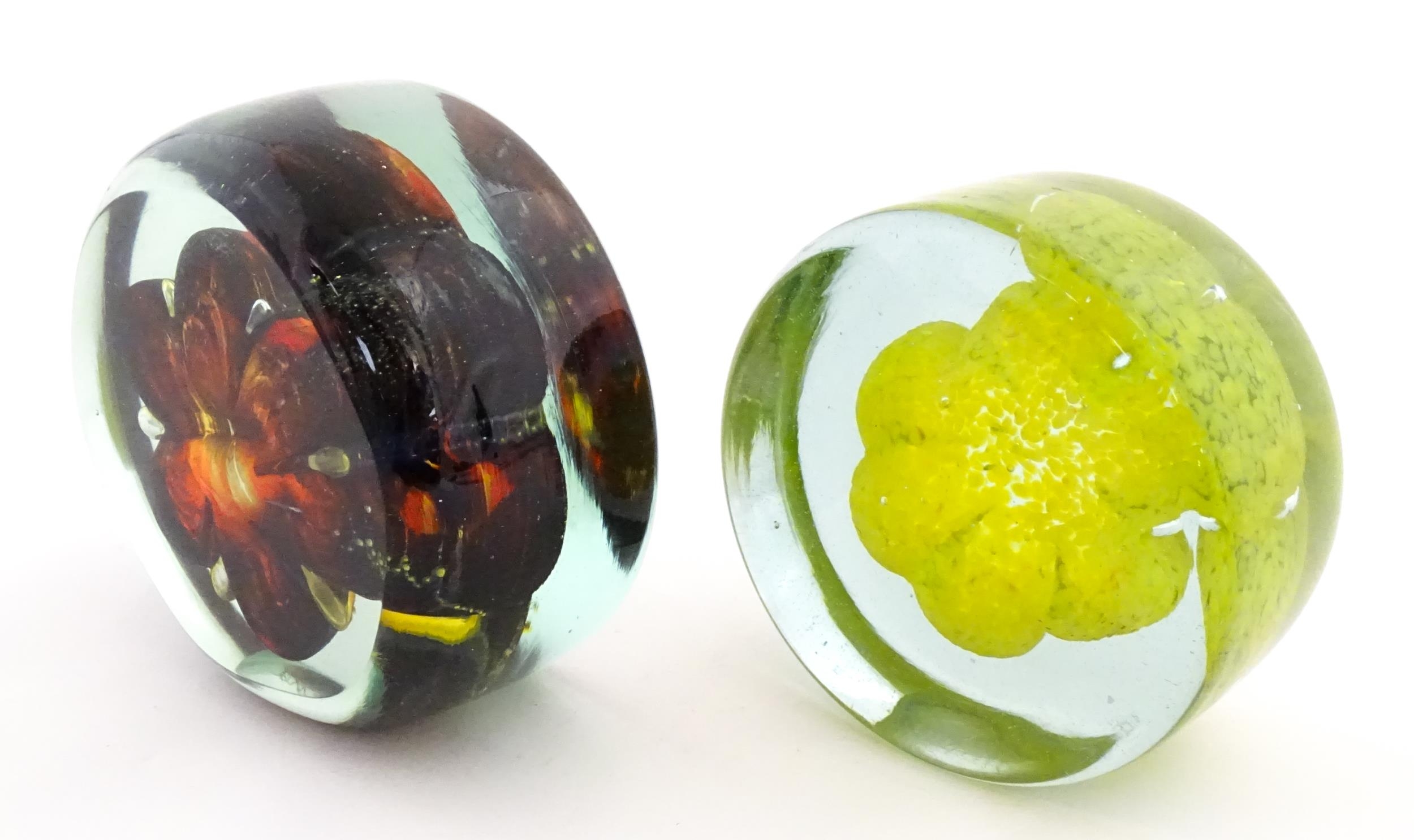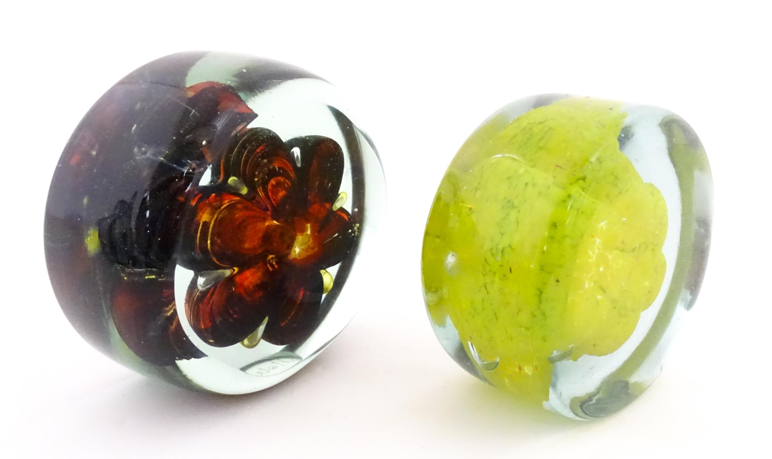 Two Mdina glass paperweights with flower detail. Both signed under. Largest approx. 4 1/2" high (2)
