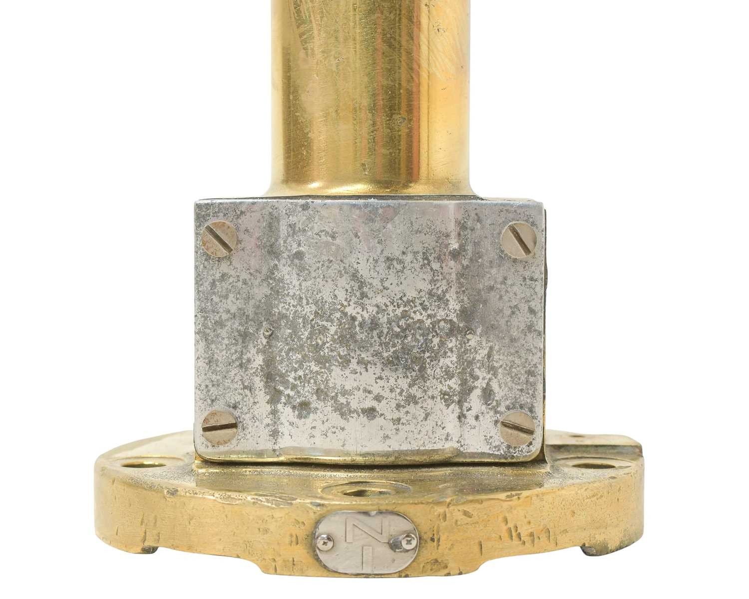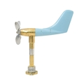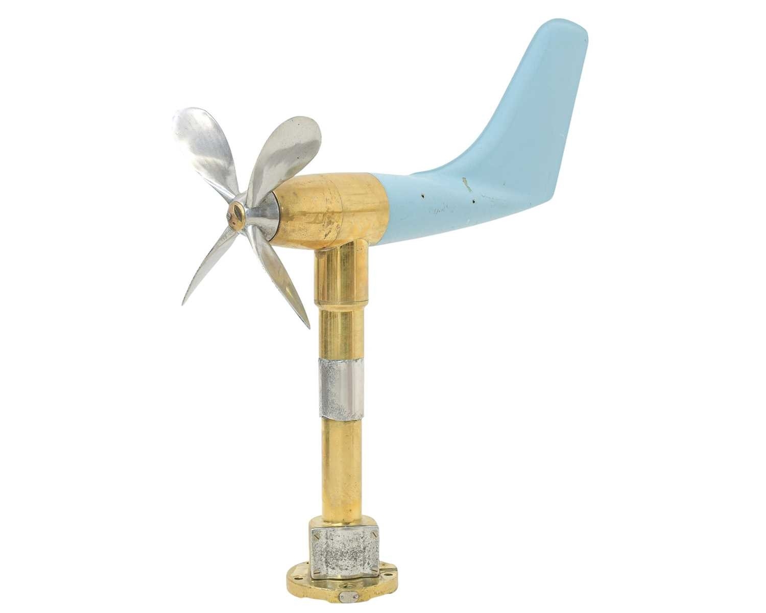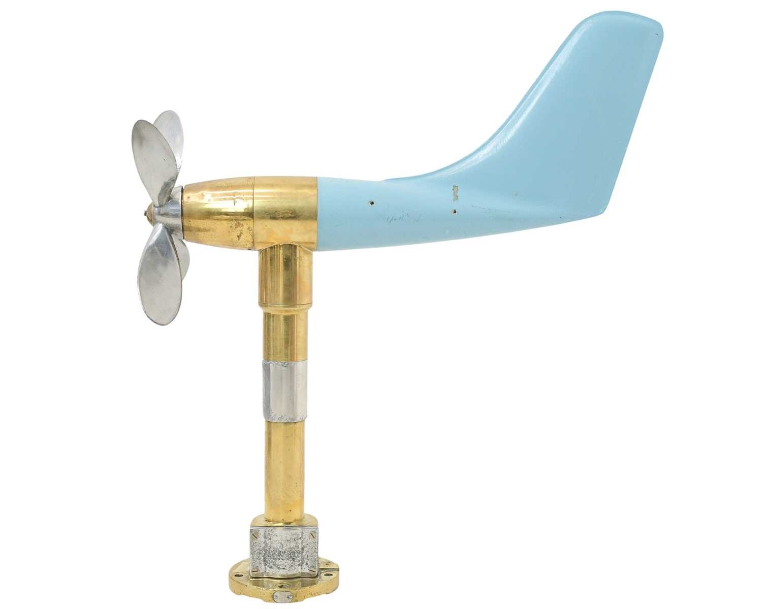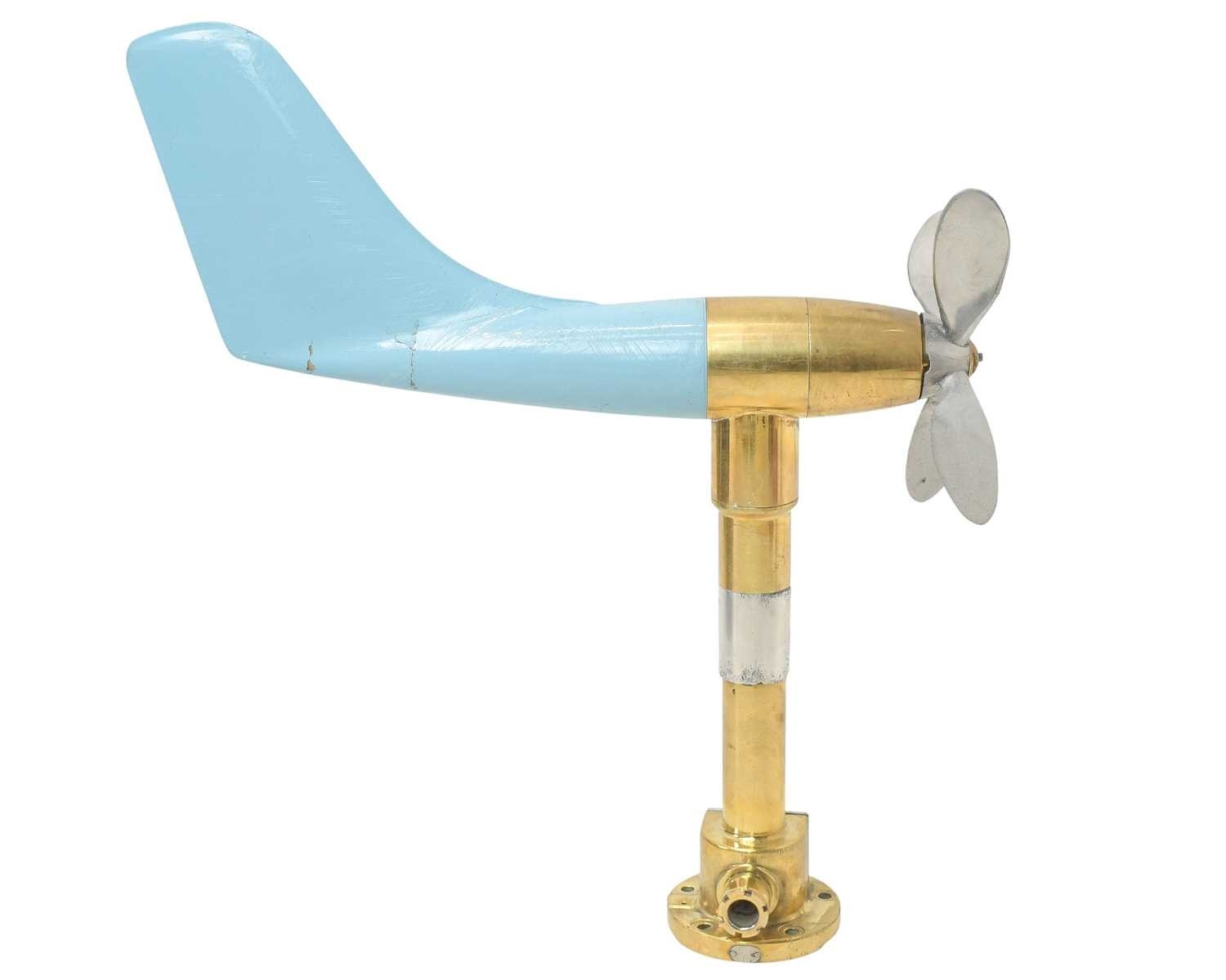 A ship's anemometer. Featuring a brass column and four-blade propeller, with an enamelled blue fibreglass tail fin, height 78cm.