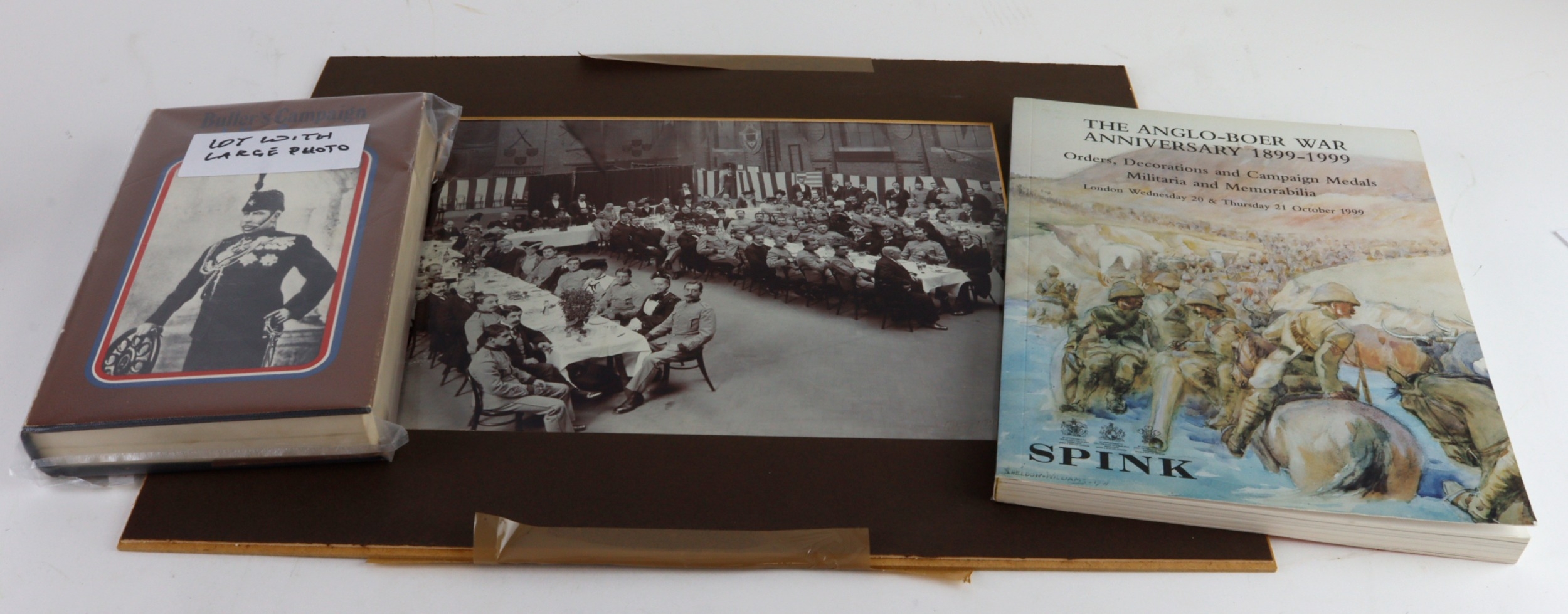 Boer War - Original photograph, 9x11.5 ins, taken at a luncheon given in honour of General Sir Redvers Buller, 10 October 1901, at the London Headquarters of the Queen’s Westminster Rifle Volunteers. At this event, Buller sought to counter criticism of his conduct in South Africa but it served only to hasten his dismissal. Buller is seated at the top table wearing civilian dress. Sold together with a hardback copy of the book “Buller’s Campaign”, in which the author Julian Symons describes [pages 288 and 289] the speech and its consequences for a man who remained widely popular with the British public. Plus the catalogue for The Anglo-Boer War Anniversary 1899-1902 auction of Orders, Decorations and Campaign Medals, Militaria and Memorabilia. Organised by Spink of London on 20 - 21 October 1999. A superb illustrated (black and white, some colour) record of the special “100 years on” sale. A great reference in its own right. Softcover, 304pp