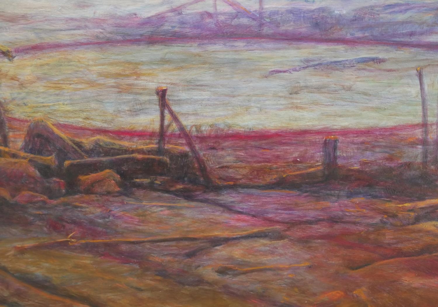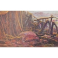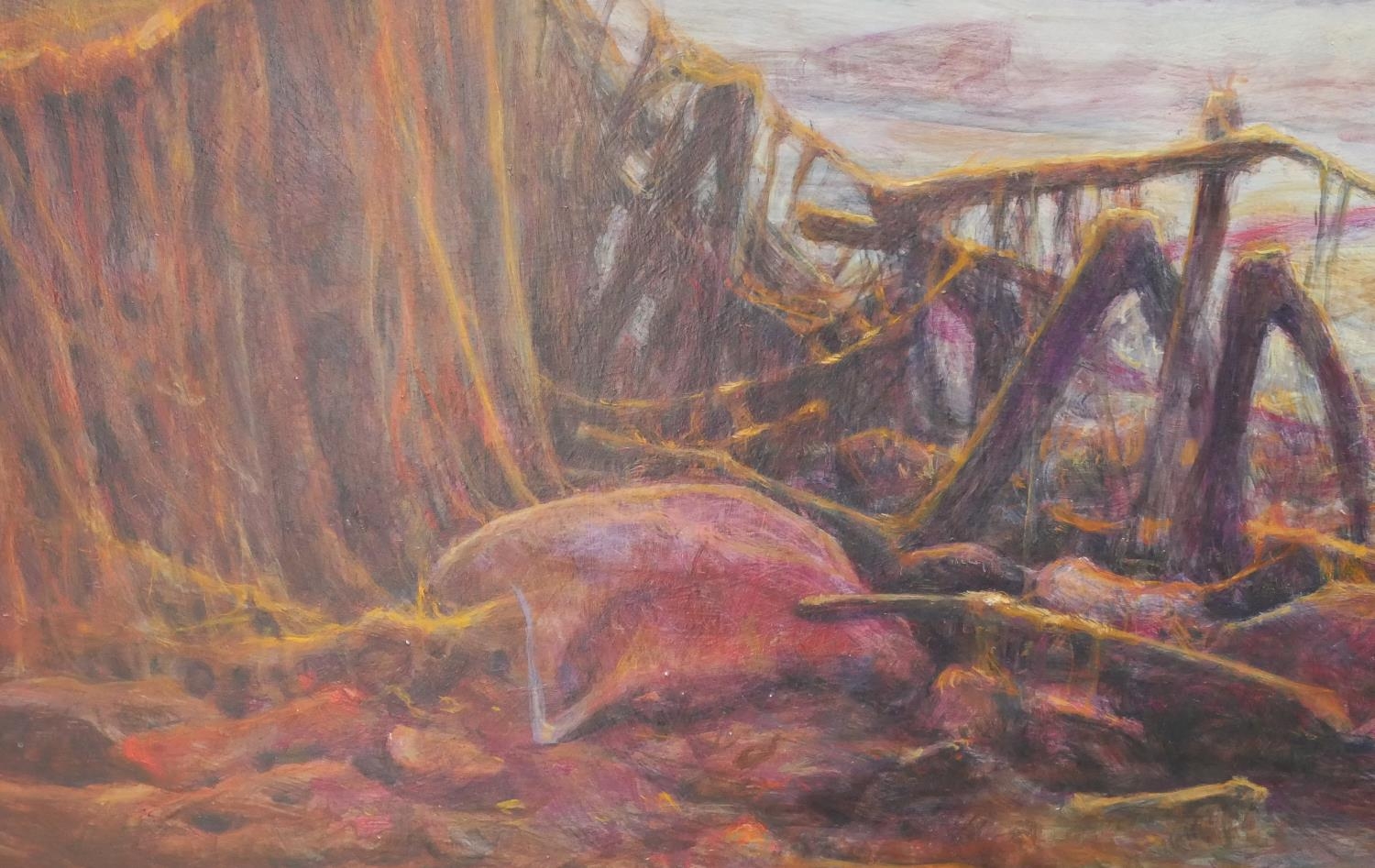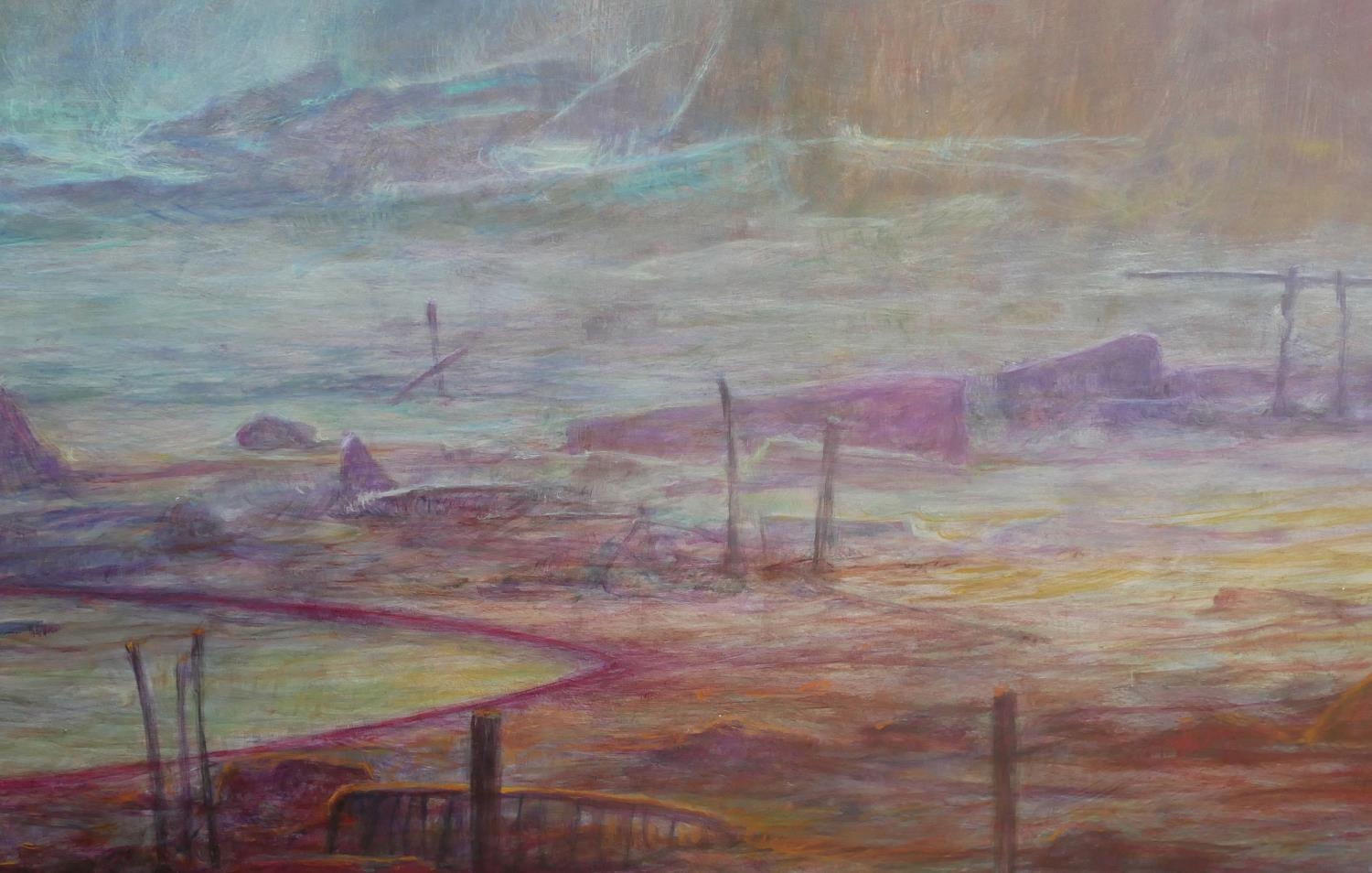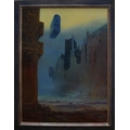 Untitled surrealist apocalyptic landscape, signed verso, bearing the letters ‘OR’, framed.