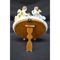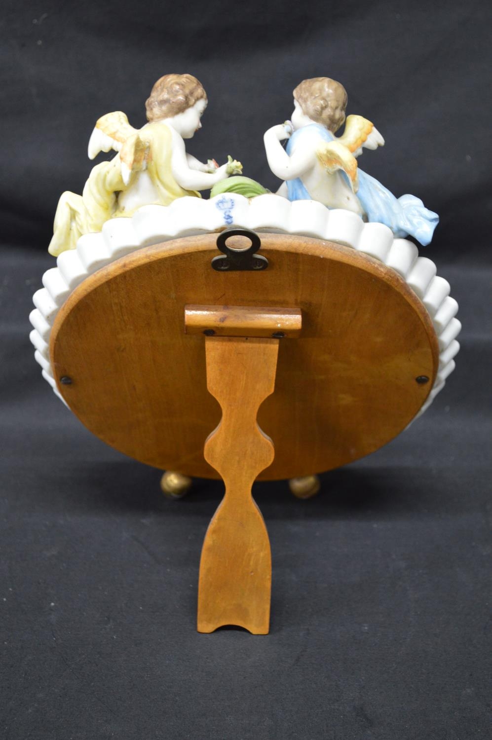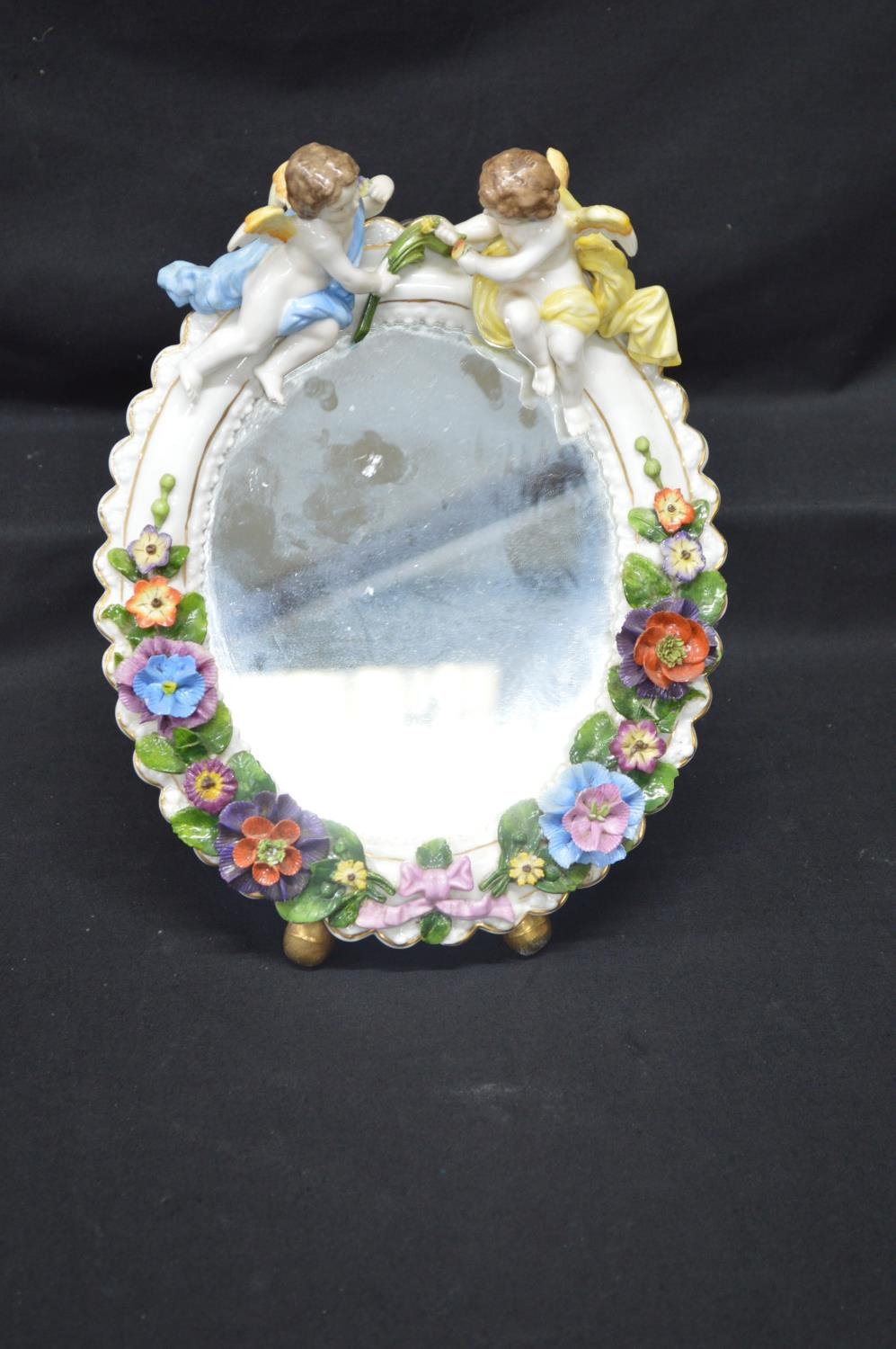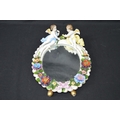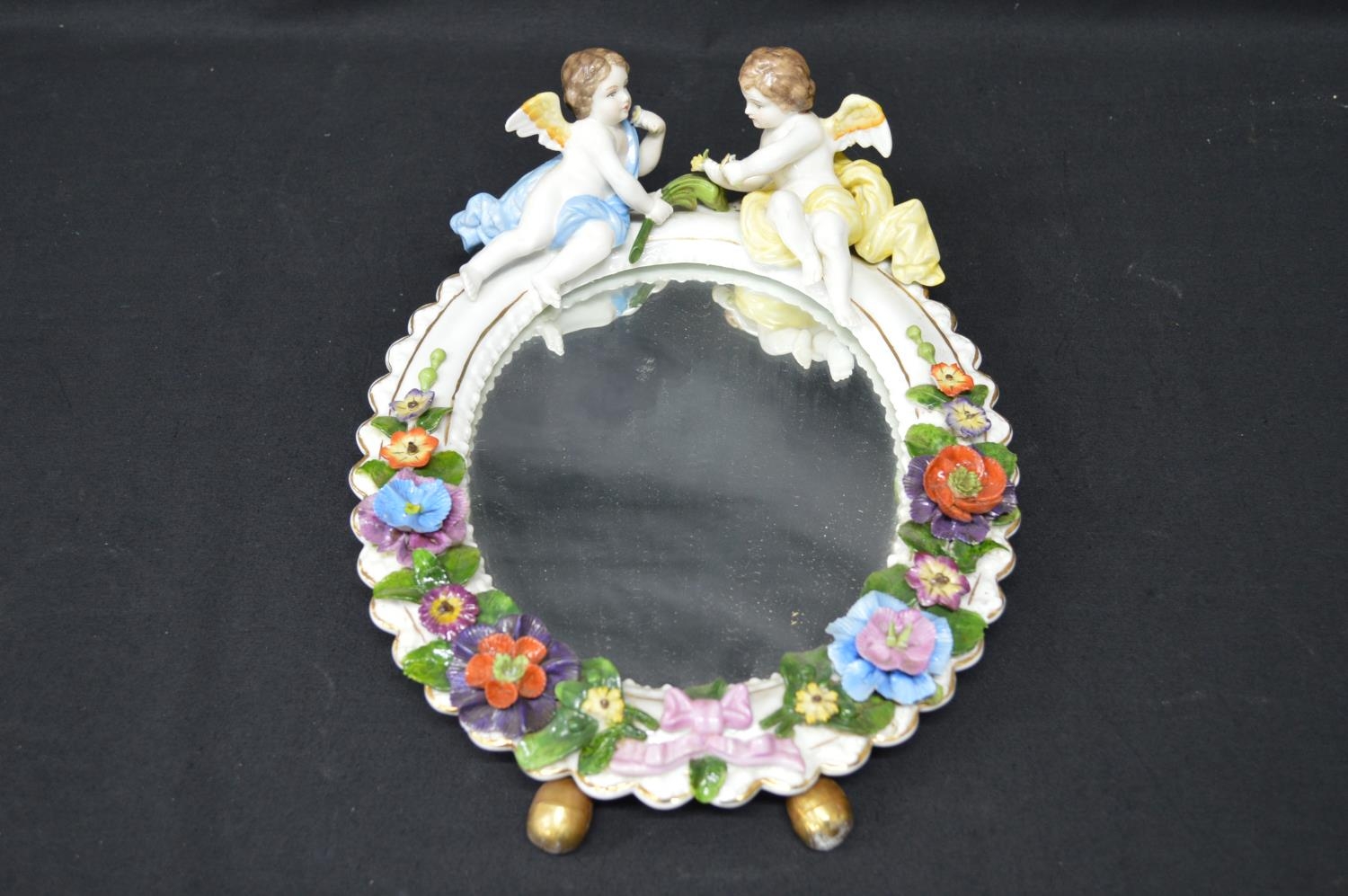 Sitzendorf floral decorated free standing oval mirror mounted with two cherubs - 11.25" tall x 8.5" wide
