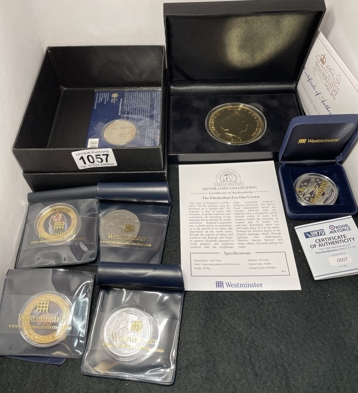 Mixed collectors coins including Queen Elizabeth II 90th Two Dollars 110g, Dambusters 70th Proof £5, 2013 Coronation 50p, Diamond Jubilee £5, Elizabethan Era one crown, Elizabethan replica crown etc