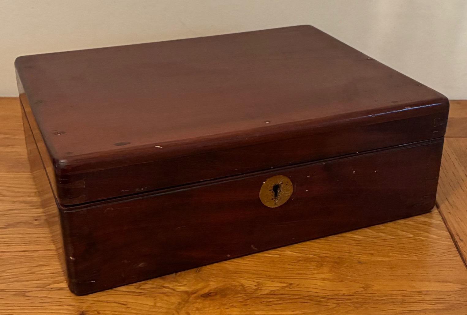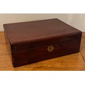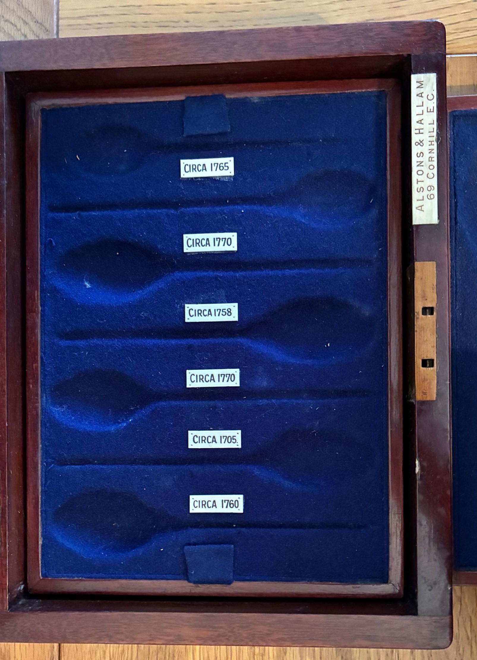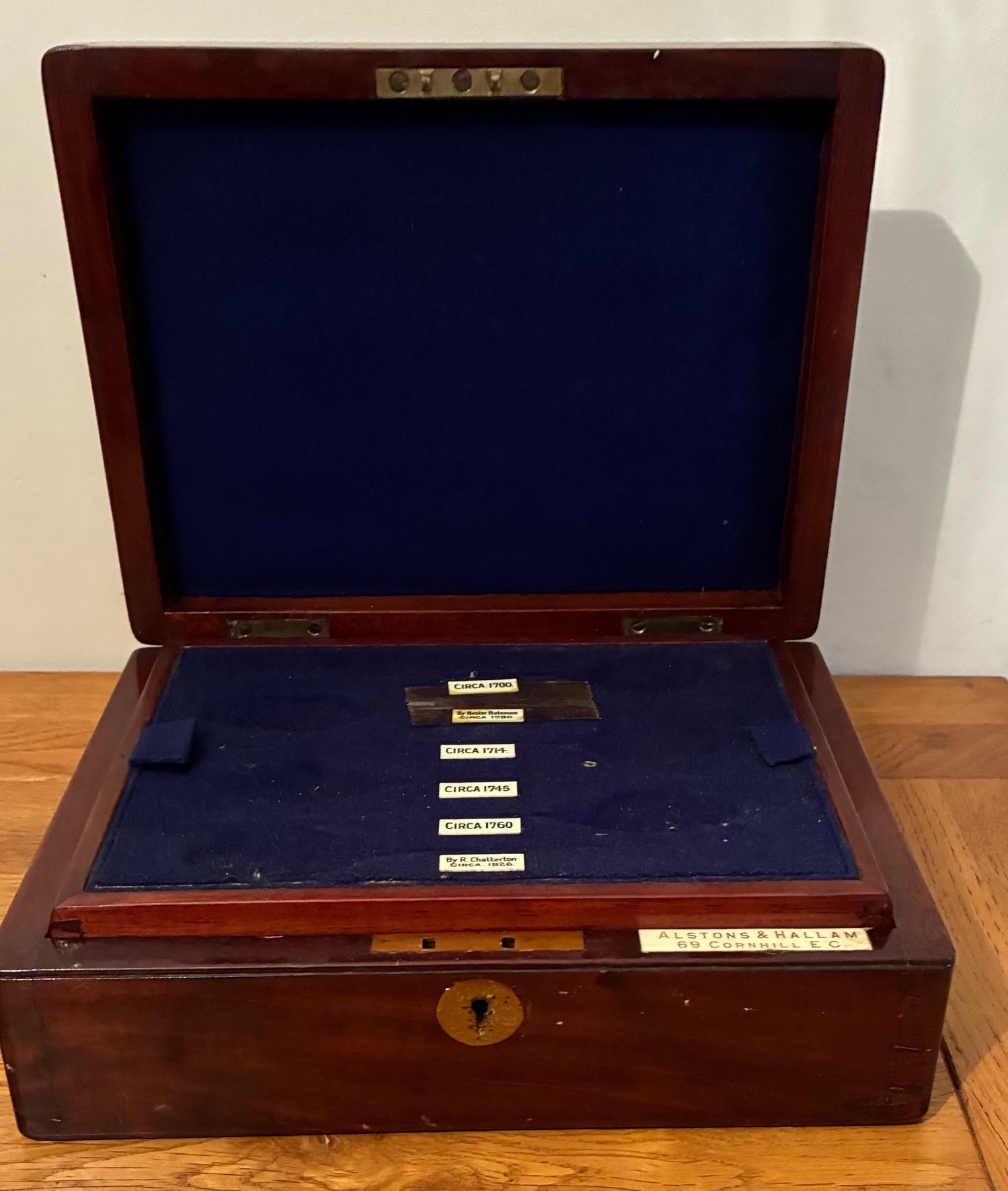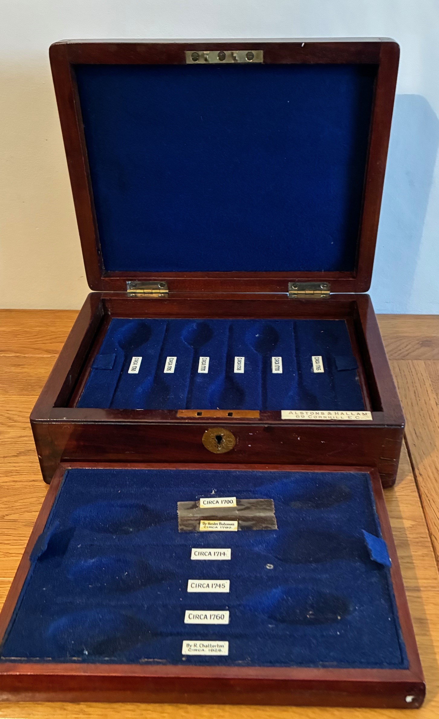 19th century oblong mahogany box, by Alstons & Hallam, 69 Cornhill E.C. with hinged lid and fitted two section interior for silver Mote spoons, 23cm wide, 10cm high.