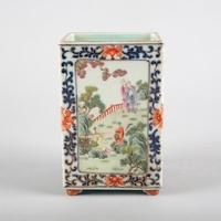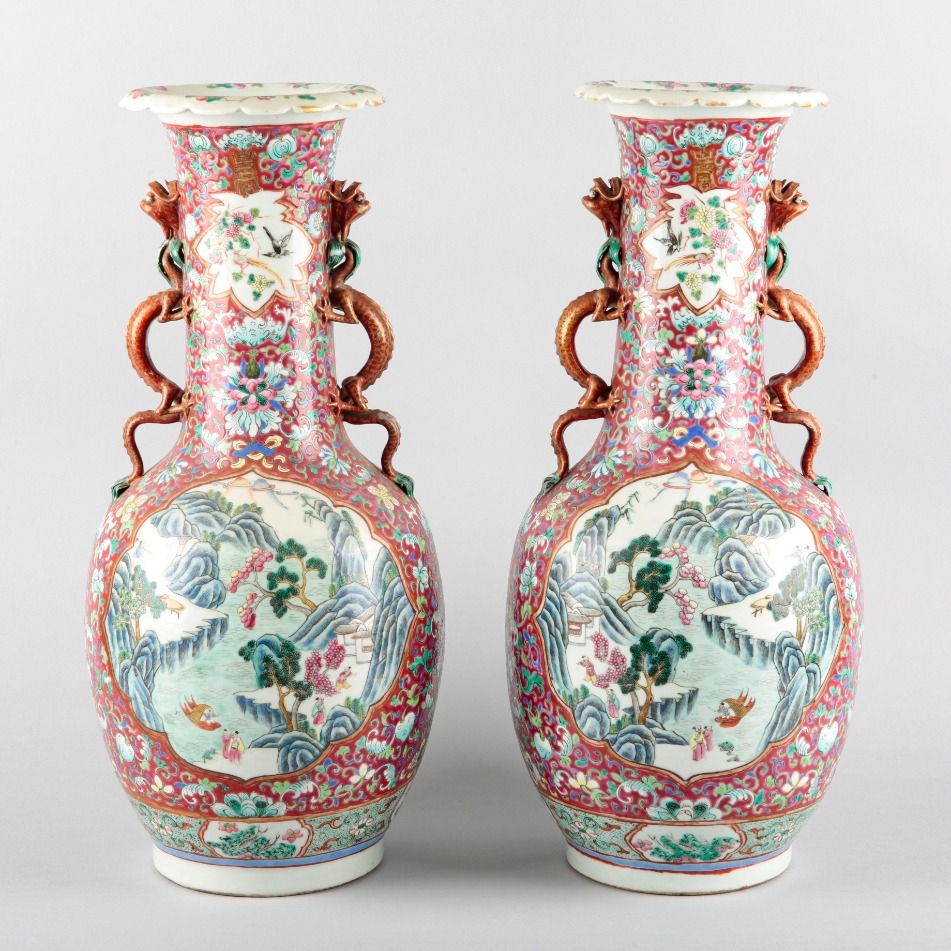 19th century, the flared scalloped rim above a tapering neck and applied twin dragon-shaped handles, the carmine red ground with a central cartouche depicting a rural landscape scene, 60cm high (2)