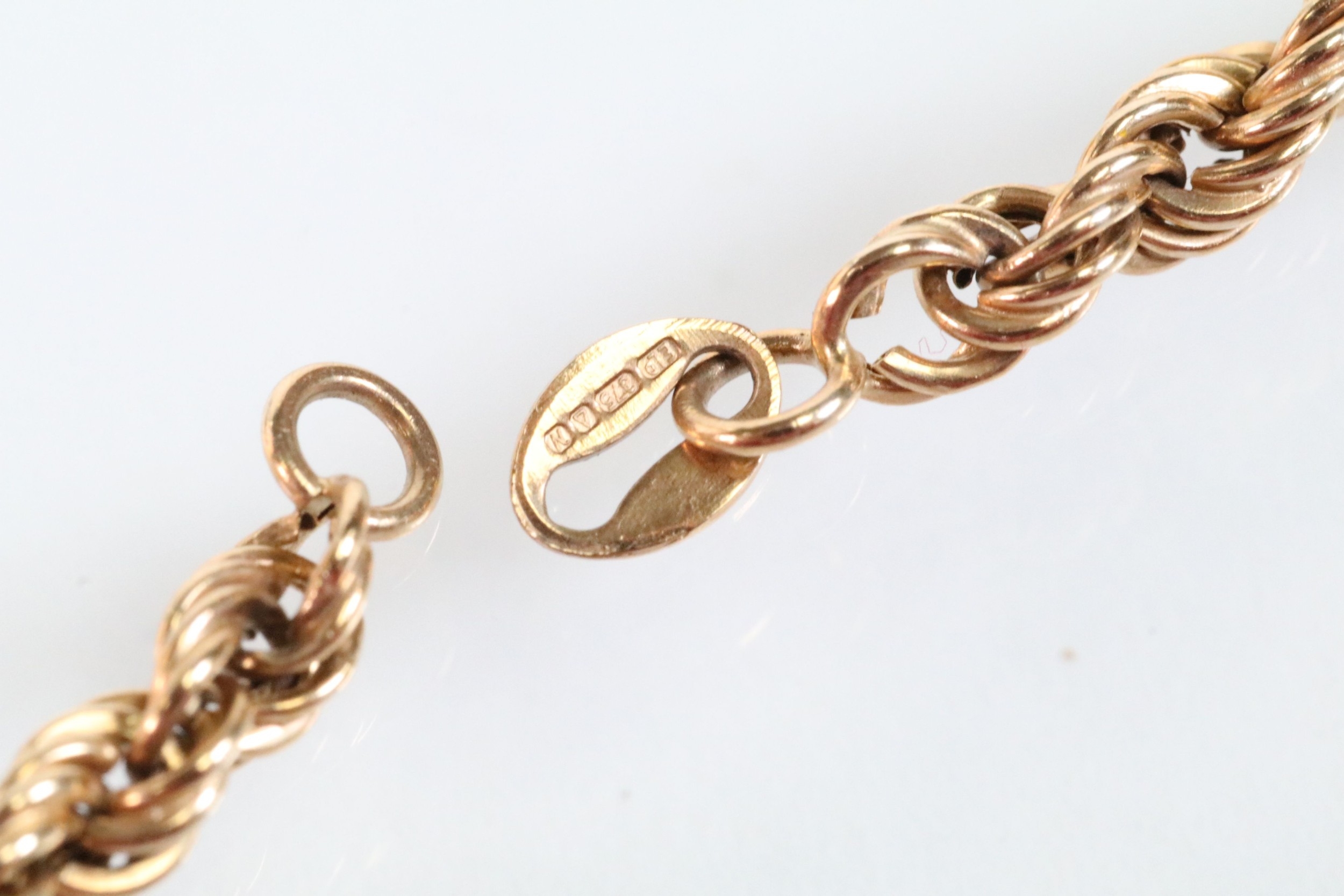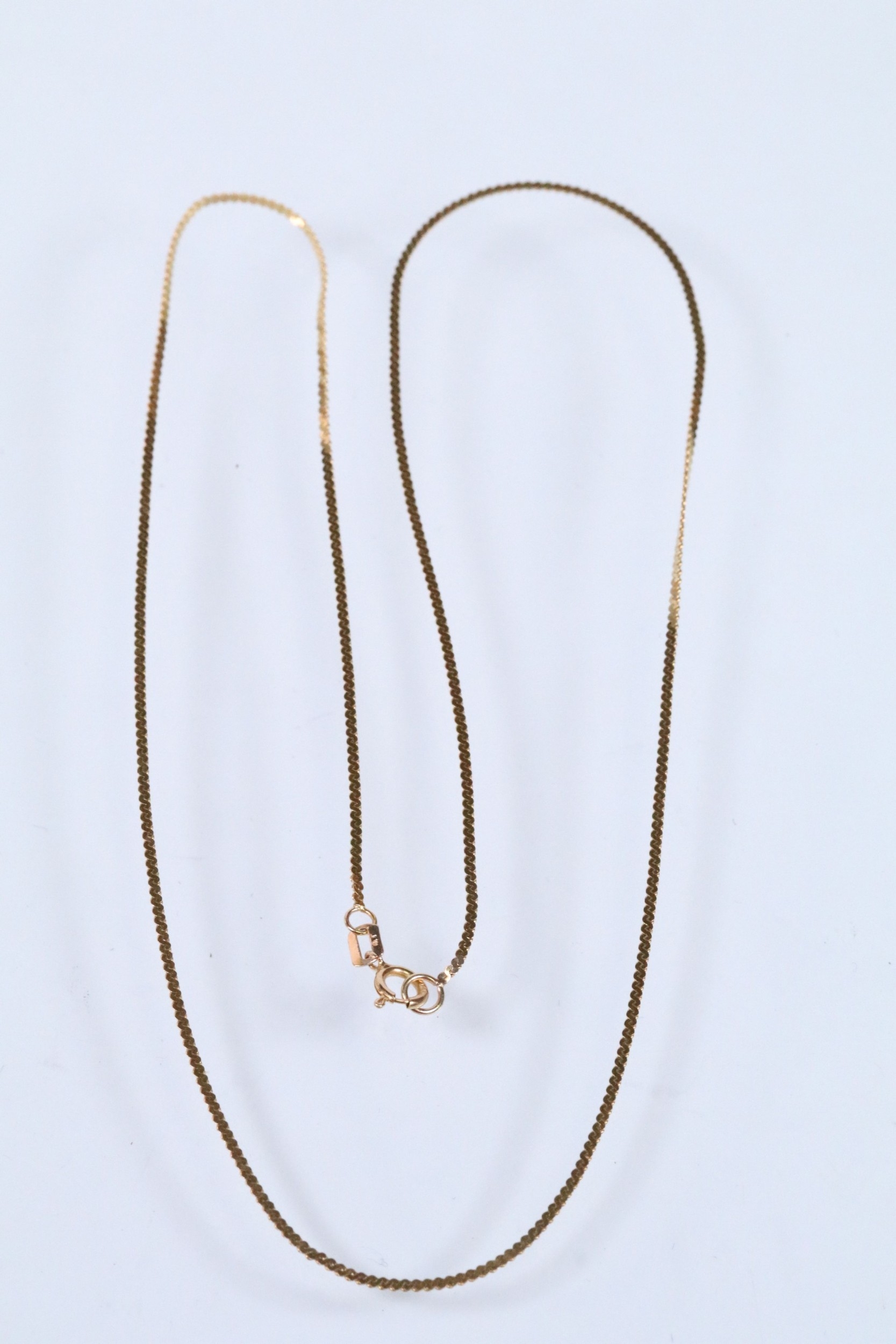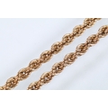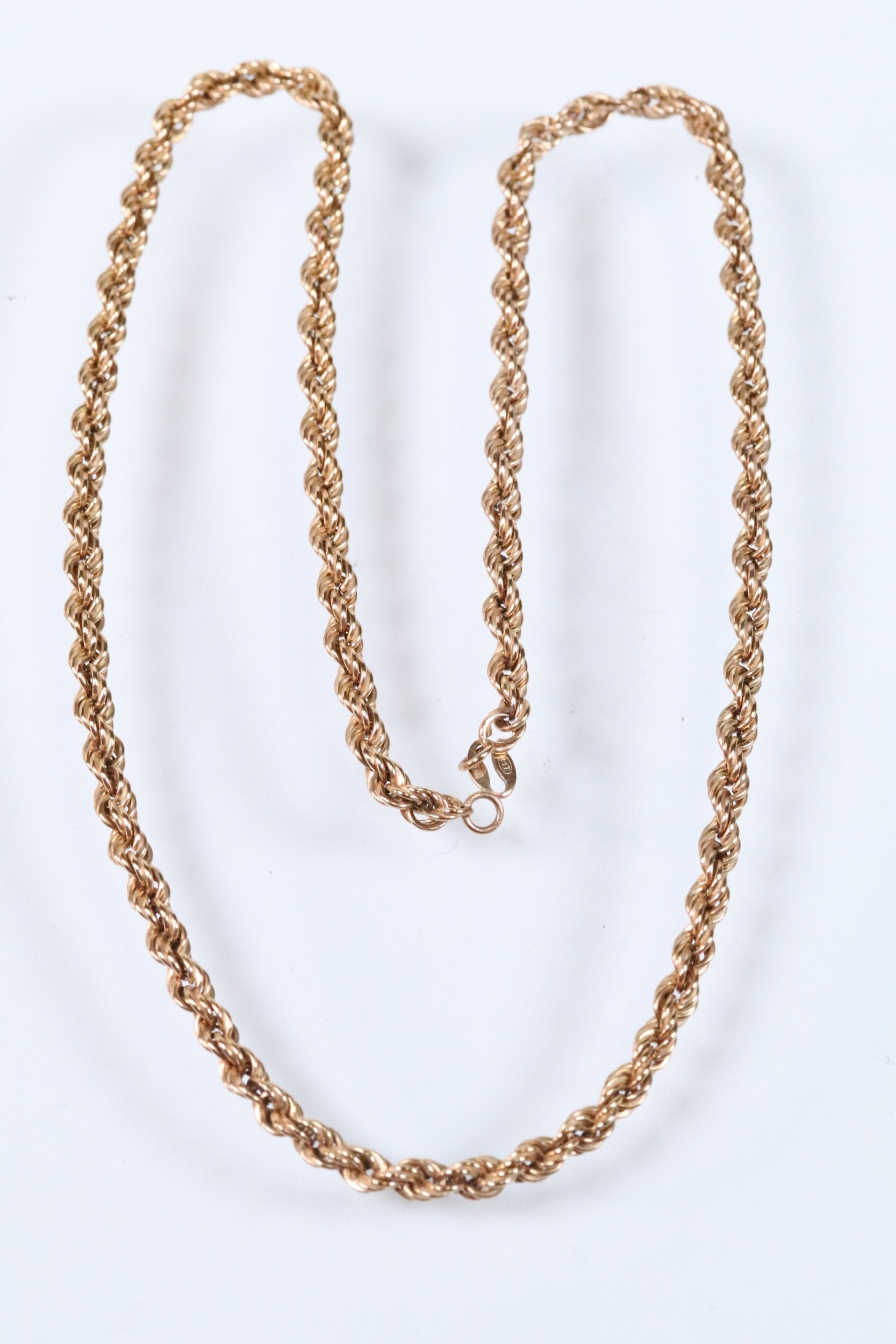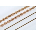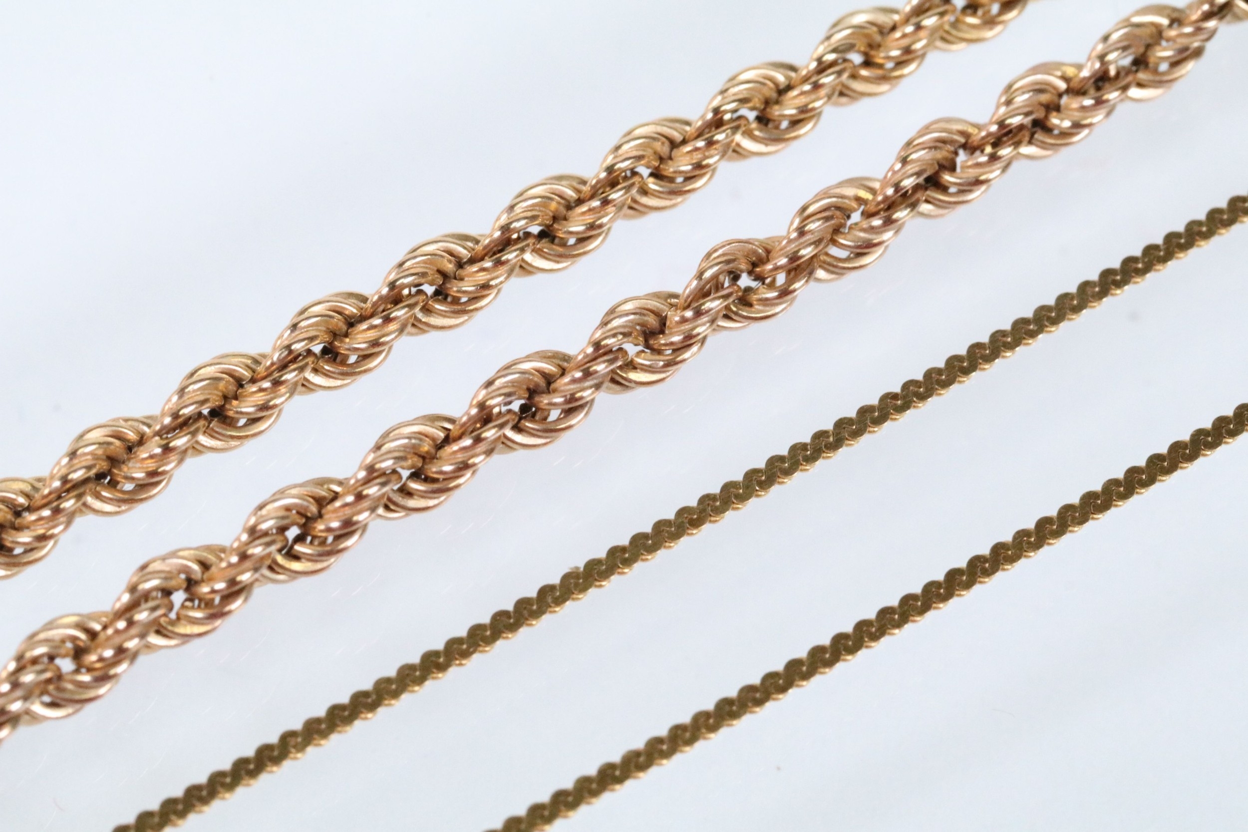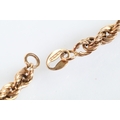 Two gold necklaces to include a rope twist necklace (clasp missing, hallmarked to jump link, measures 15 inches), a 14ct gold flat link necklace chain (marked 14k to jump link, chain measures 18 inches).