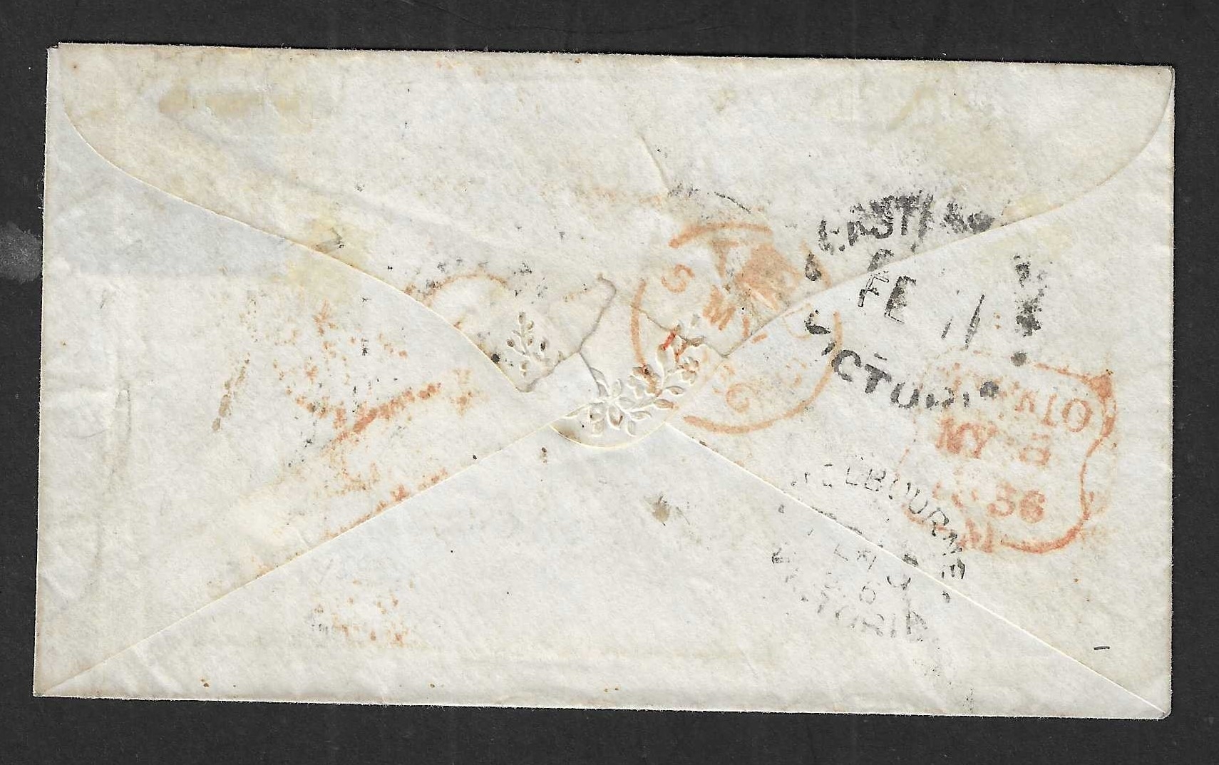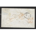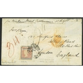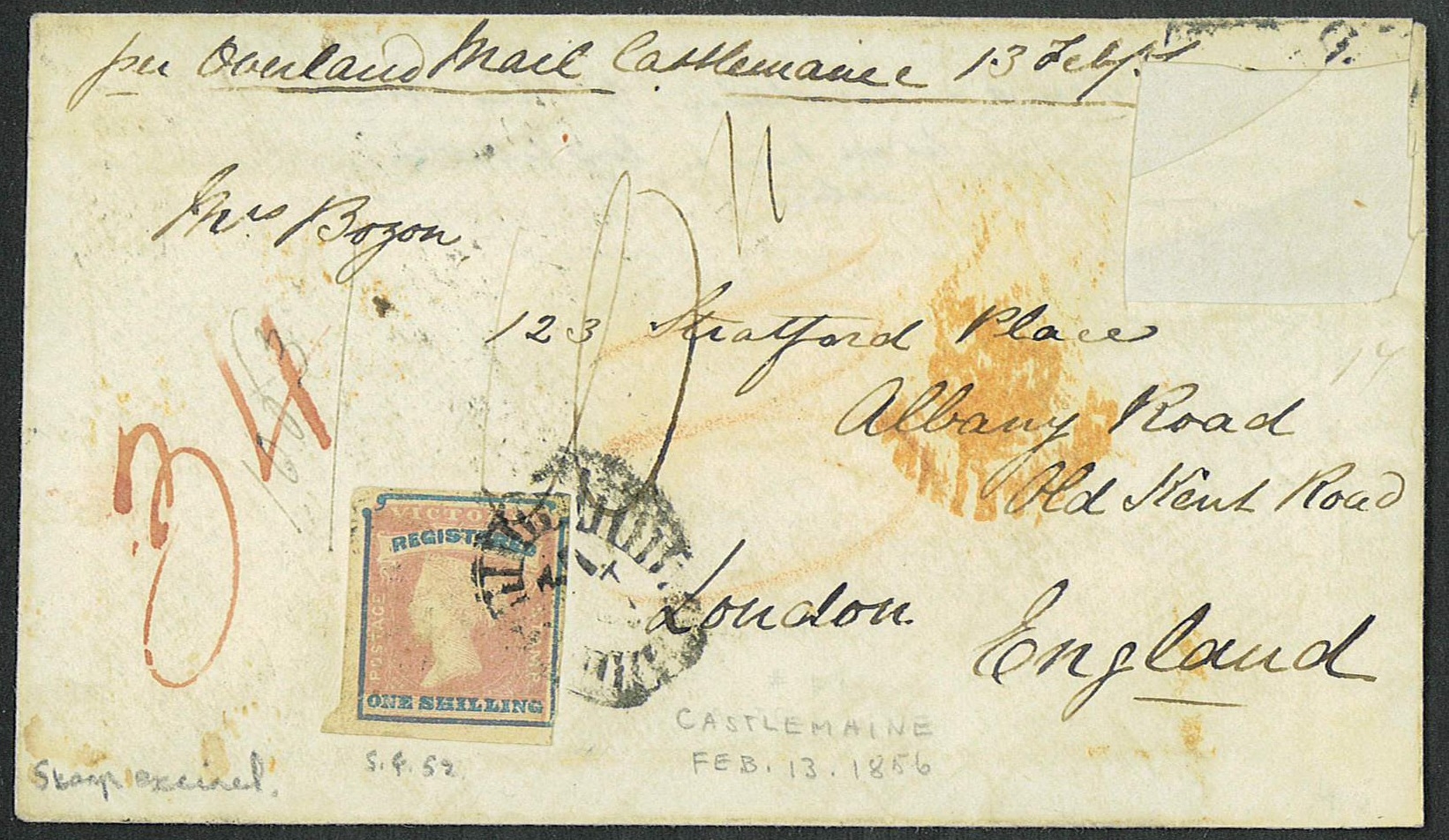 AUSTRALIAN STATES - Victoria: Registered Imperf 1s tied to original 1856 cover Castlemaine to UK, one stamp top right has been removed (cut out) with the 1s four margin example tied oval numeral cancel sent per overland mail Castlemaine, red '34' manuscript charge mark and crayon charge mark, with London Crowned REGISTERED h/s ( smudged) on arrival. Nice range of backstamps. Rated x 8 on cover. SG 34.