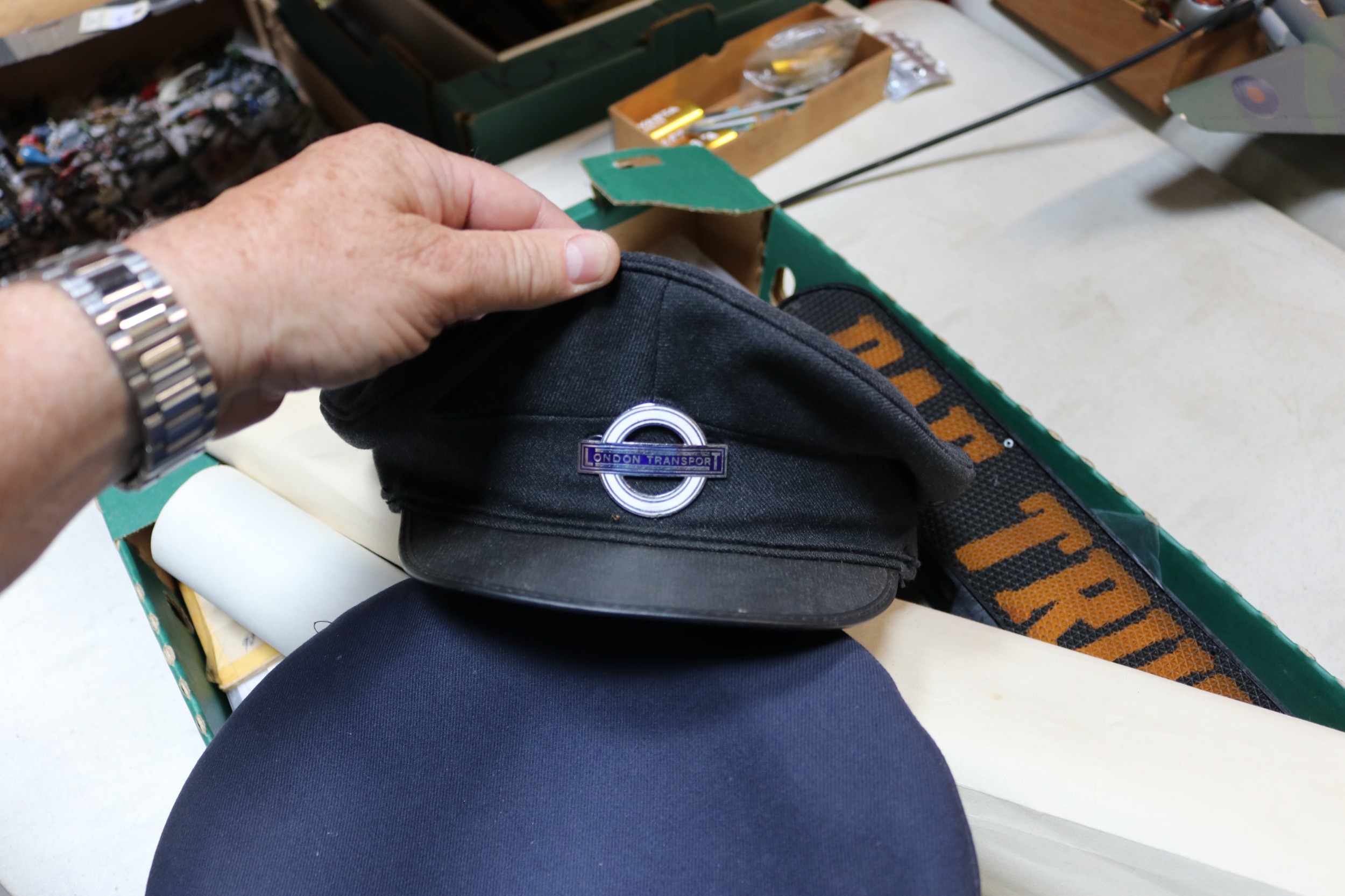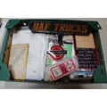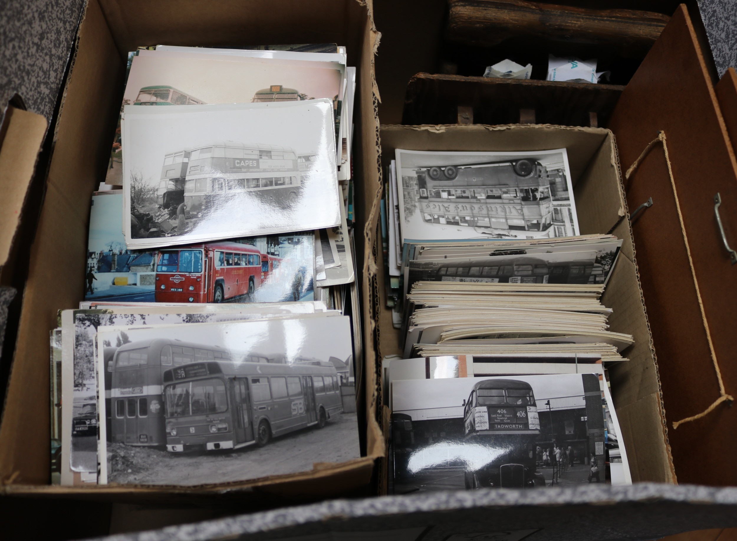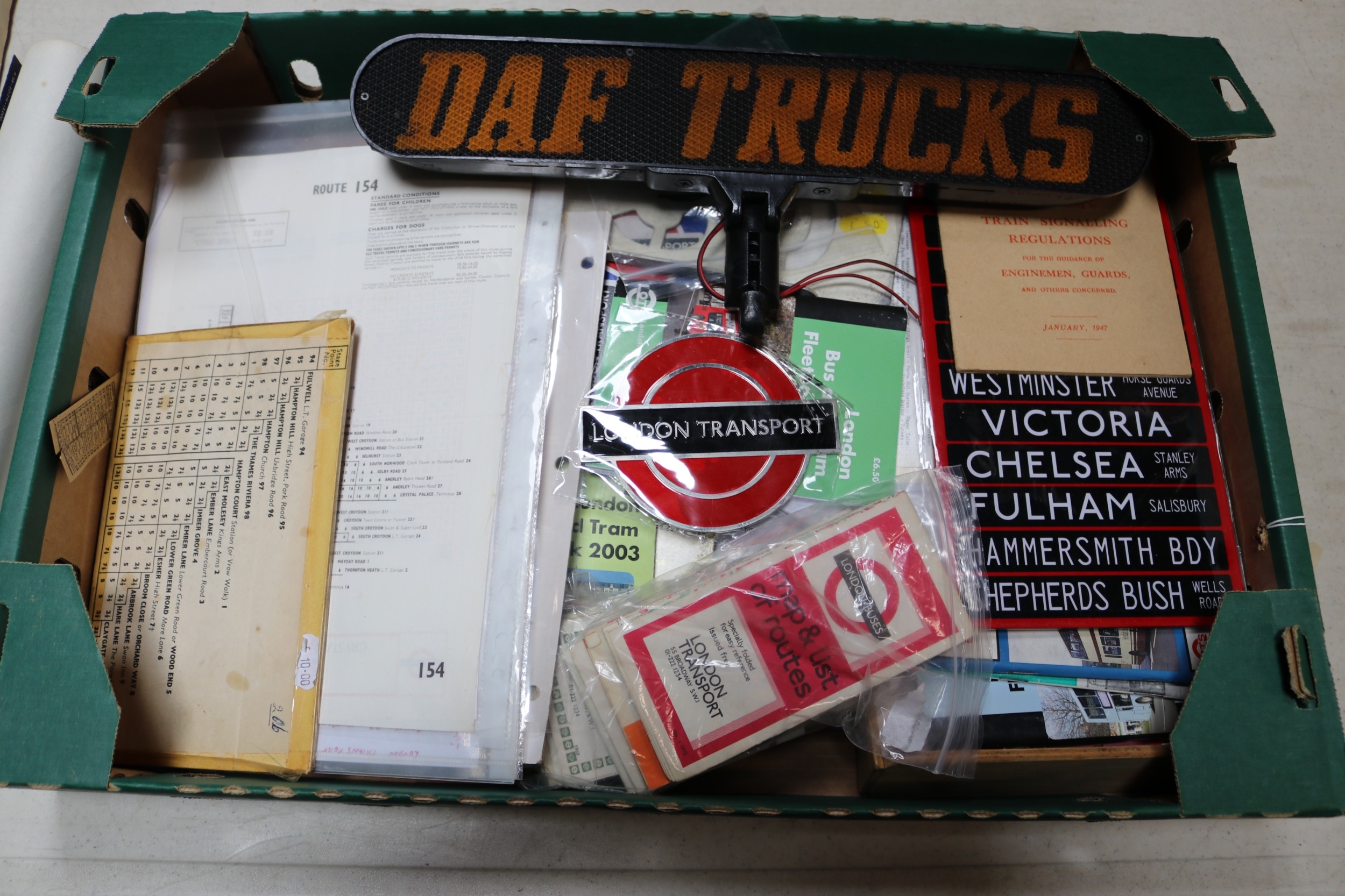 An interesting collection of Bus related ephemera, photographs and postcards. Including maps, bus tickets of various ages, lists of London Transport routes, reproduction signs, a London Transport peaked cap and a London Underground peaked cap. Wooden ticket racks. Aluminium stencils and many black & white and colour photographs and postcards, including a few railway related. Also a DAF Trucks illuminated sign. GC. £70-100