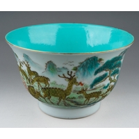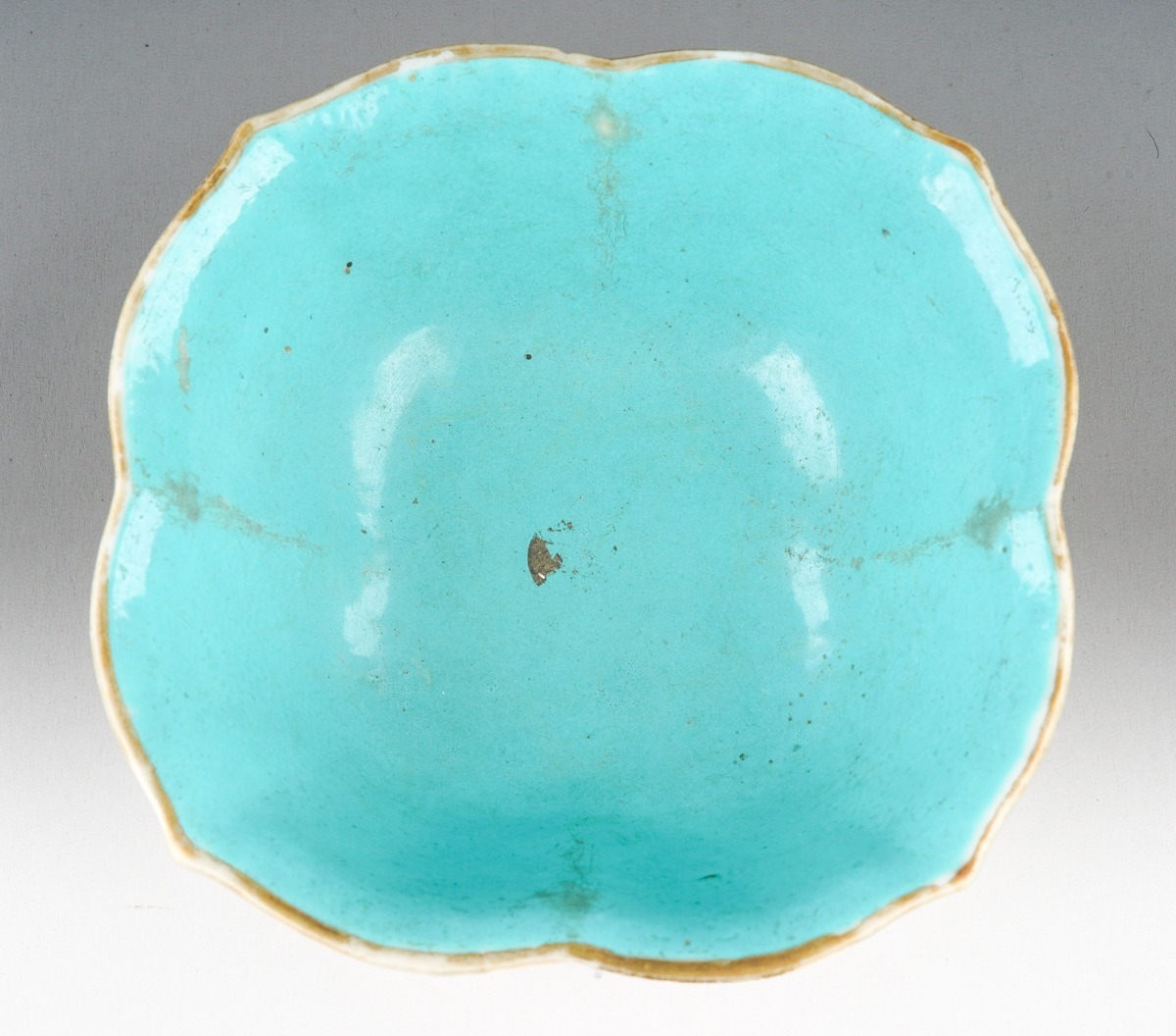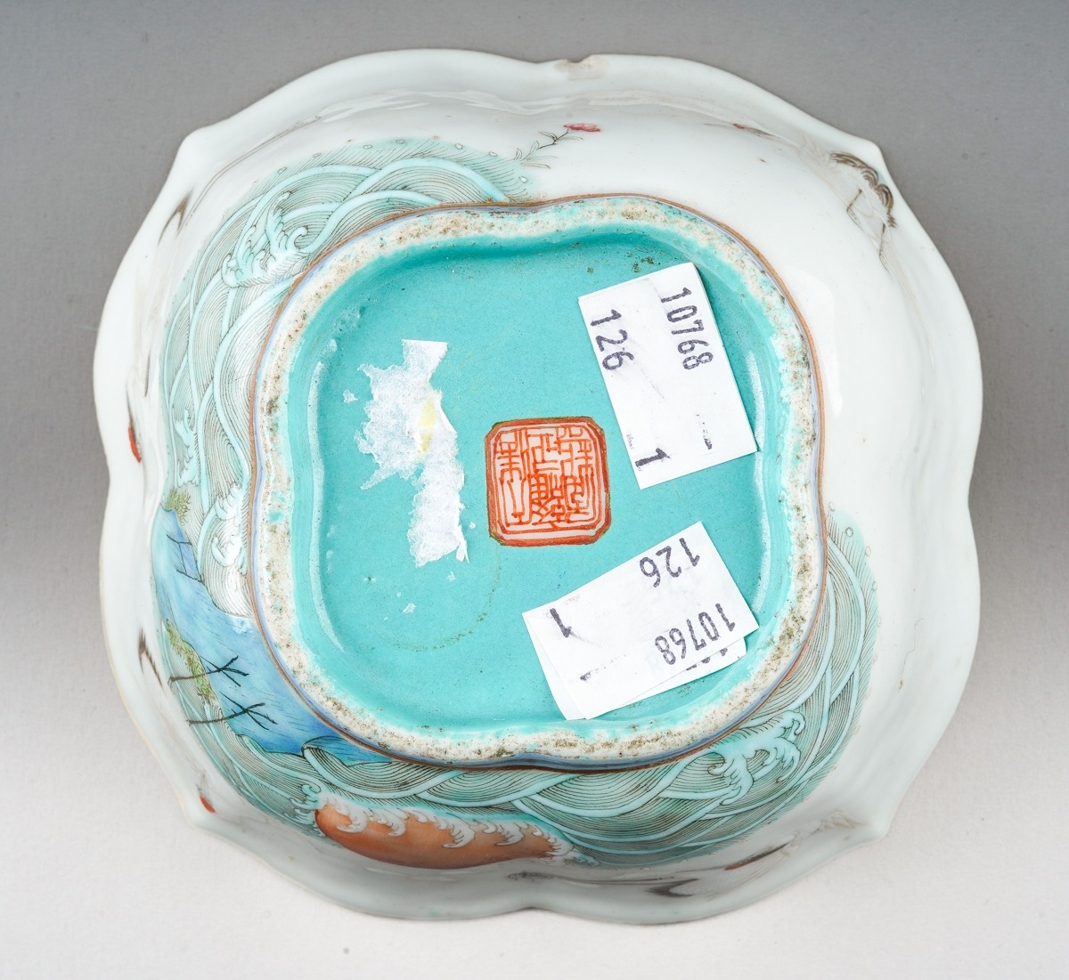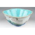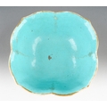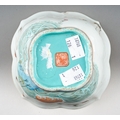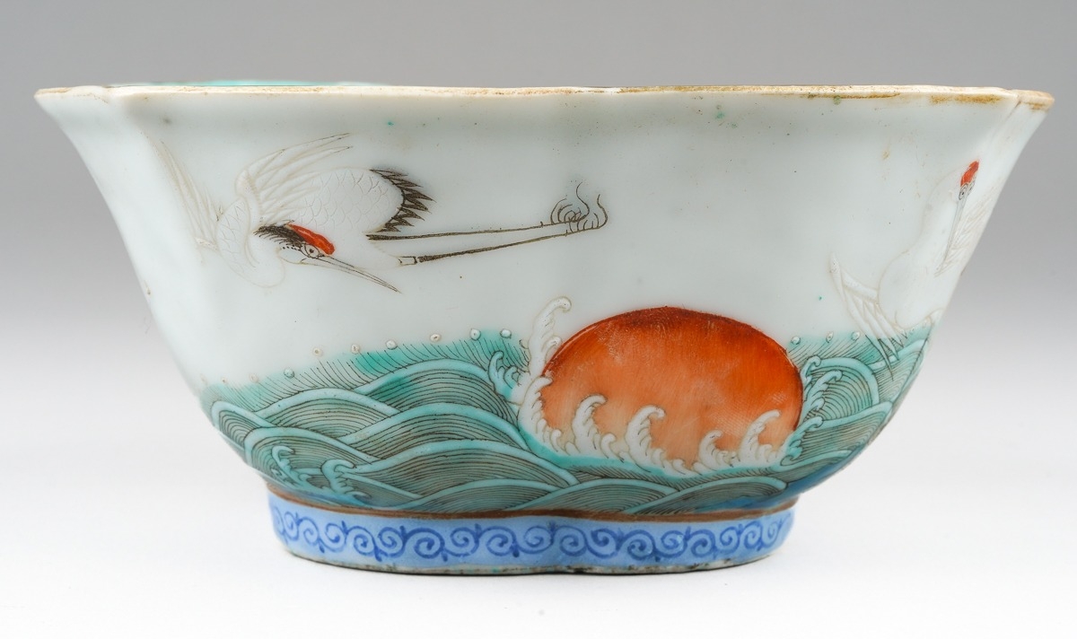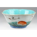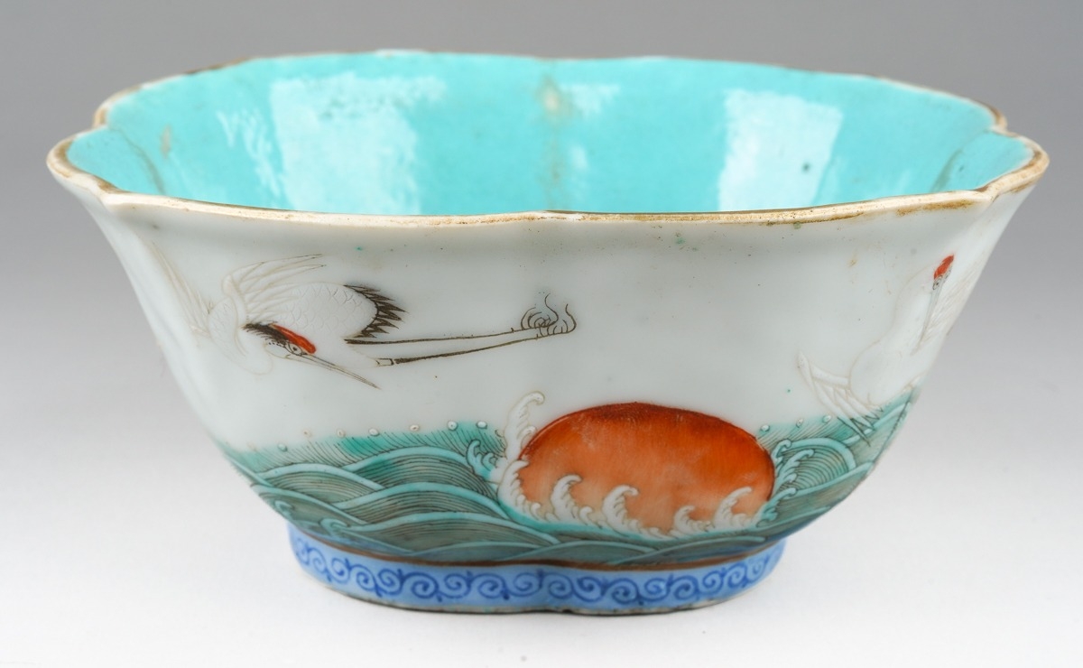 A 19th century Chinese Famille Verte lobed bowl, turquoise interior, enamelled with cranes above water, with seal marks in iron-red, painted with cranes, s.d., width 15.3cm