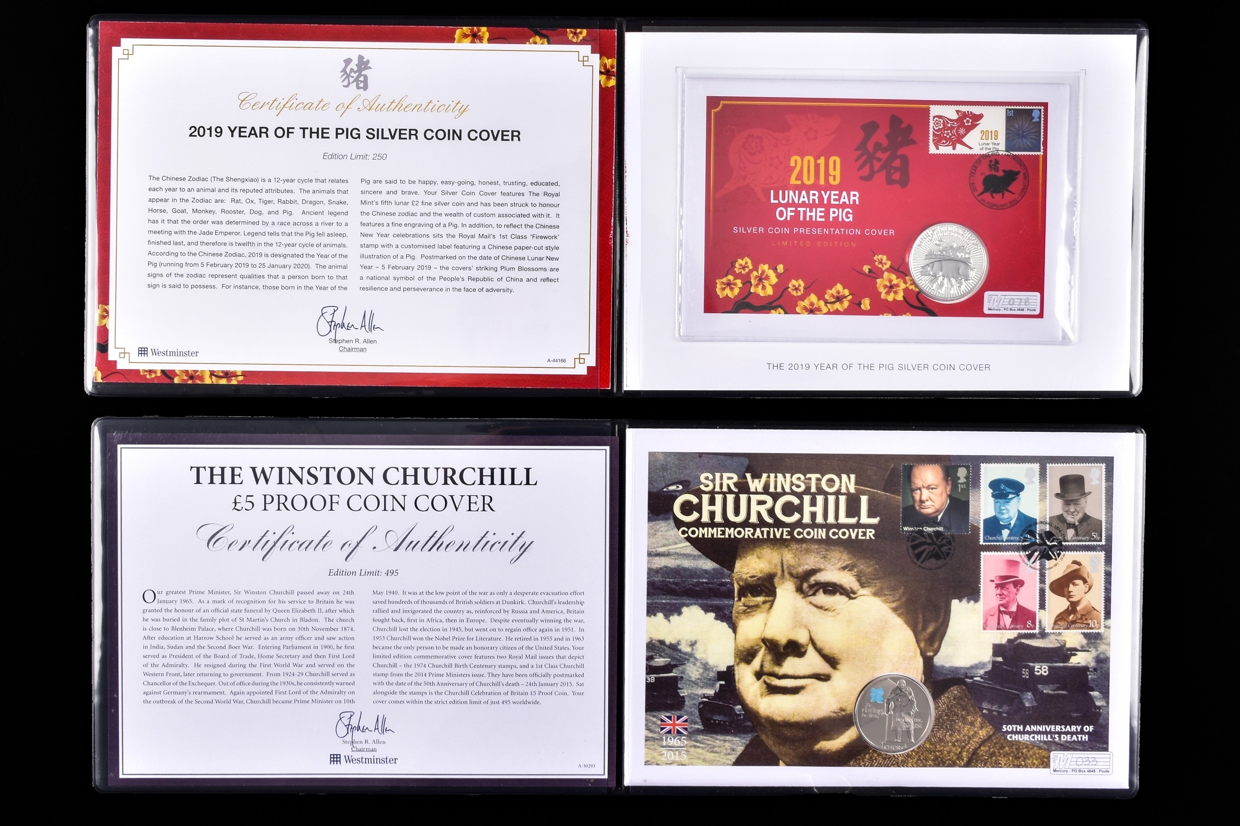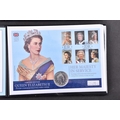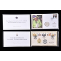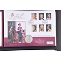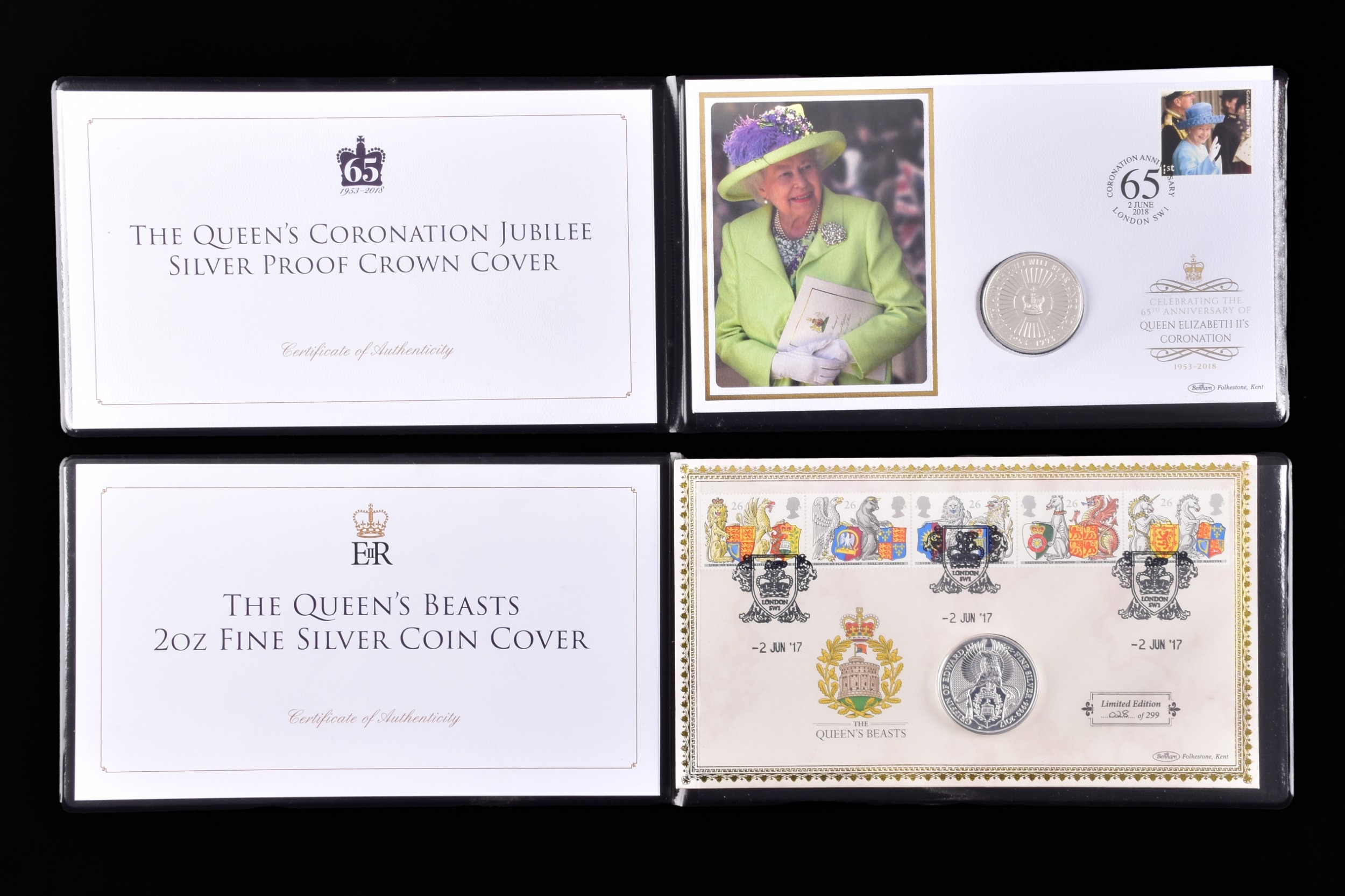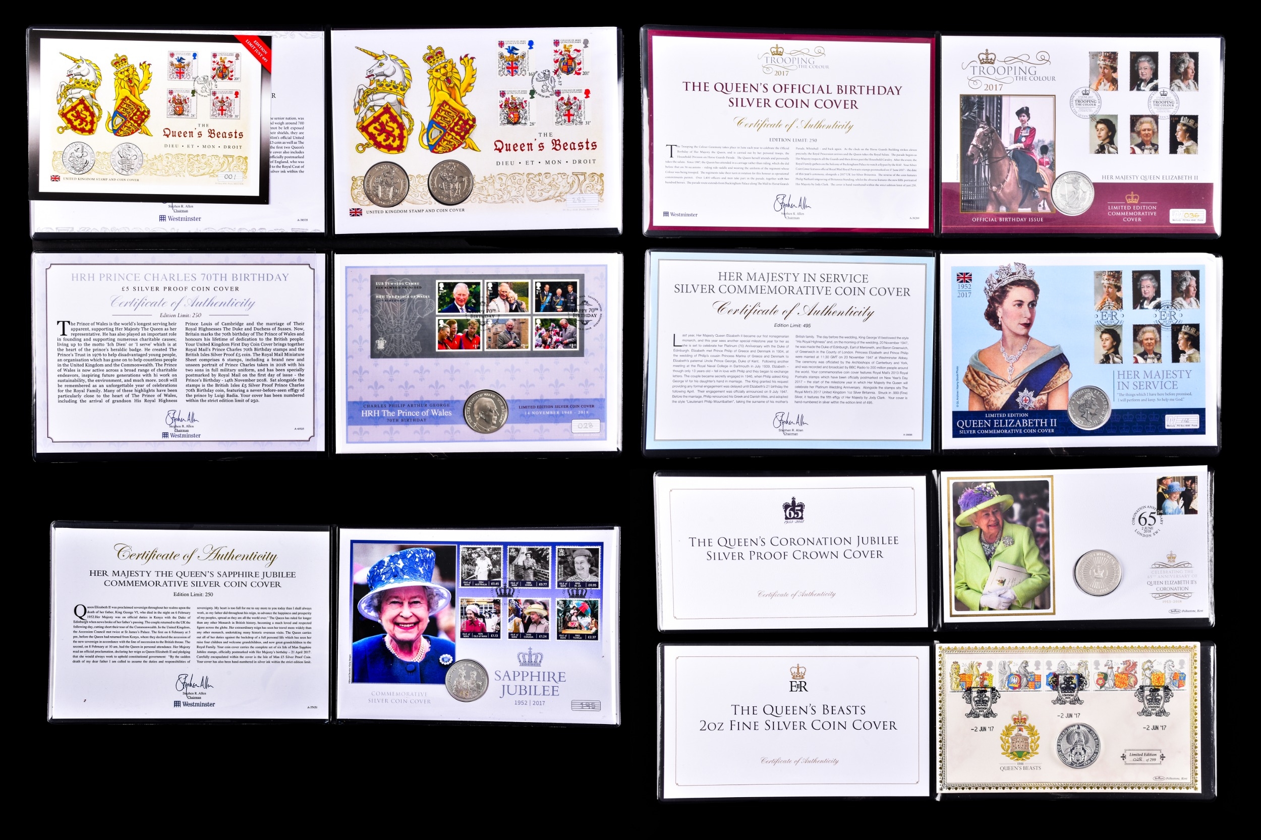 A collection of commemorative coin covers and stamp collections, including a Queen Elizabeth II 65th Coronation Anniversary silver proof coin cover (1953–2018), a 'The Queen’s Beasts' 2oz fine silver coin cover featuring heraldic designs, another Sir Winston Churchill commemorative coin cover marking the 50th anniversary of his death, a 2019 Year of the Pig lunar silver coin cover, an HRH Prince Charles 70th Birthday £5 silver proof coin cover, a Queen Elizabeth II Sapphire Jubilee commemorative silver coin cover (1952–2017), a 2017 Trooping the Colour official birthday silver coin cover, a 'Her Majesty in Service' Queen Elizabeth II commemorative silver coin cover, and a United Kingdom 'The Queen’s Beasts' stamp and double coin cover.