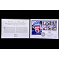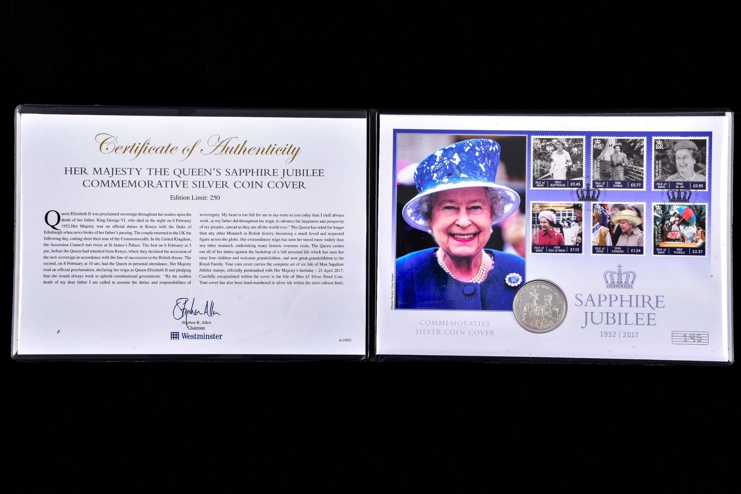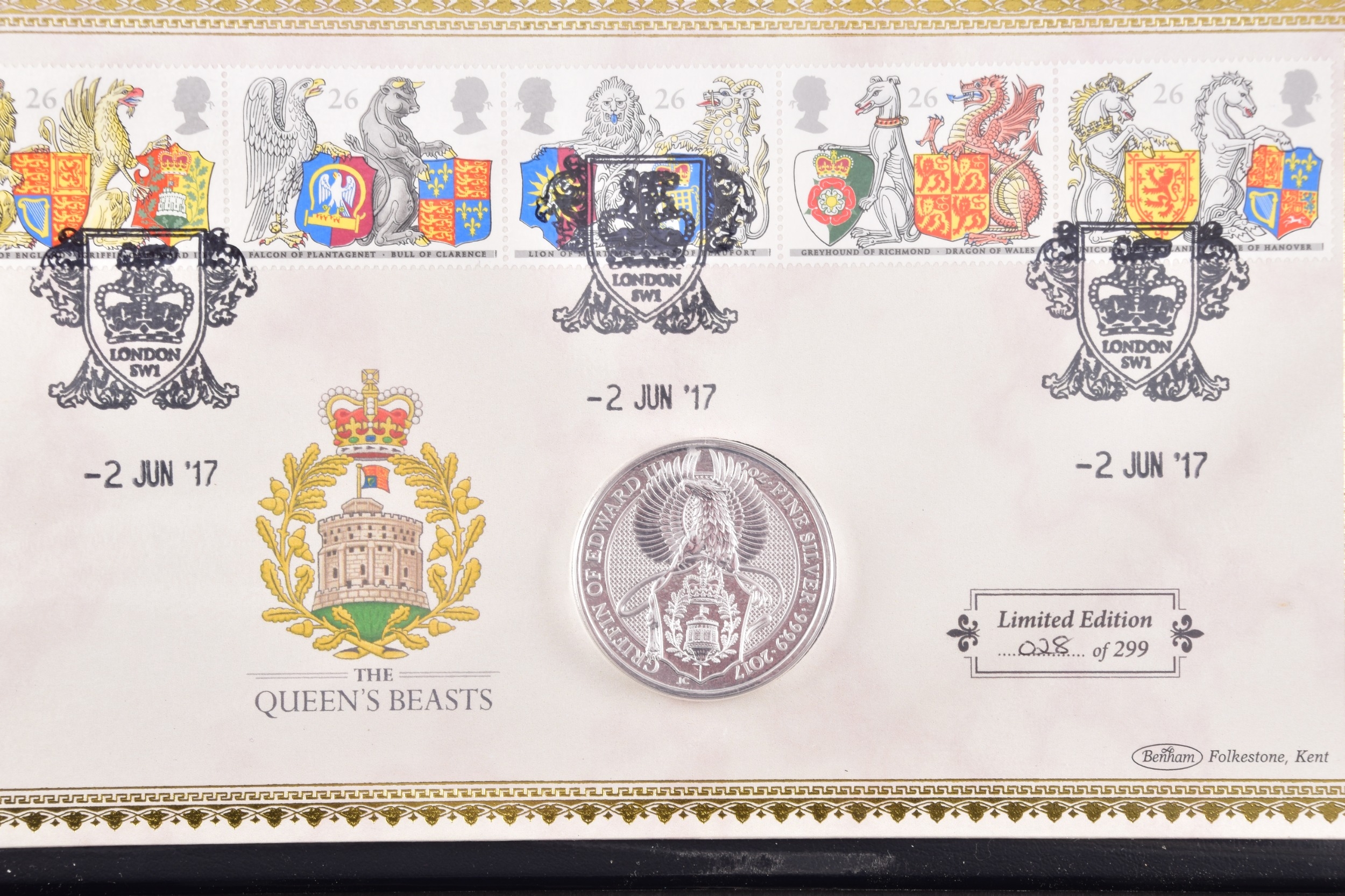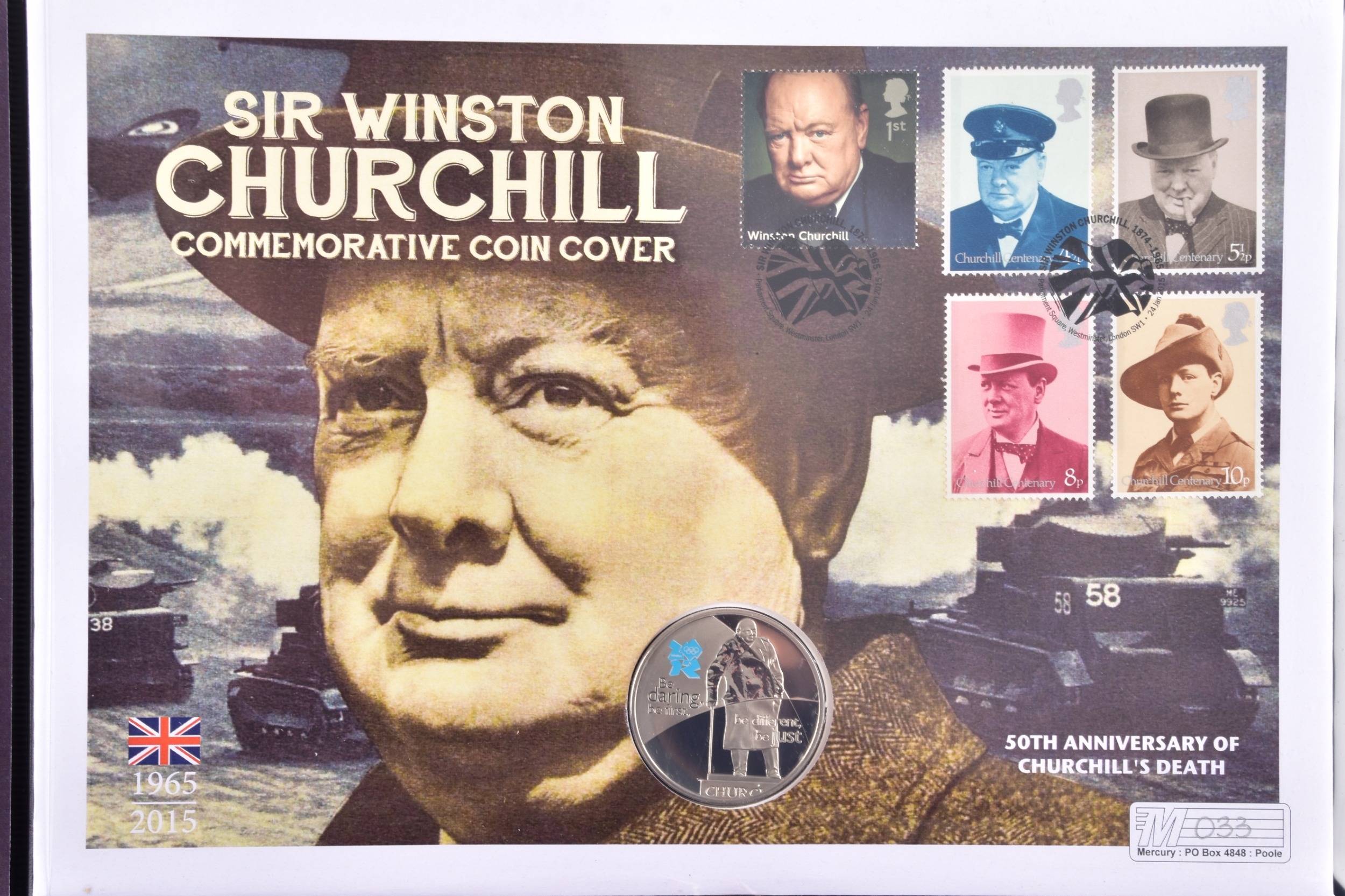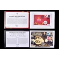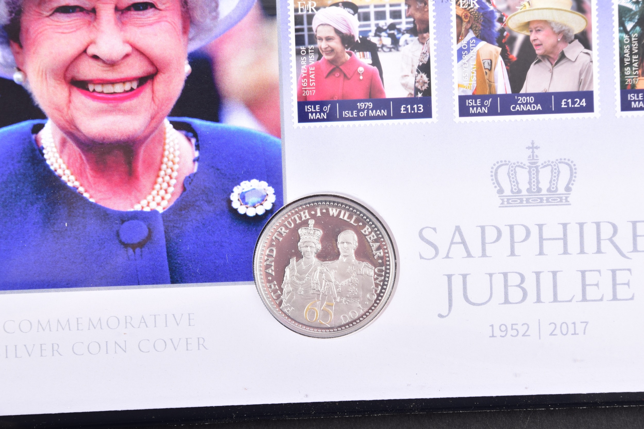A collection of commemorative coin covers and stamp collections, including a Queen Elizabeth II 65th Coronation Anniversary silver proof coin cover (1953–2018), a 'The Queen’s Beasts' 2oz fine silver coin cover featuring heraldic designs, another Sir Winston Churchill commemorative coin cover marking the 50th anniversary of his death, a 2019 Year of the Pig lunar silver coin cover, an HRH Prince Charles 70th Birthday £5 silver proof coin cover, a Queen Elizabeth II Sapphire Jubilee commemorative silver coin cover (1952–2017), a 2017 Trooping the Colour official birthday silver coin cover, a 'Her Majesty in Service' Queen Elizabeth II commemorative silver coin cover, and a United Kingdom 'The Queen’s Beasts' stamp and double coin cover.