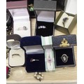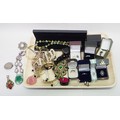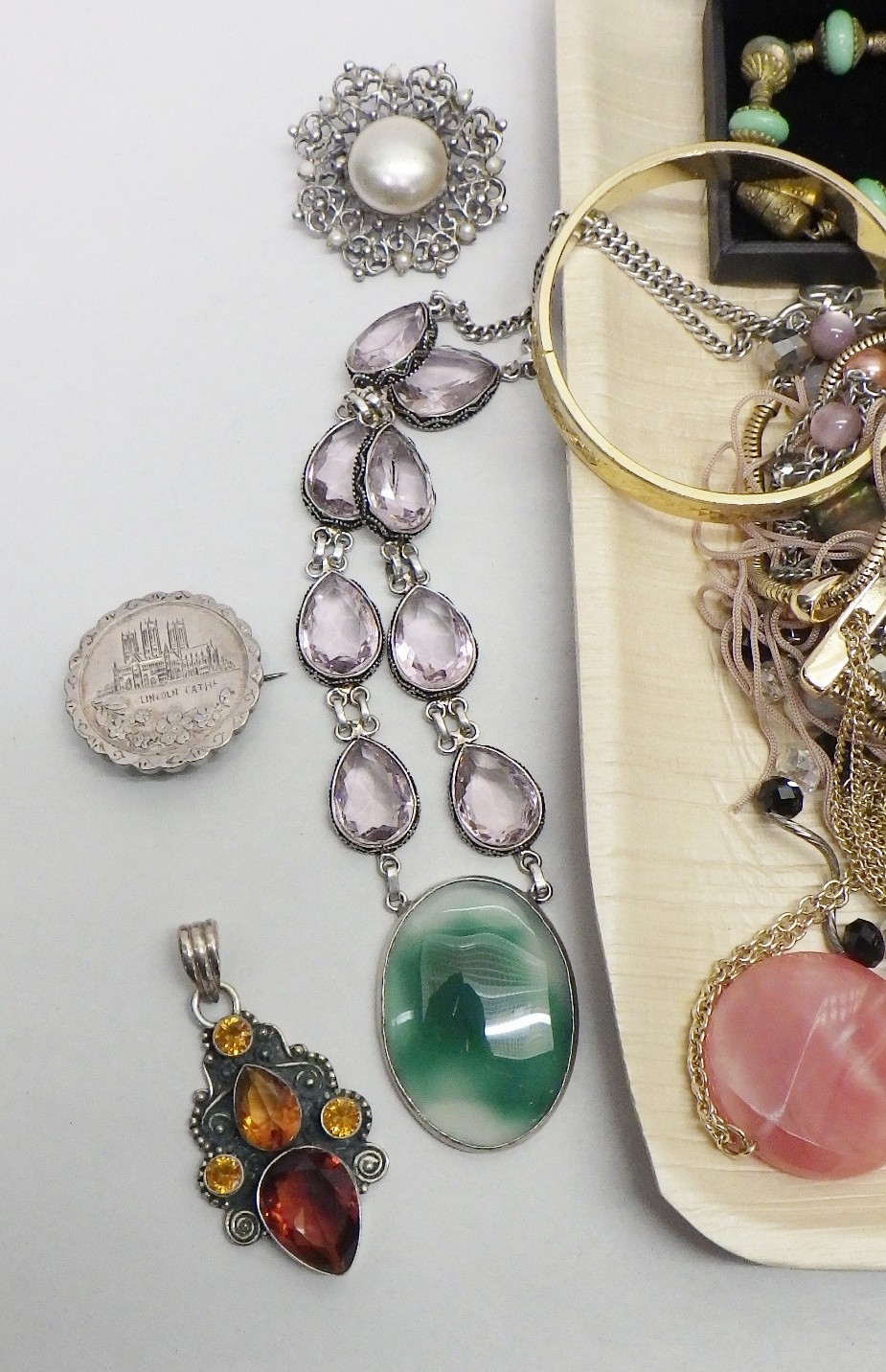 Eight various stone set white metal dress rings; a vintage silver "Lincoln Cathedral" souvenir brooch; costume jewellery incl necklaces
