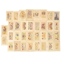 WW1 Interest. A collection of silk embroidered cards. One embroidered with the crest of the Royal Field Artillery, one with a scene of Albert dated 1914, some with faint inscriptions, the collection have been removed from an album and have red cardboard residue to the backs, approx 35 cards.