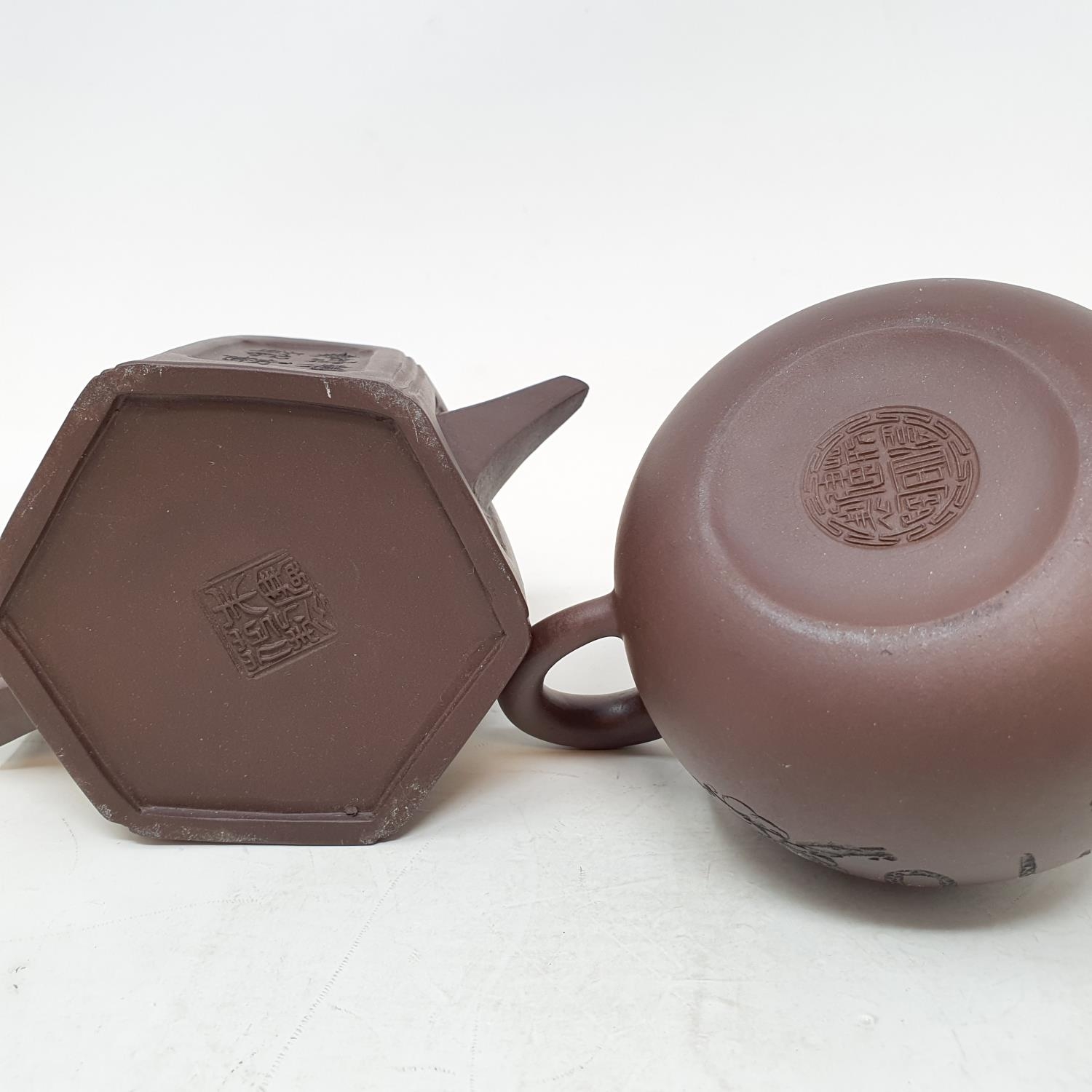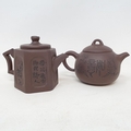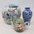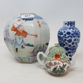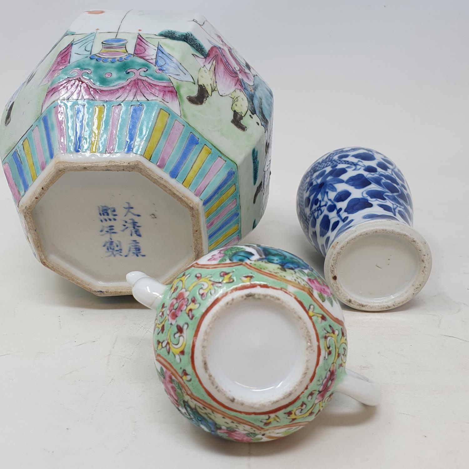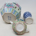 A Chinese famille rose hexagonal ginger jar, some restoration six character mark in underglaze blue, assorted Chinese Yixing teapots and other items (box)