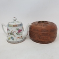 Cantonese pot and cover v small rim chips, cover slightly larger