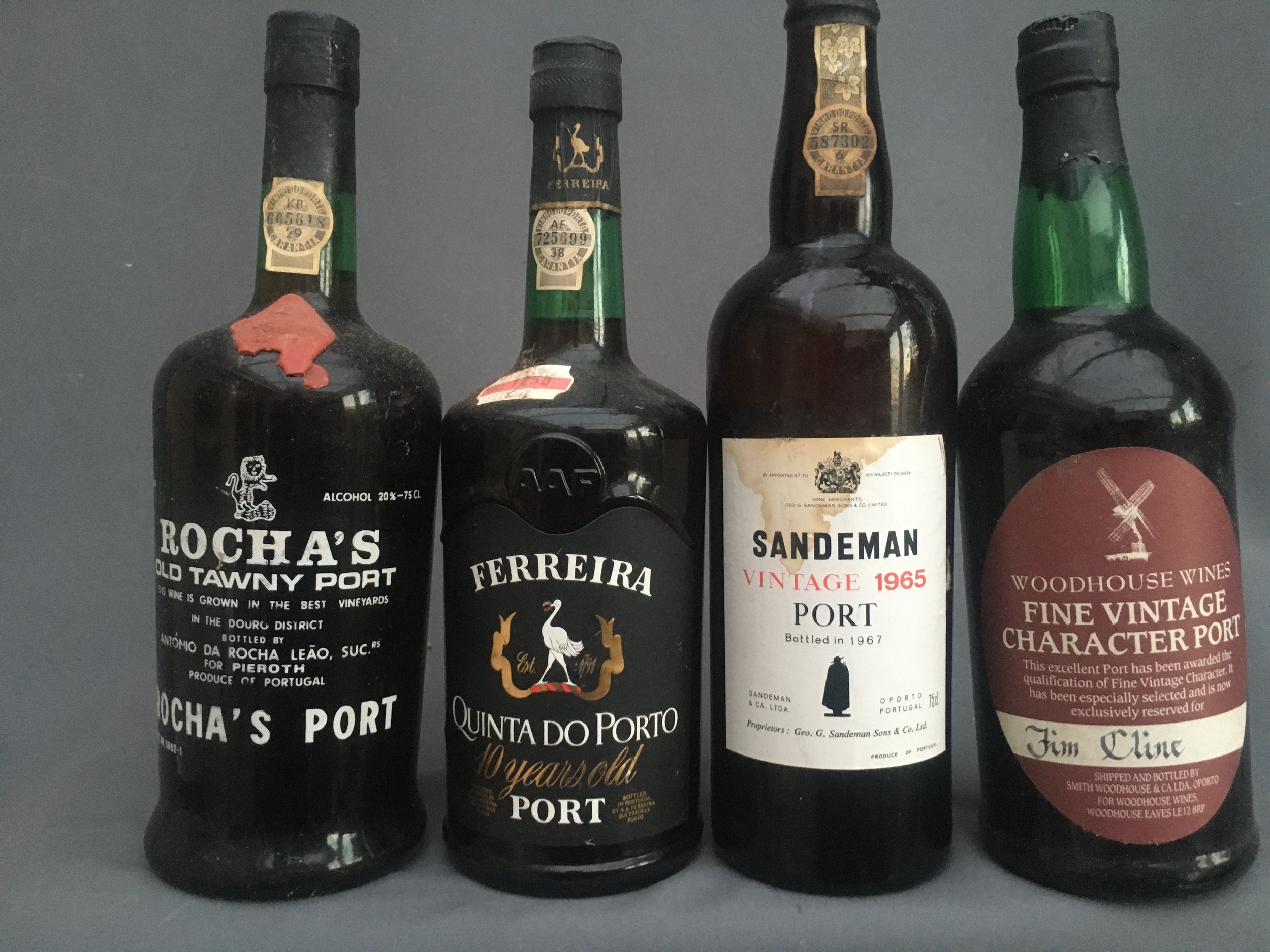 Four bottles of vintage port to include SANDEMAN 1965, bottled in 1967, 75cl no abv. stated, WOODHOUSE WINES Vintage port 20% abv. 70cl. ROCHA'S Old Tawny Port 20% abv. 26 2/3 fluid ounces and FERREIRA 1974/5 Quinta Do Porto 10 year old vintage port, bottled in 1985 19.5 % no vol. stated. (4)