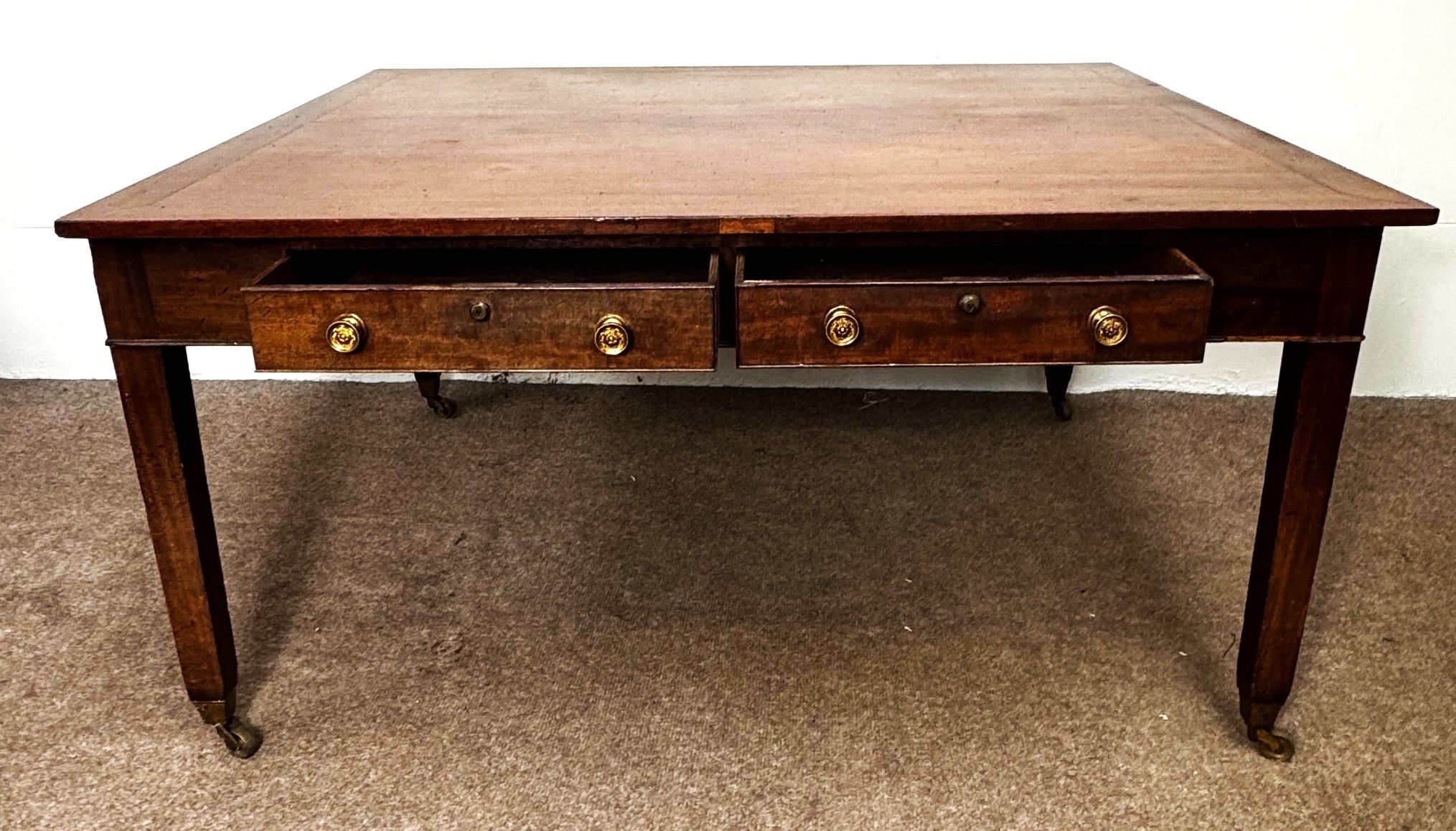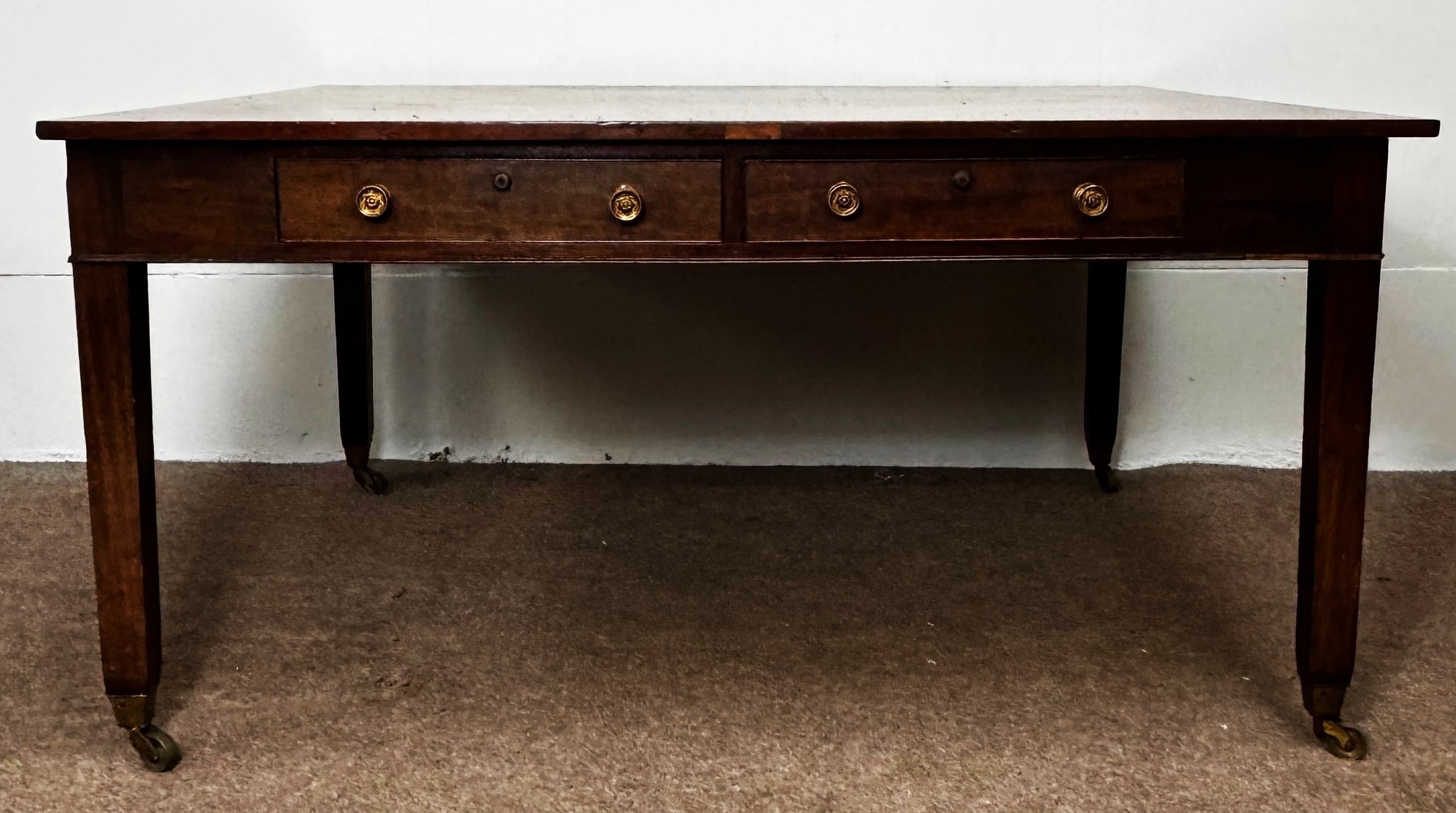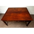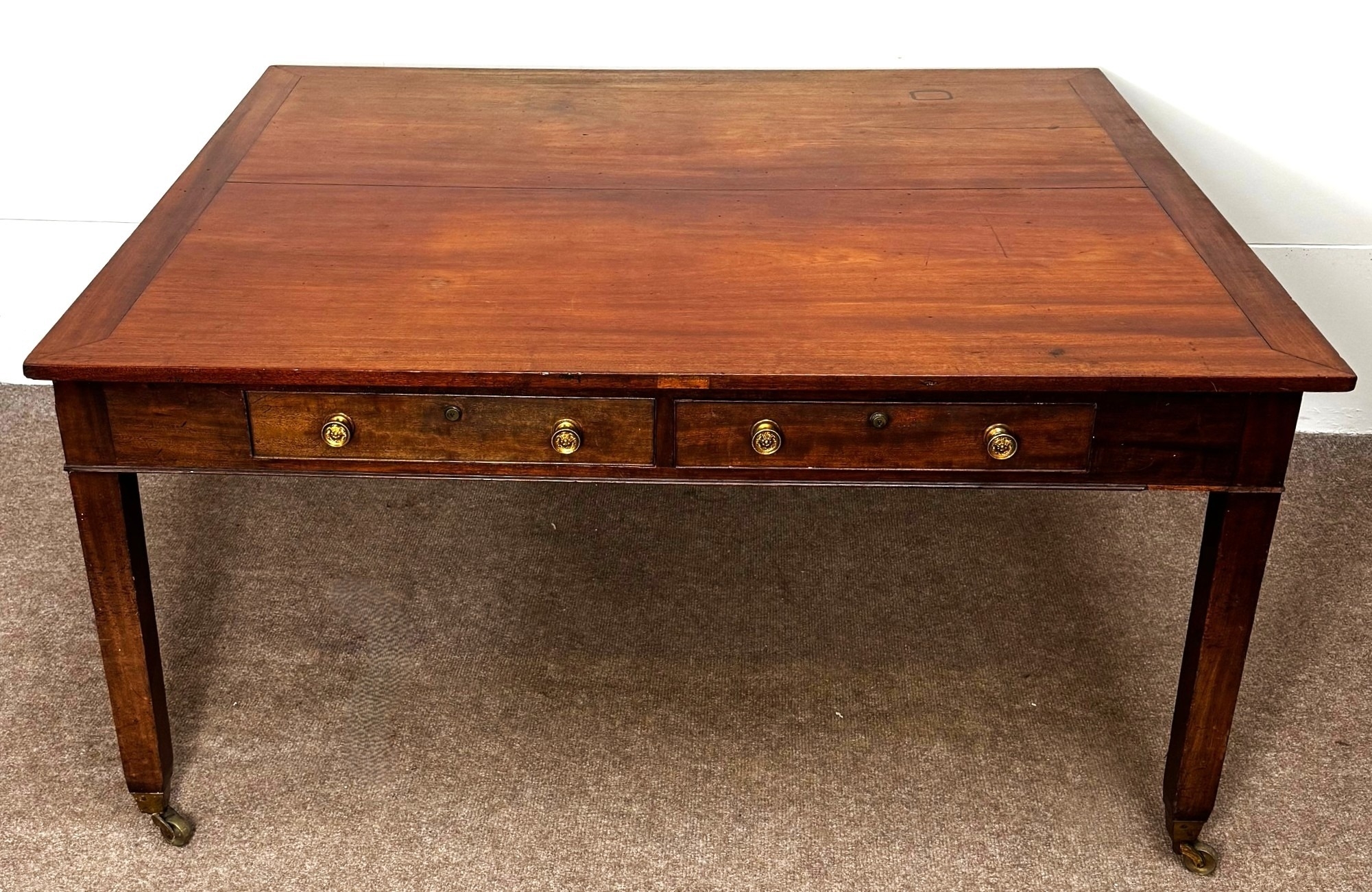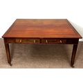 A George III mahogany rectangular Library/ dining table, circa 1800, the oblong top (loose) with cleated ends, over four frieze drawers, on square legs with brass castors; 72cm high,146cm width, 123cm depth