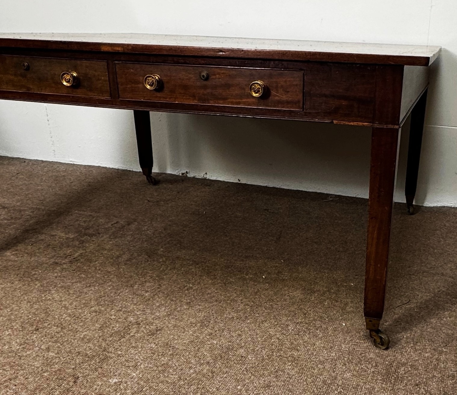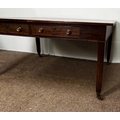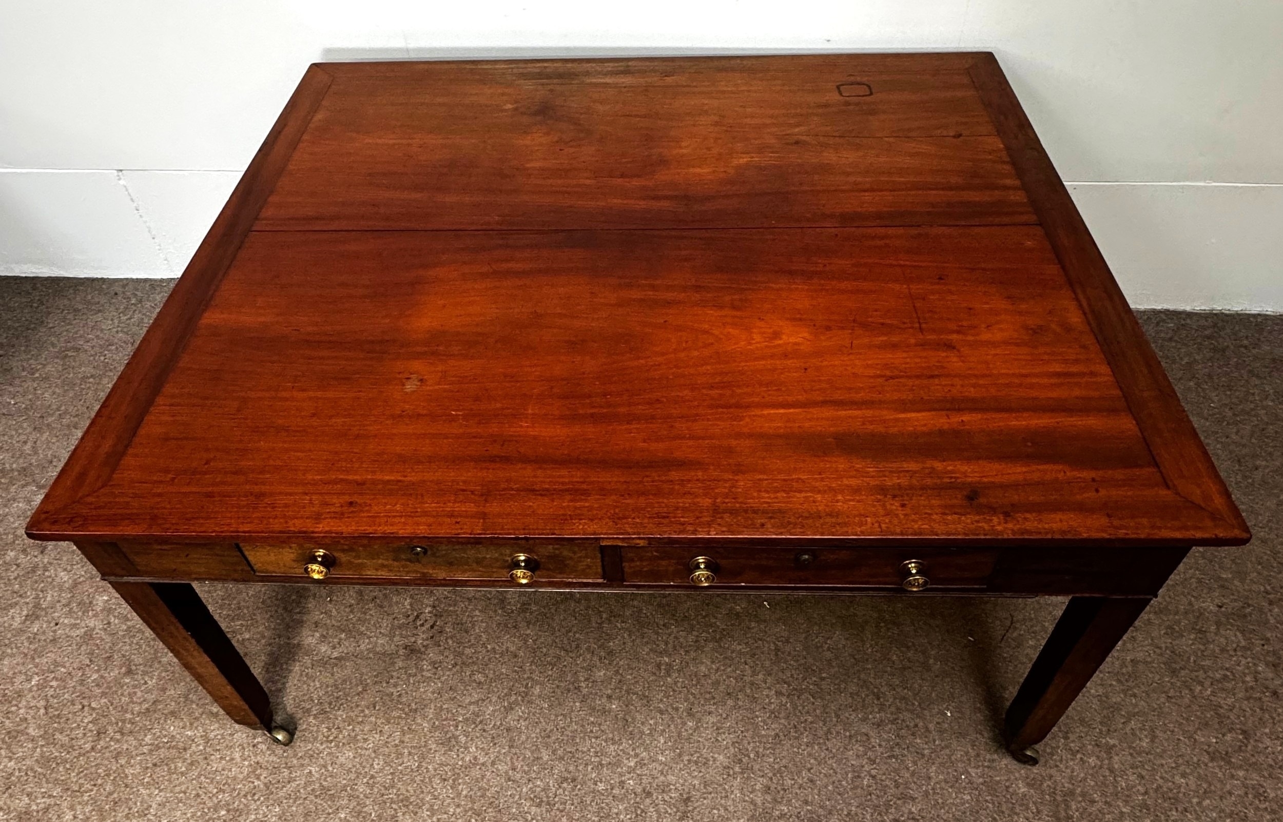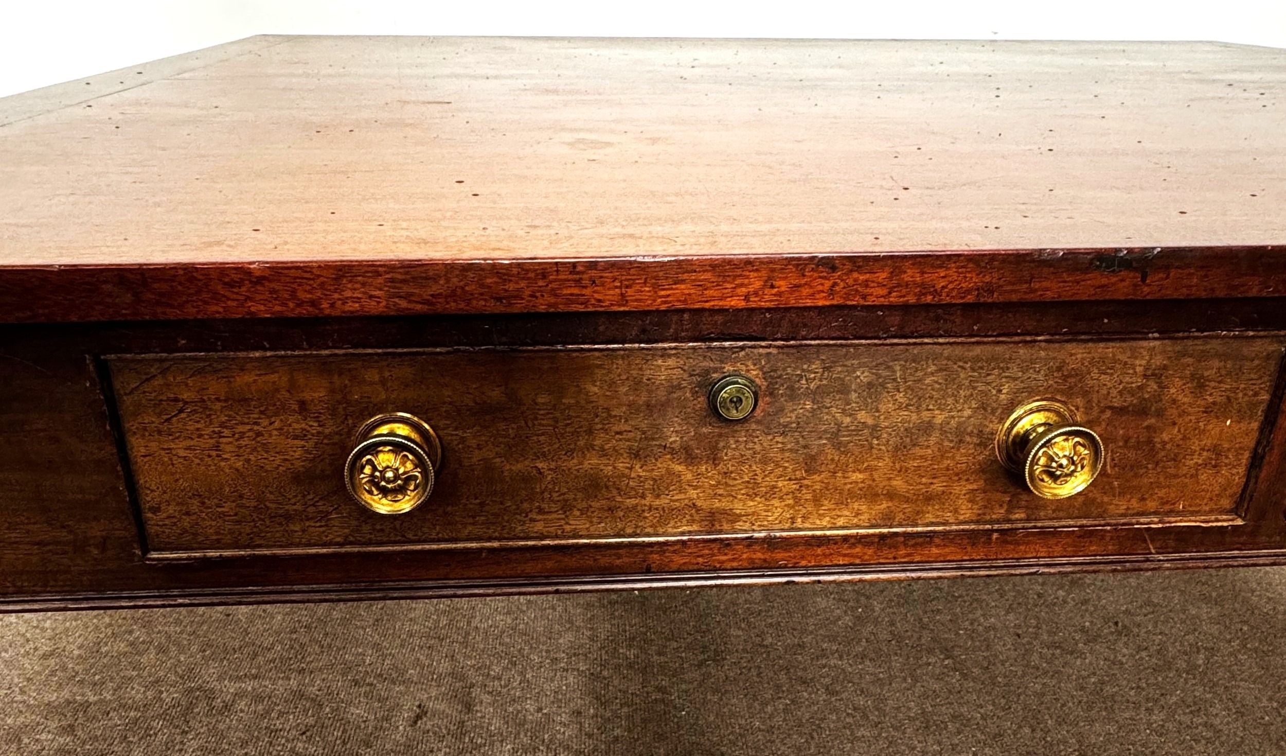 A George III mahogany rectangular Library/ dining table, circa 1800, the oblong top (loose) with cleated ends, over four frieze drawers, on square legs with brass castors; 72cm high,146cm width, 123cm depth
