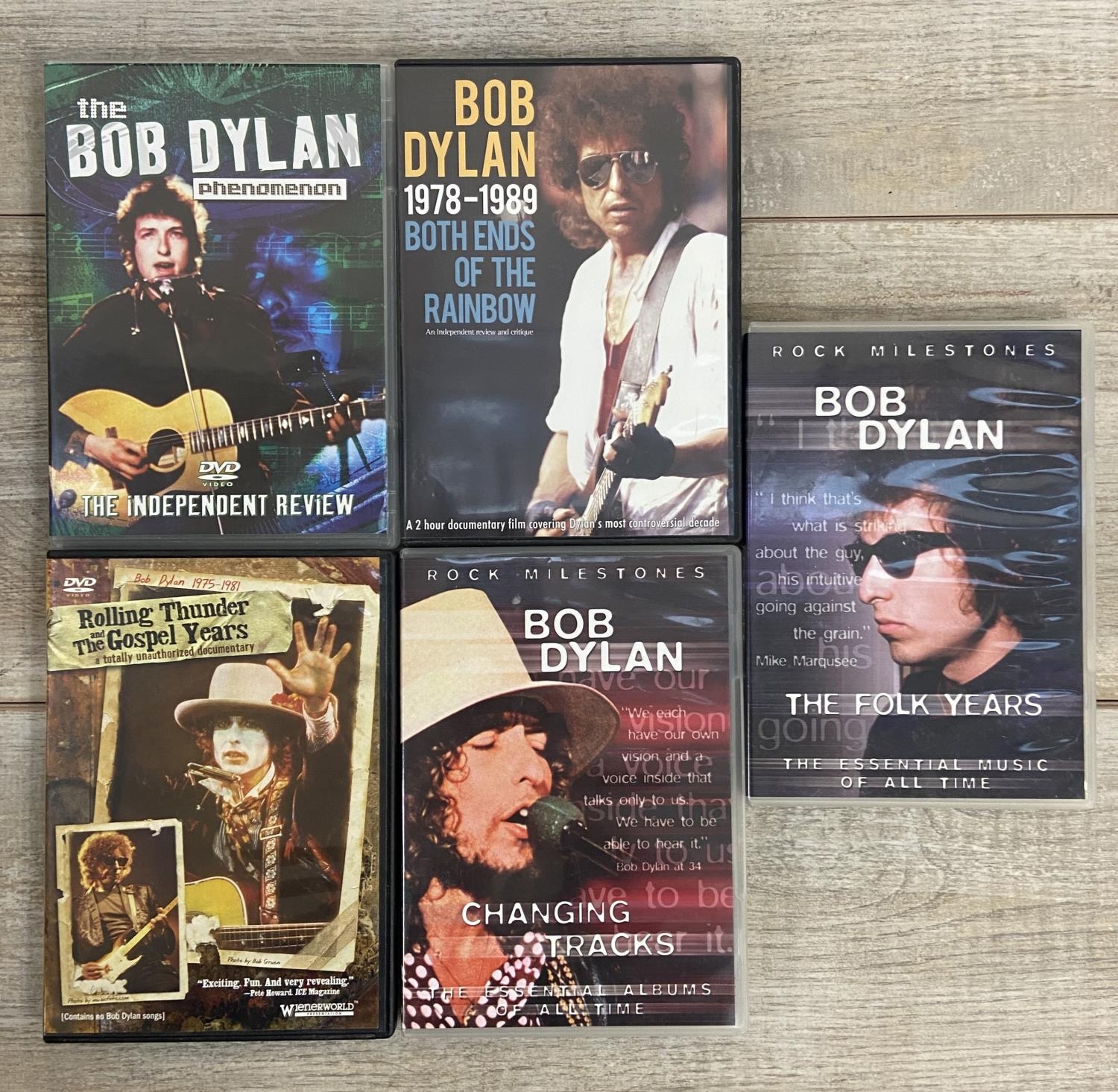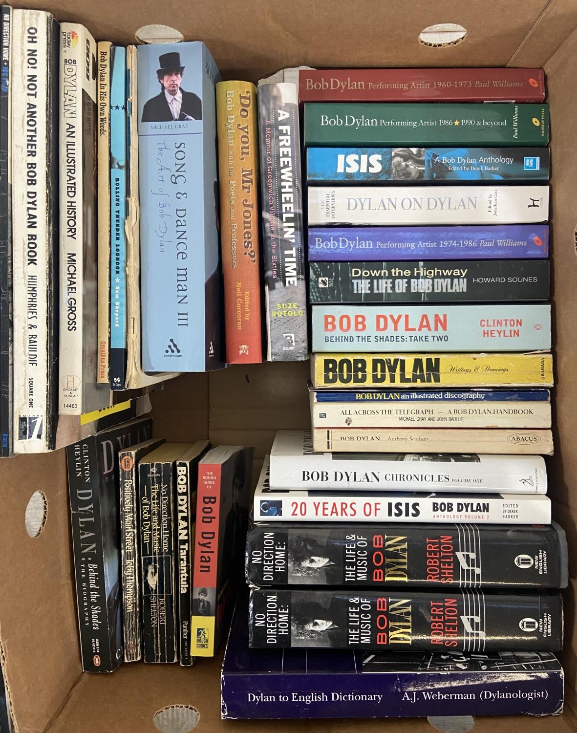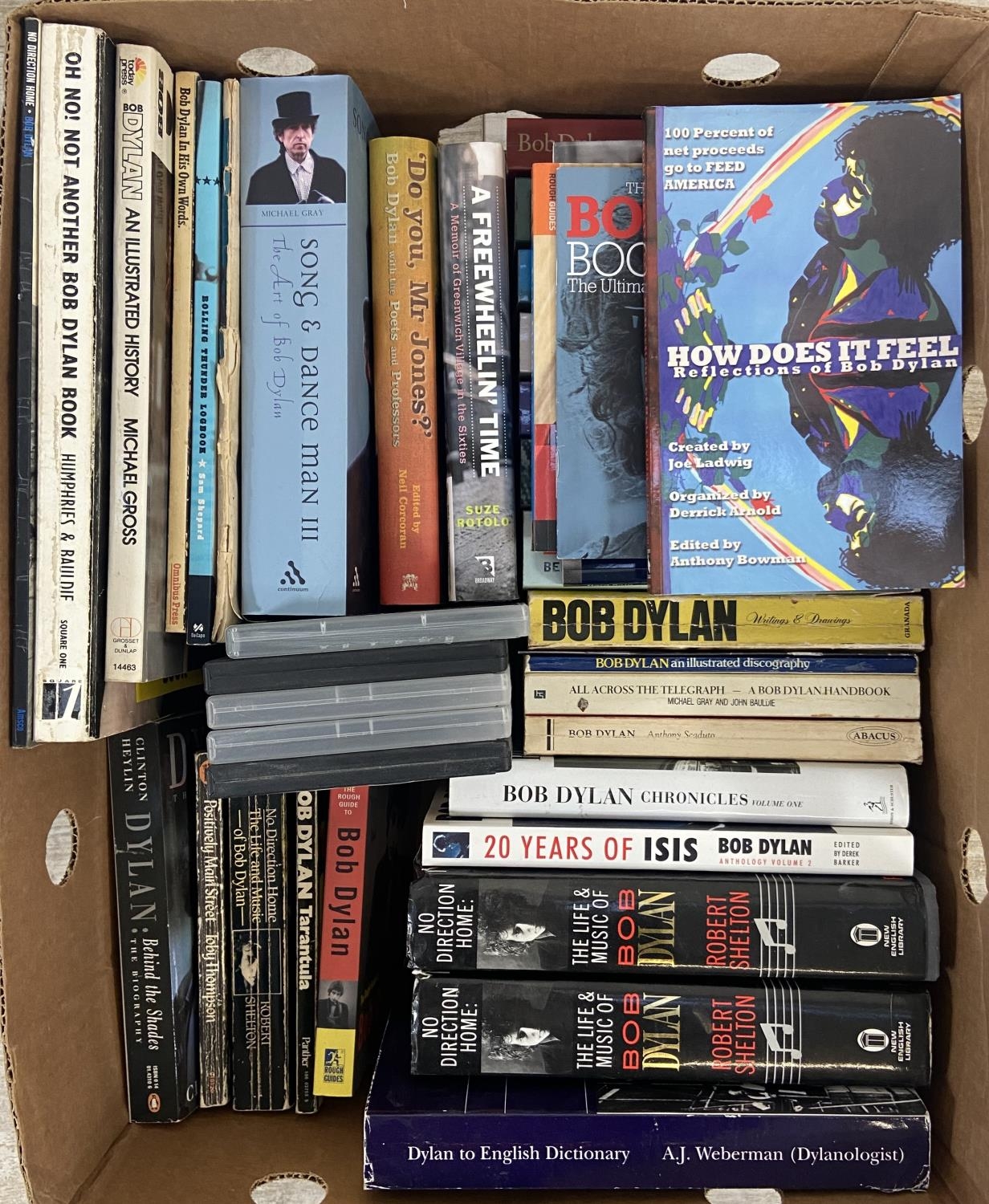 One box containing thirty three books and five DVDs all relating to american singer songwriter Bob Dylan.