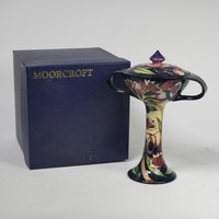 A Moorcroft Pottery ‘Queen of the Night’ pattern Vase, by Anji Davenport, dated 2001, for the ‘Moorcroft Collectors Club’, no. '101', impressed marks to base, signed ‘Anji Davenport’, 12cm high, boxed.